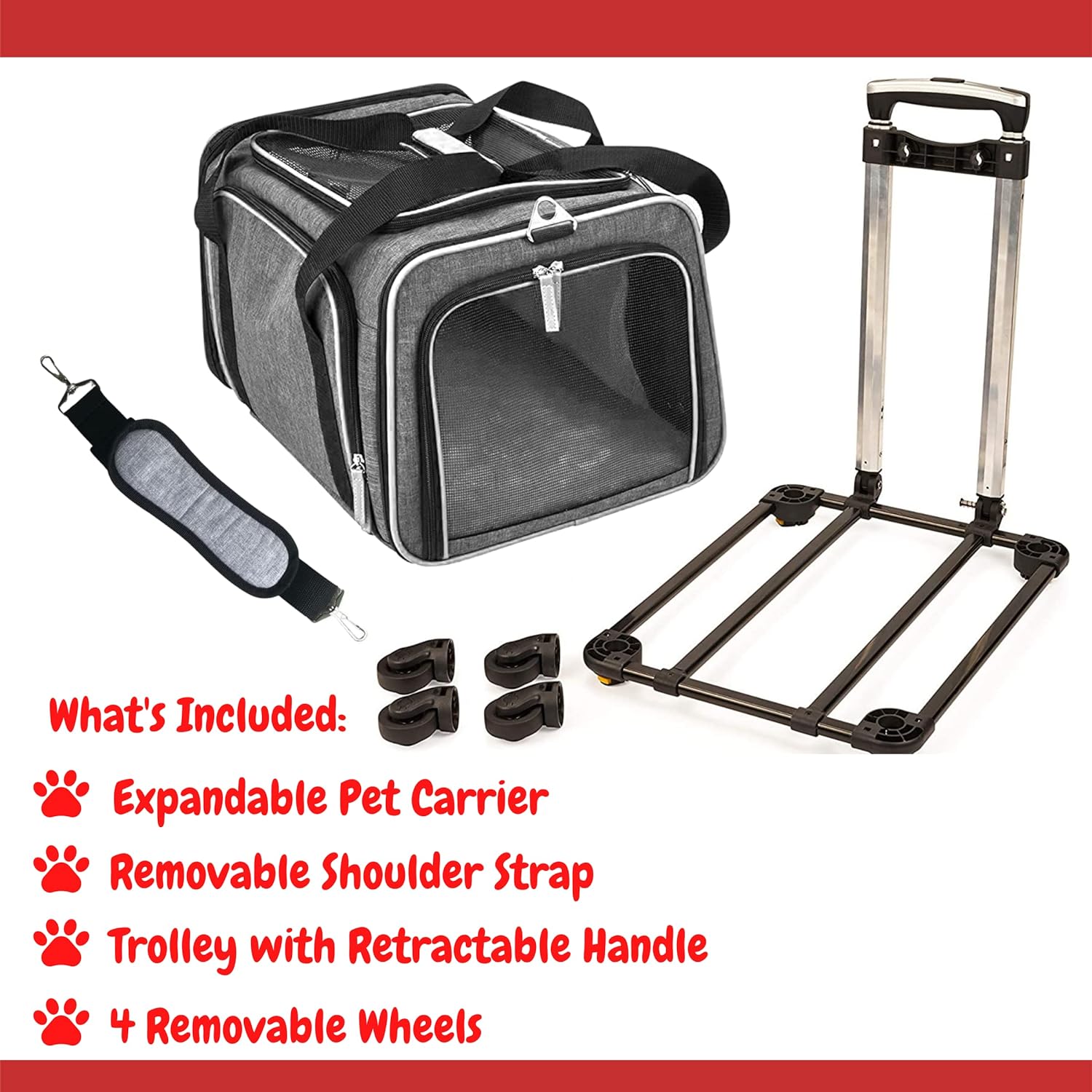 AIRLINE APPROVED: Designed to fit under the front cabin seat in major airline carriers (please check your airline rules and regulations before flying). The adjustable shoulder strap and handle allows you to secure the carrier to your suitcase for easy mobility while traveling. The expandable space allows your pet to lay down and relax during the car ride and under the airplane seat.