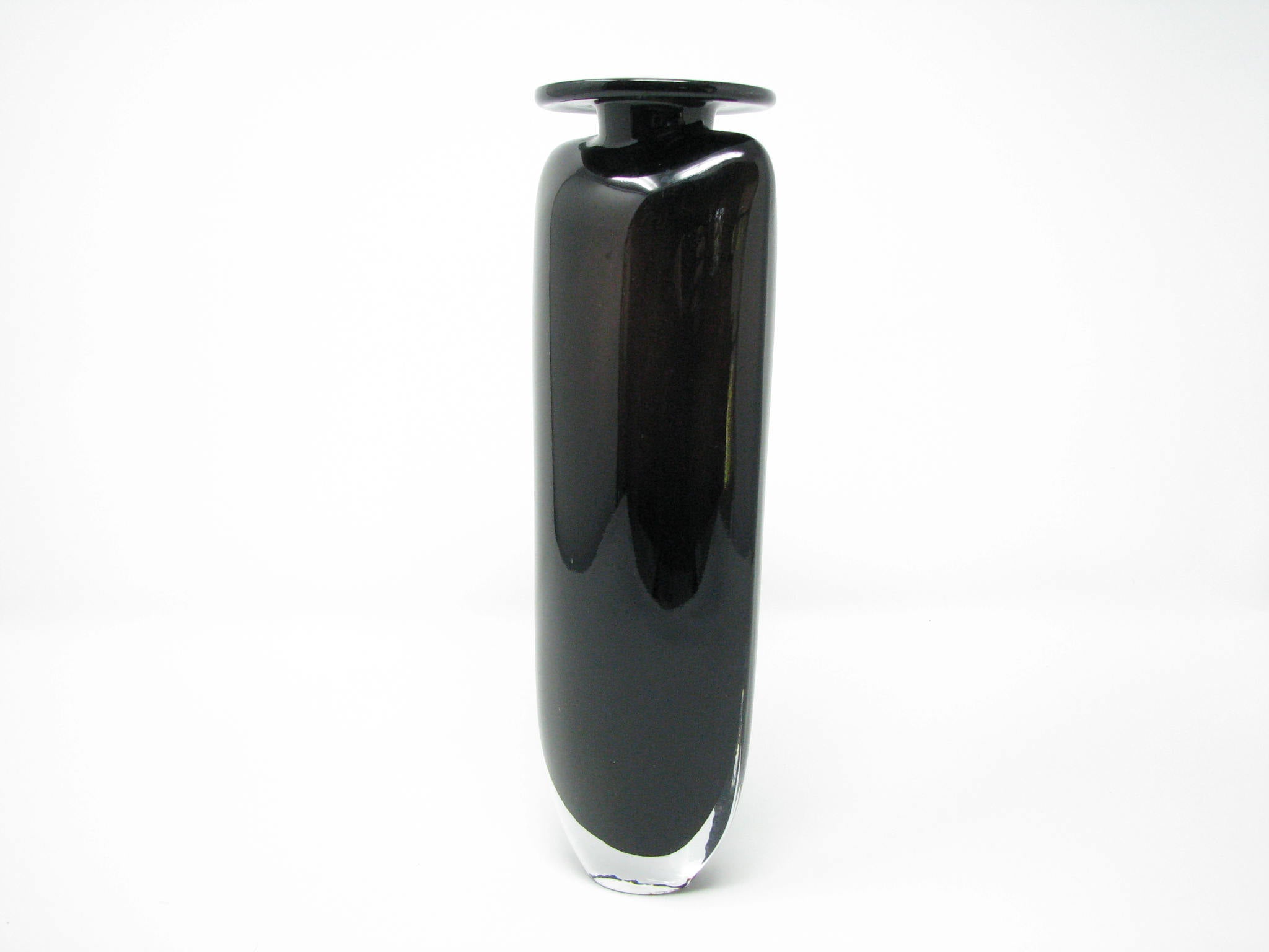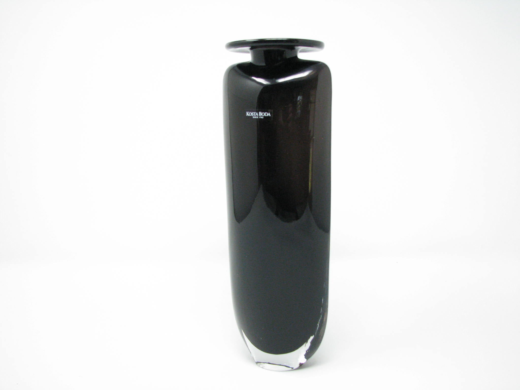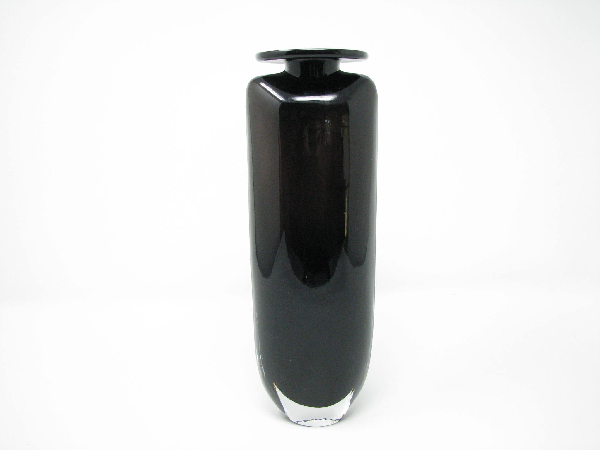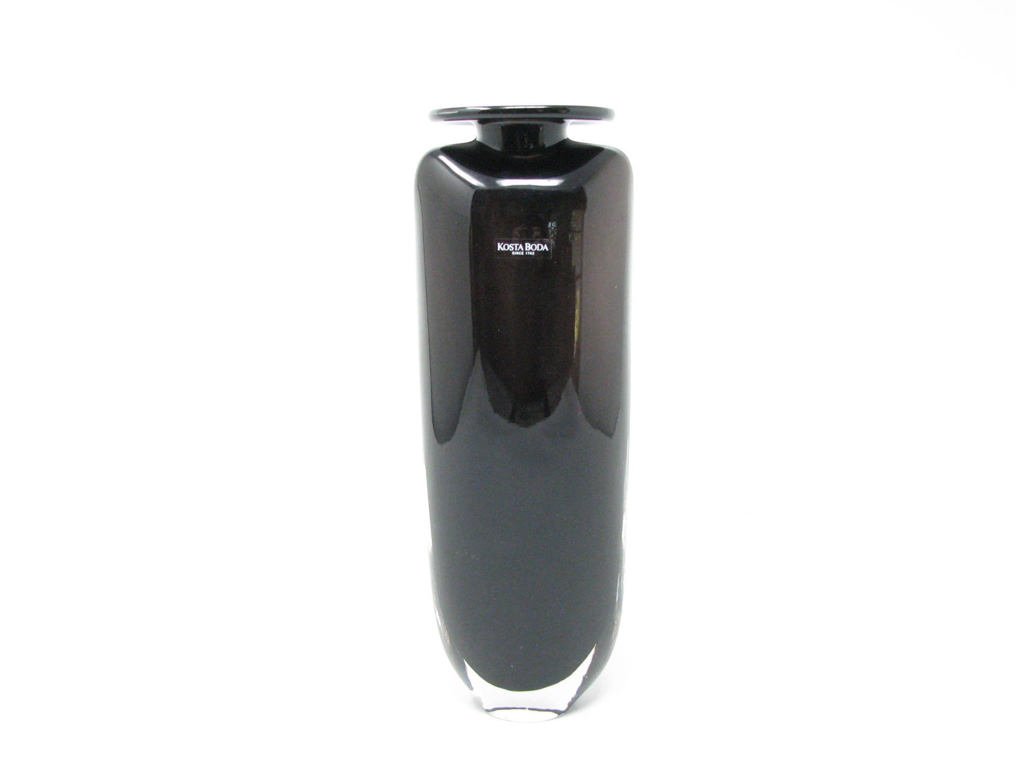 Vintage tall shoulder vase in dark amethyst designed by Kjell Engman for Kosta Boda, Sweden. Original Kosta Boda sticker, signed on bottom by artist.