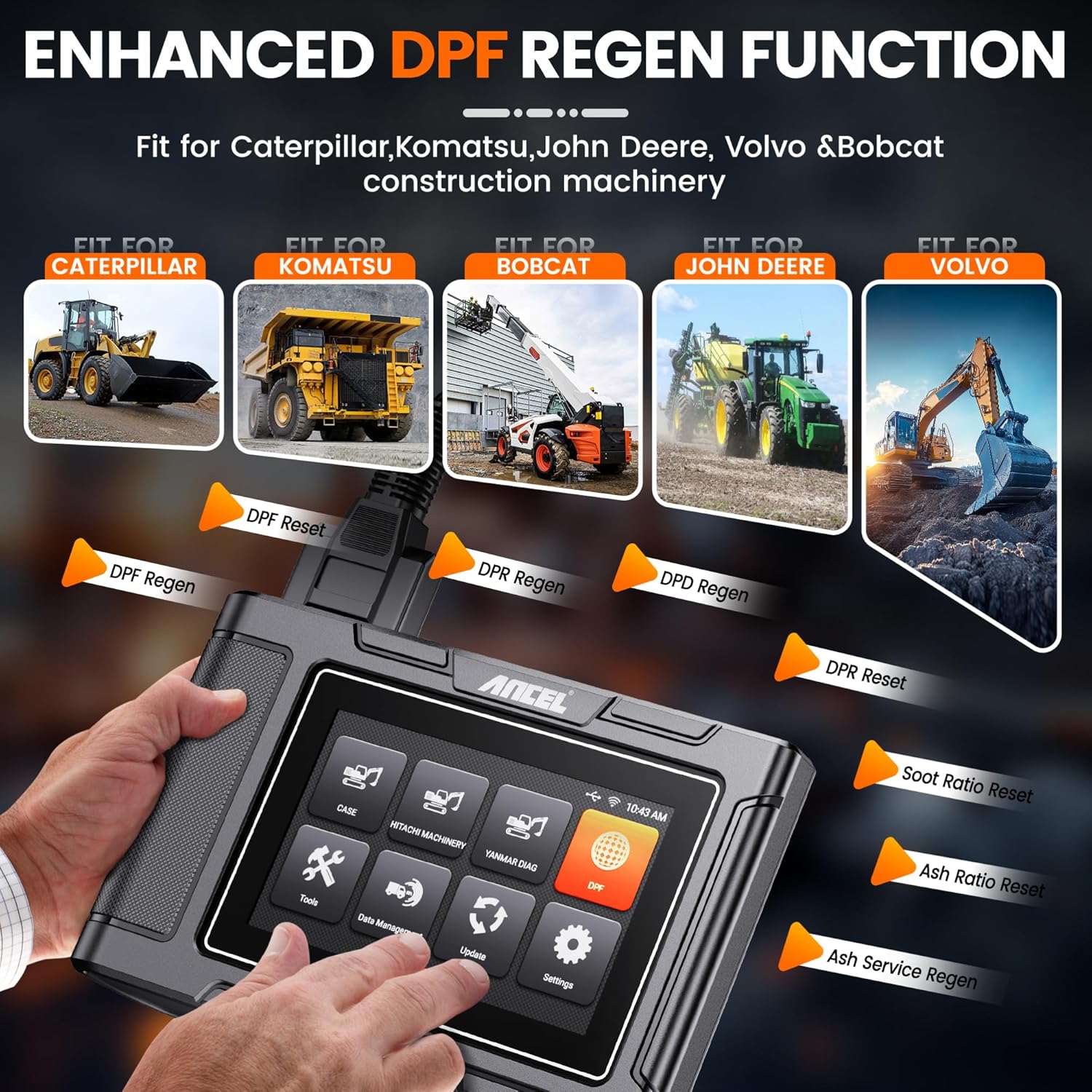 【Powerful DPF Regeneration Function】Supports exclusive OEM-level DPF functions for Caterpillar, John Deere, Volvo, Komatsu, and Bobcat. This includes DPF reset, DPF forced regeneration, soot ratio reset, and ash ratio reset. If you are unsure of compatibility, you can provide the vehicle make/model/year and we will verify it for you