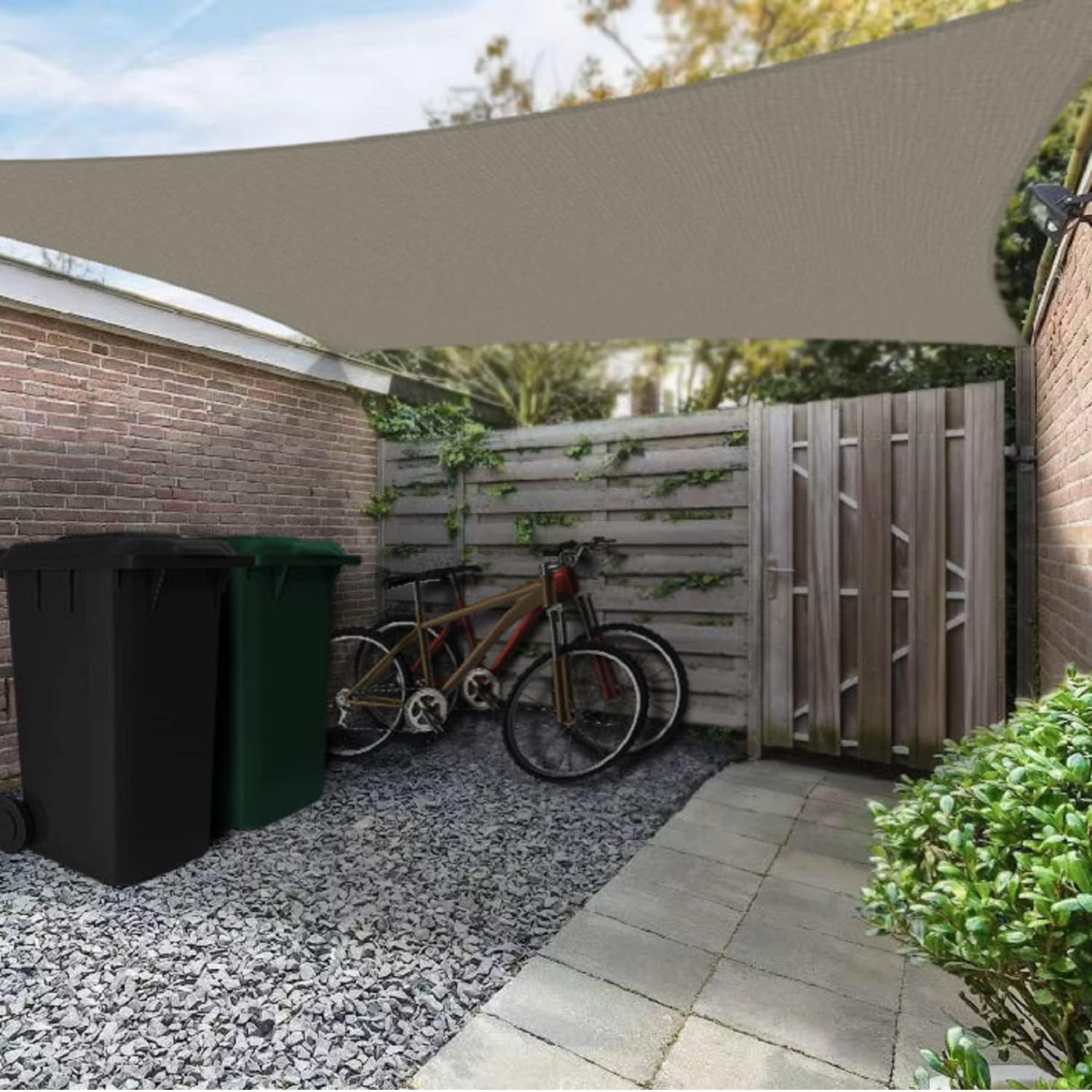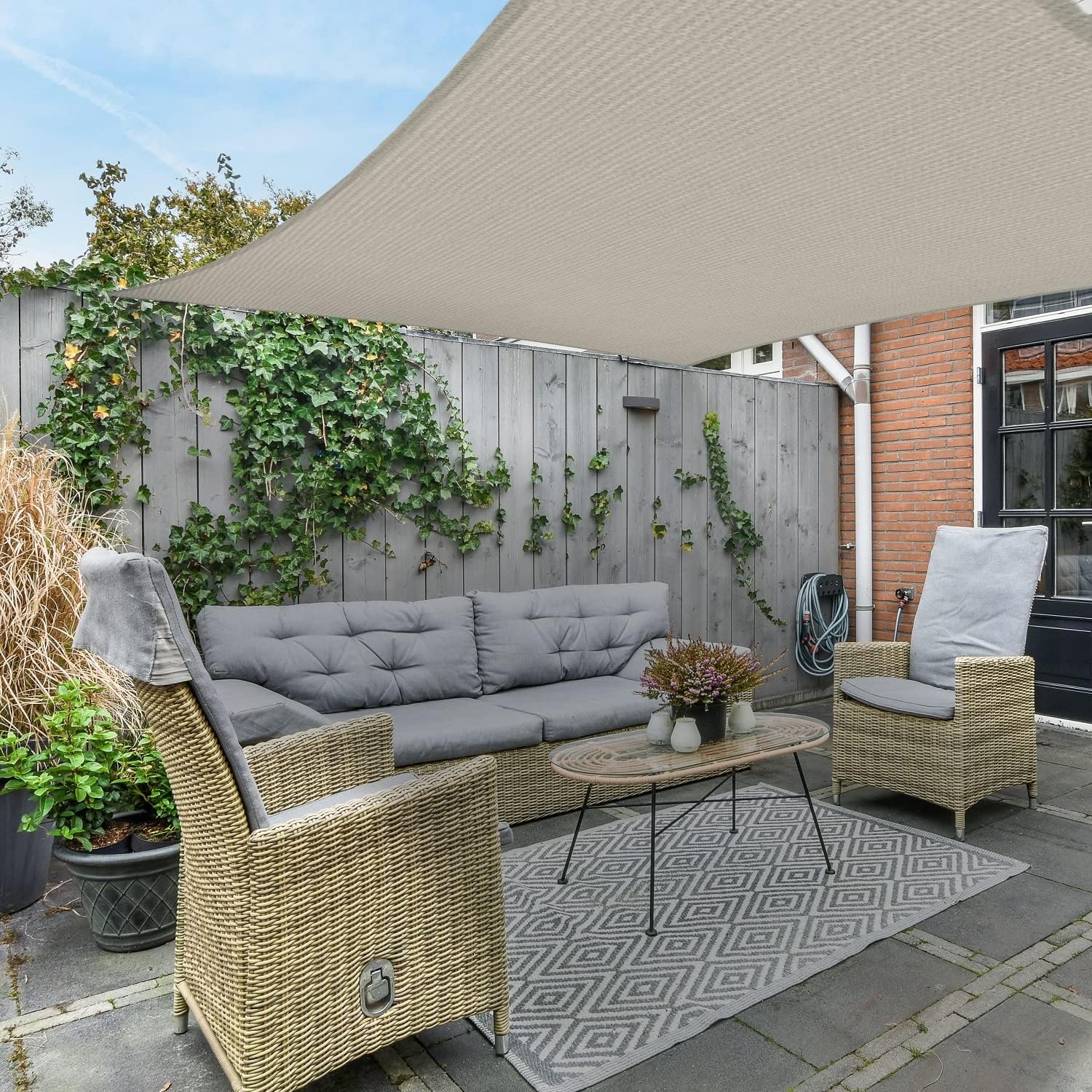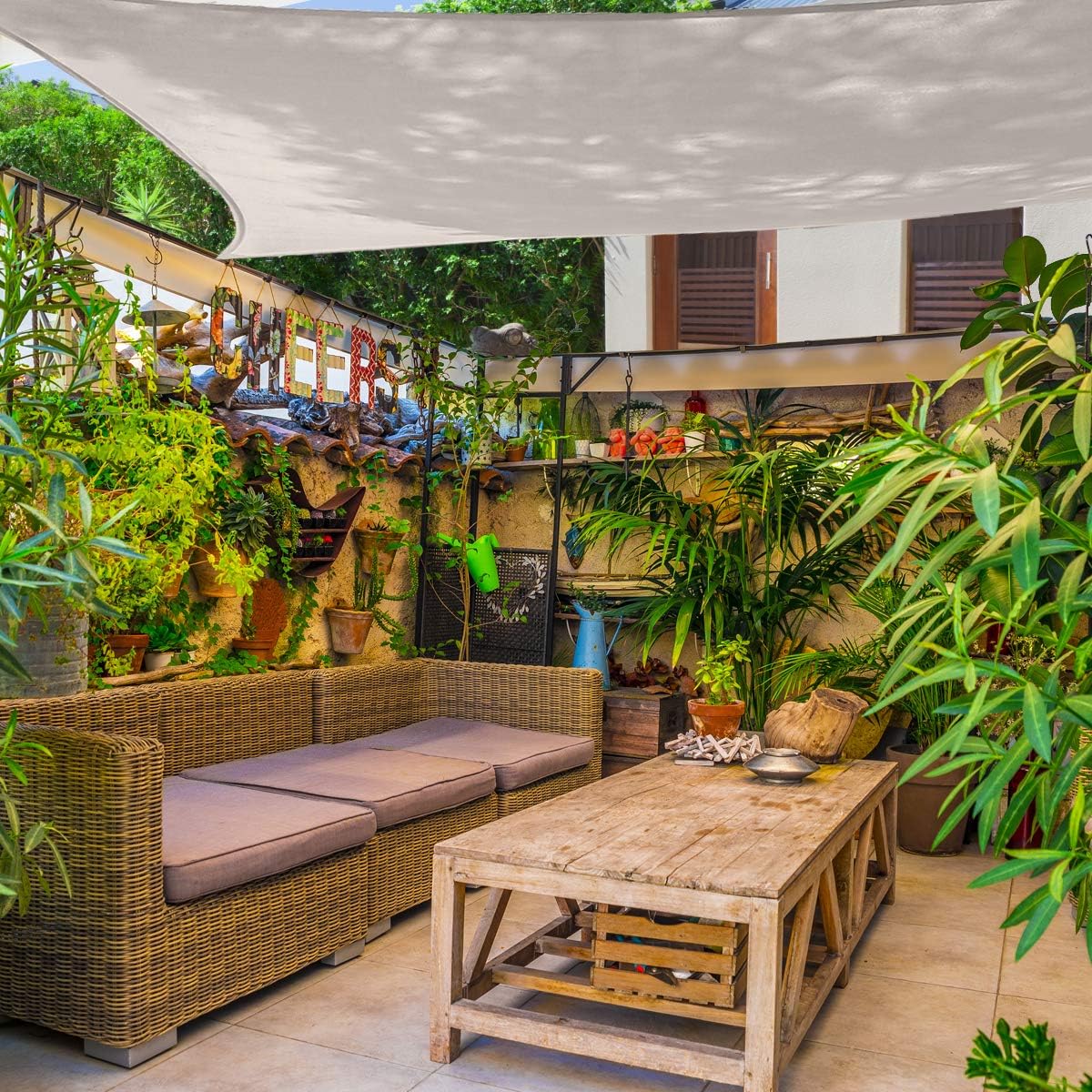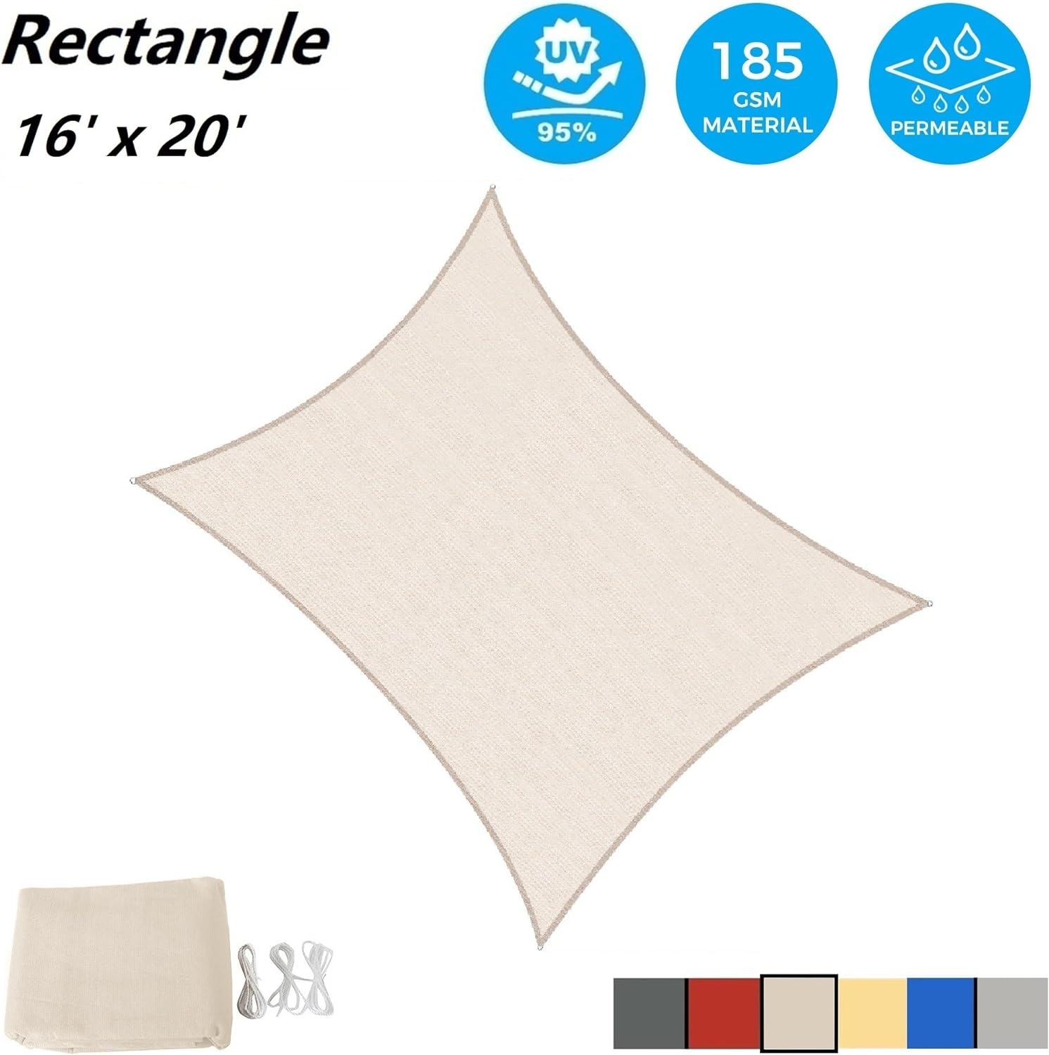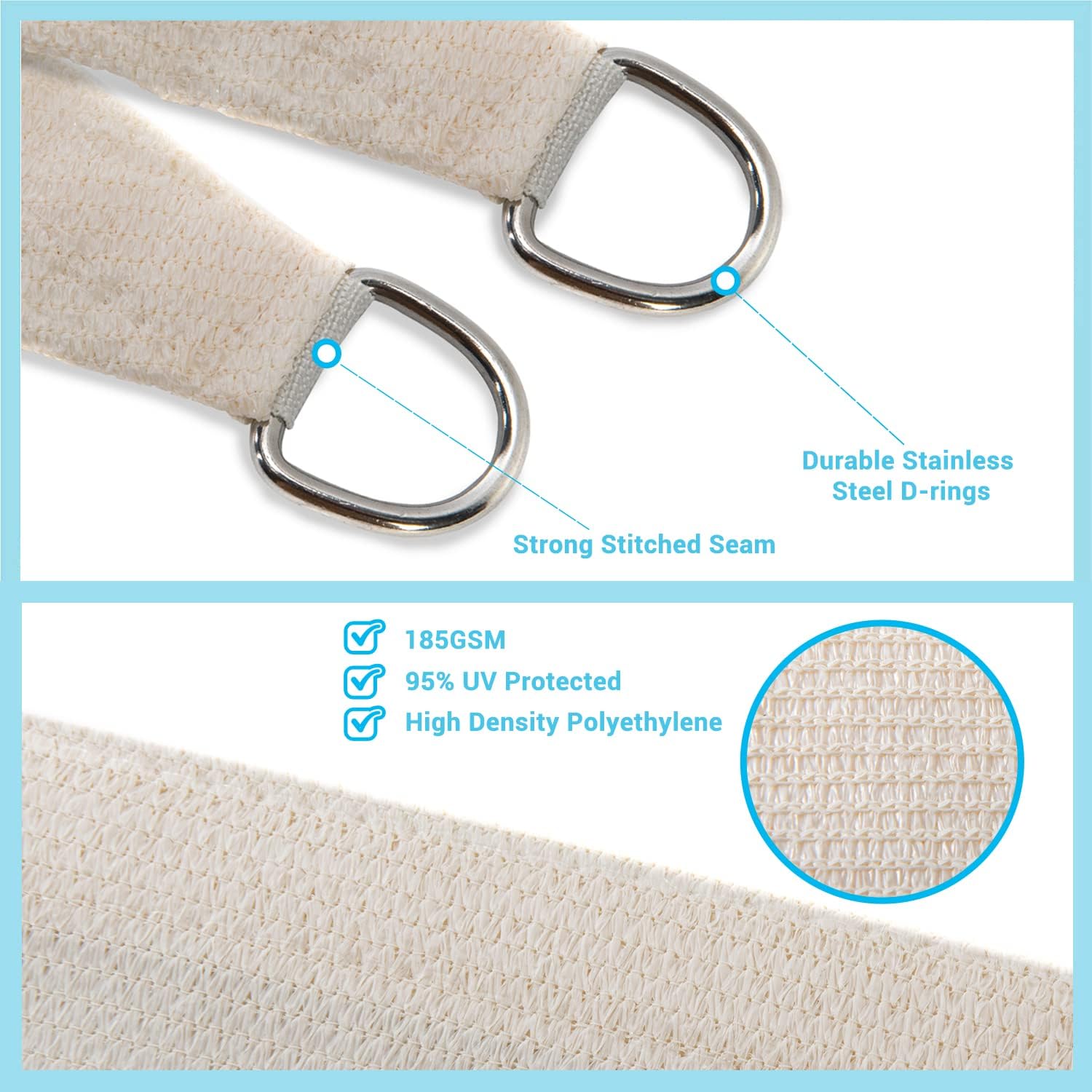 High Quality - The patio shade has 100% High Density 185GSM Polyethylene fabric, with strong stitched seams and durable stainless steel D-rings. The fabric is breathable and 95% UV block, allowing air and light to pass through for a more comfortable space. This sail shade also comes along with sturdy polyethylene ropes