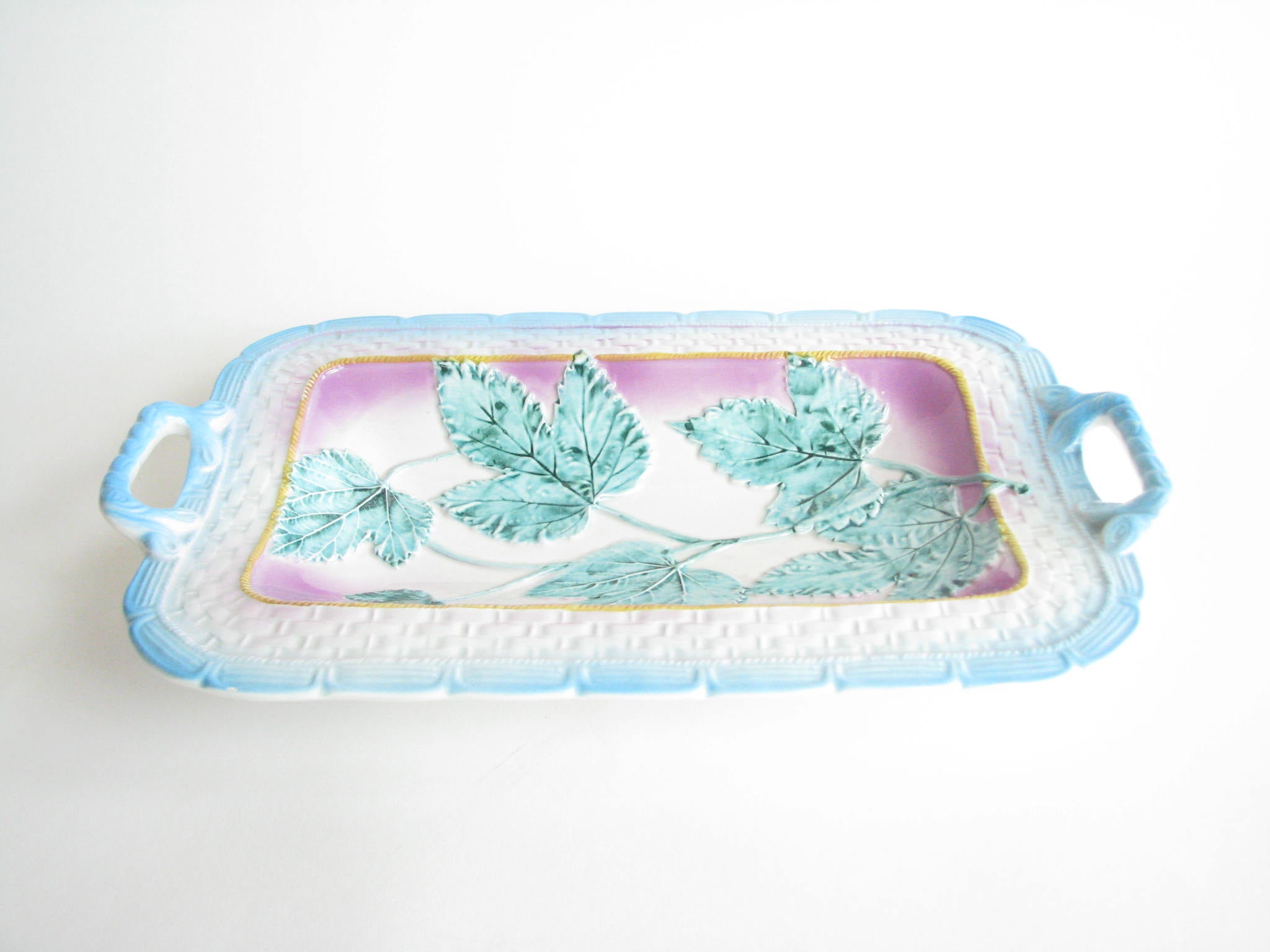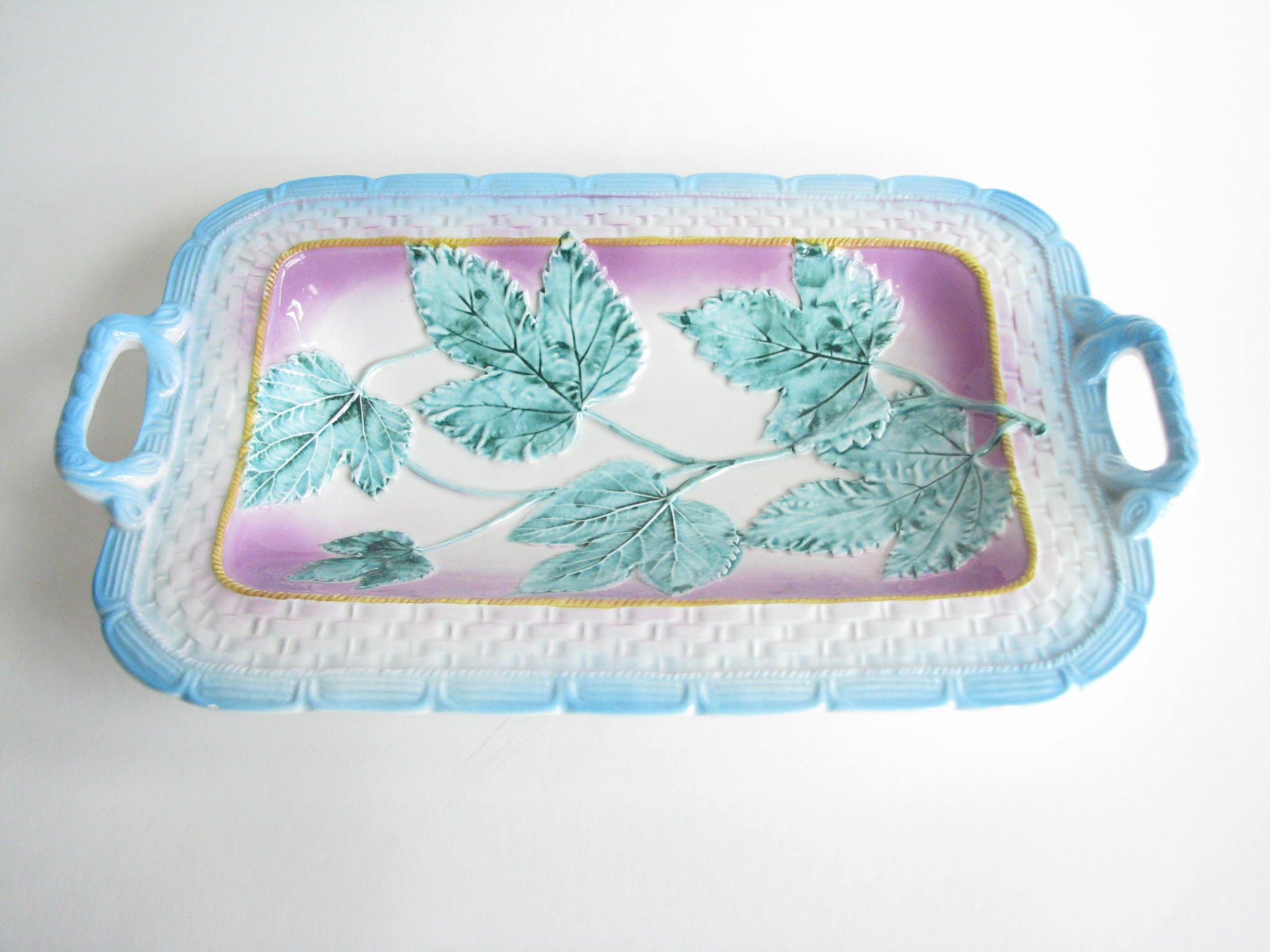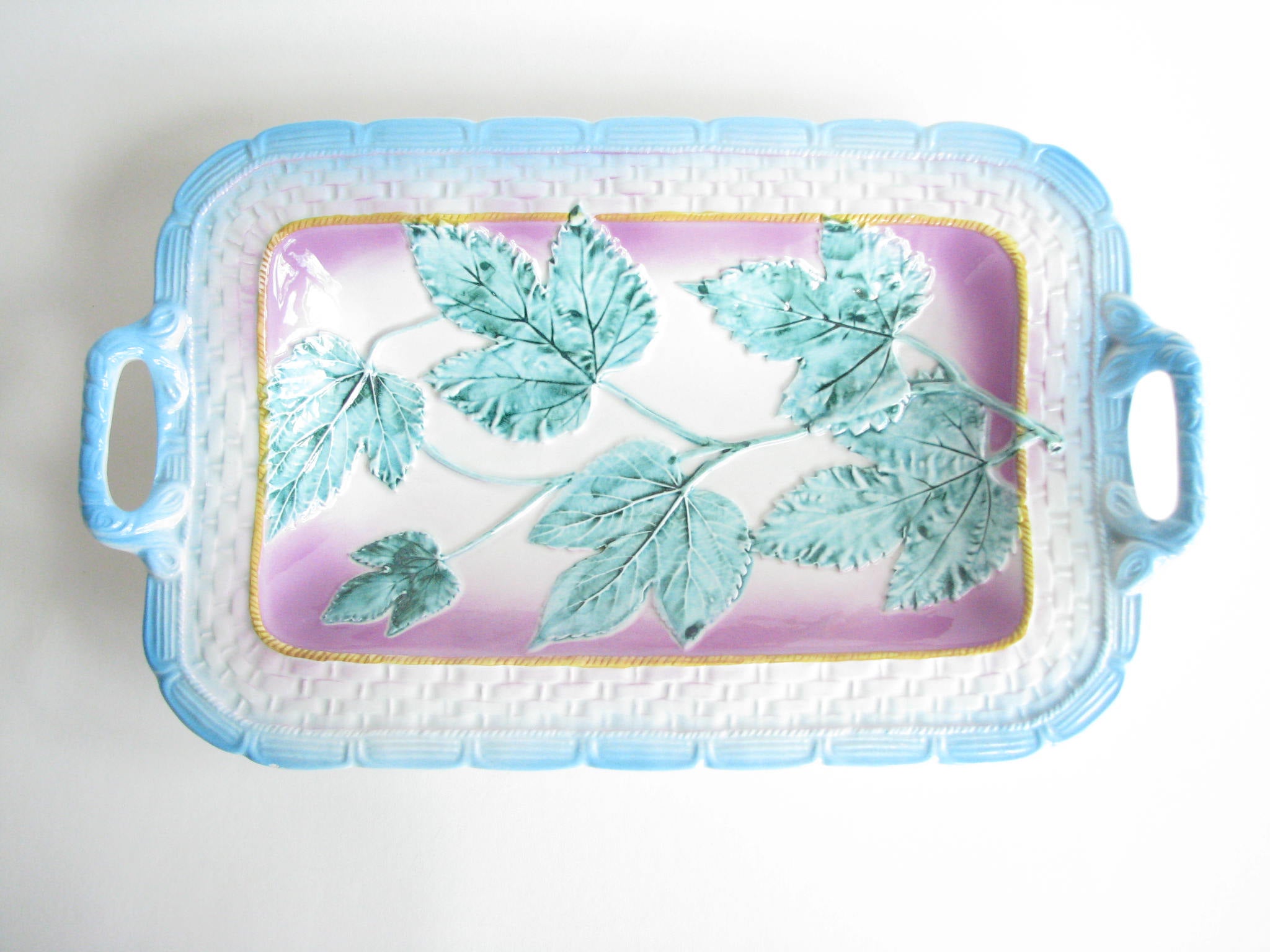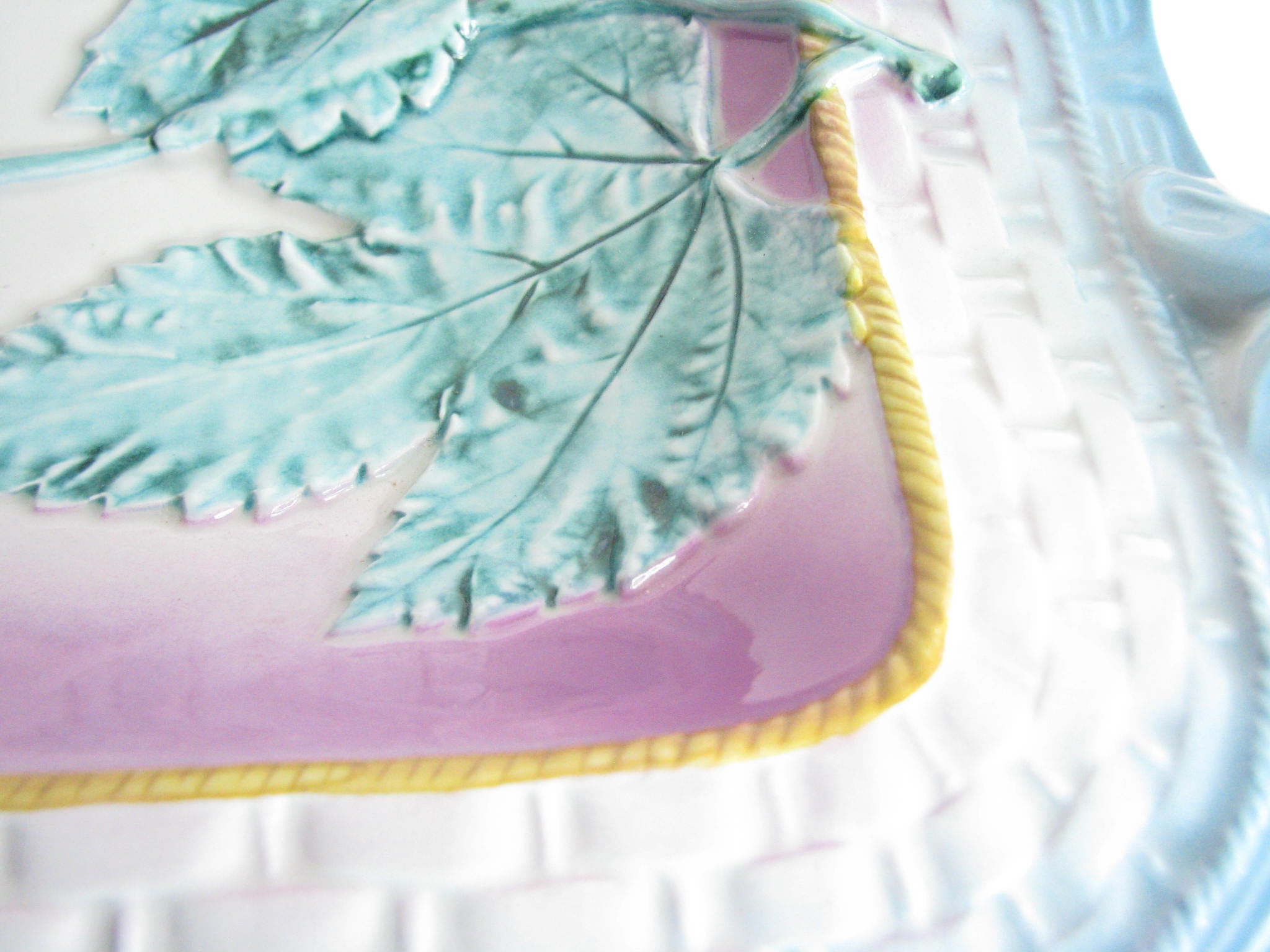 Vintage Ethan Allen Italian majolica / ceramic serving dish or platter with stunning colors and large leaf design.