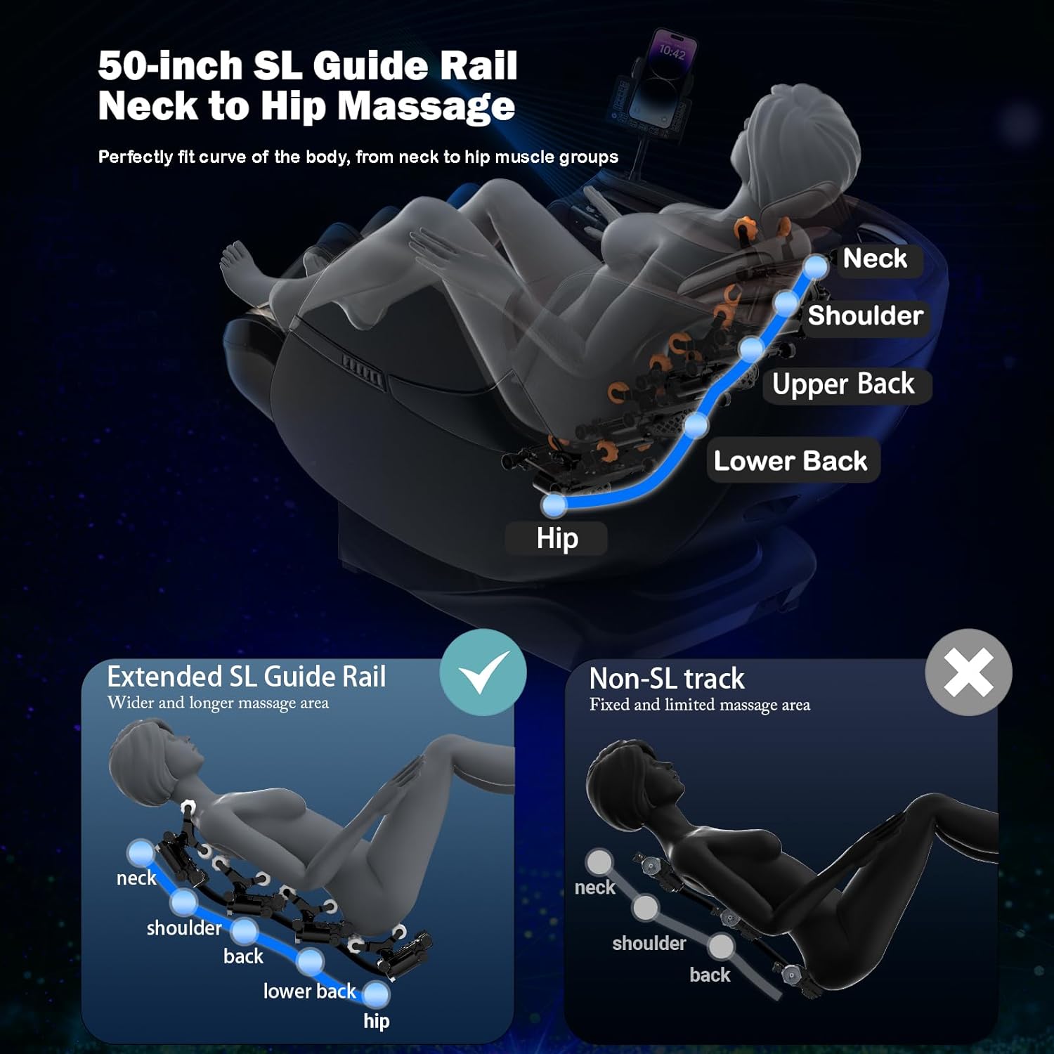 𝗭𝗲𝗿𝗼 𝗚𝗿𝗮𝘃𝗶𝘁𝘆 + 𝟳 𝗠𝗮𝘀𝘀𝗮𝗴𝗲 𝗧𝗲𝗰𝗵𝗻𝗶𝗾𝘂𝗲𝘀 - This massage chair features a 50-inch SL track and offers 7 distinct massage techniques, including tuina/scraping, kneading, percussion, shiatsu, tapping, Thai stretching, and airbag compression. It provides comprehensive relaxation from your neck to your hips. Additionally, the zero-gravity mode elevates the overall massage experience. Our massage chair allows manual adjustment of the chair's recline, catering to your diverse needs. Whether you want to watch TV on the massage chair or take a brief nap during the massage, your preferences can be met with satisfaction