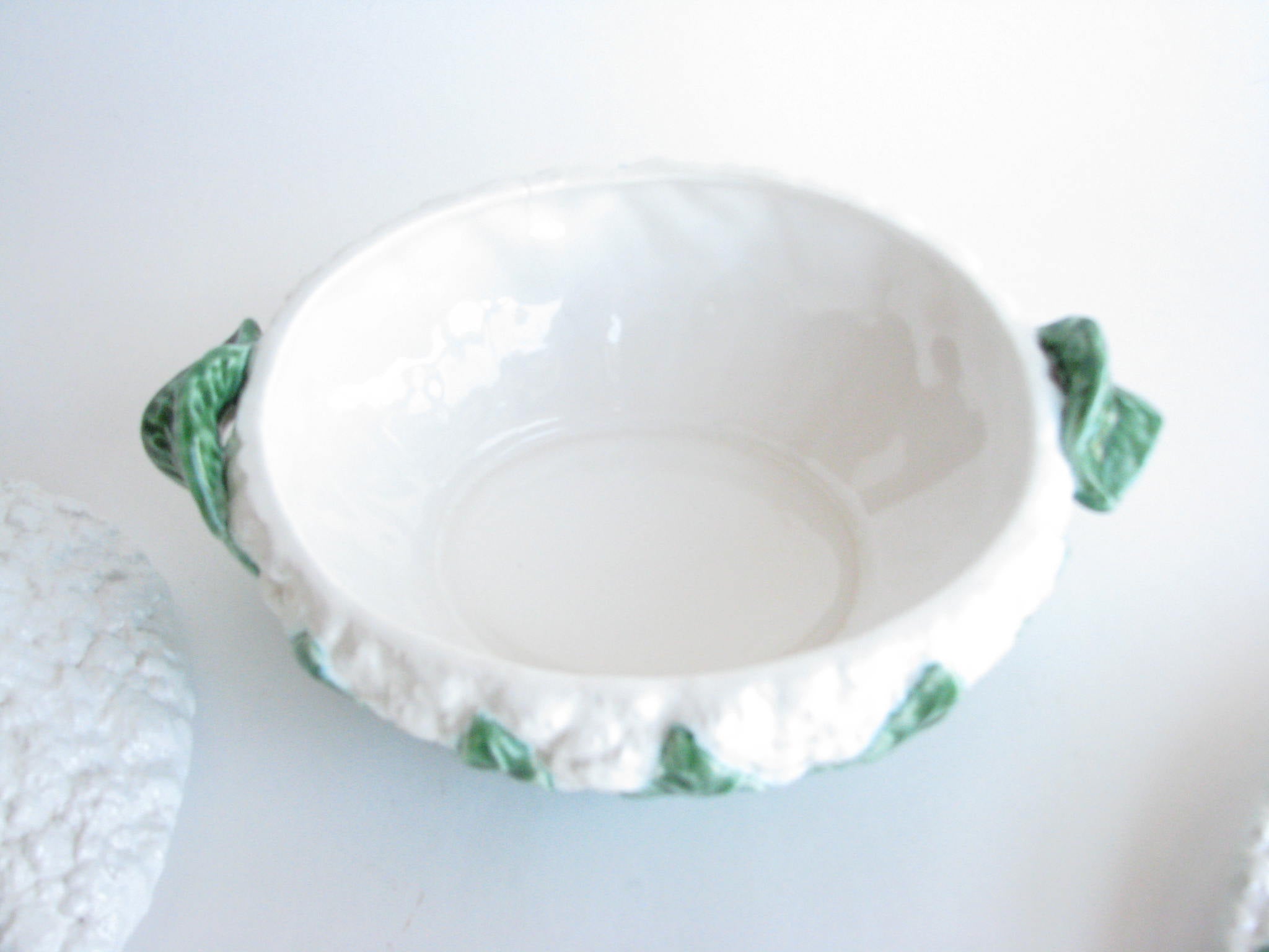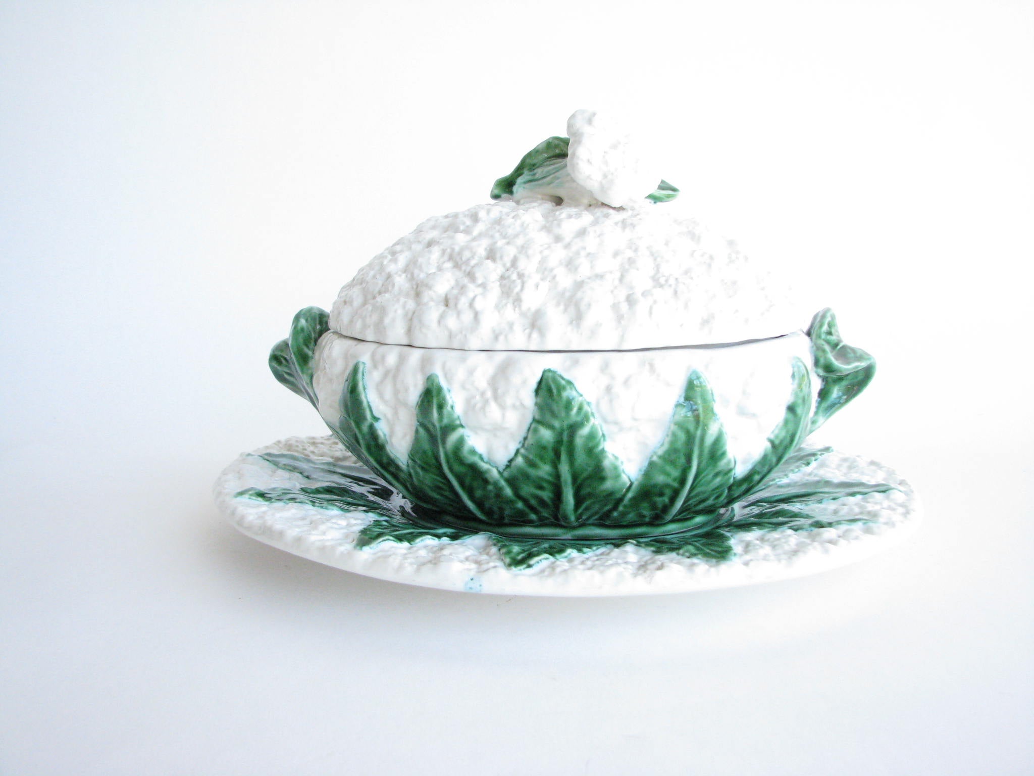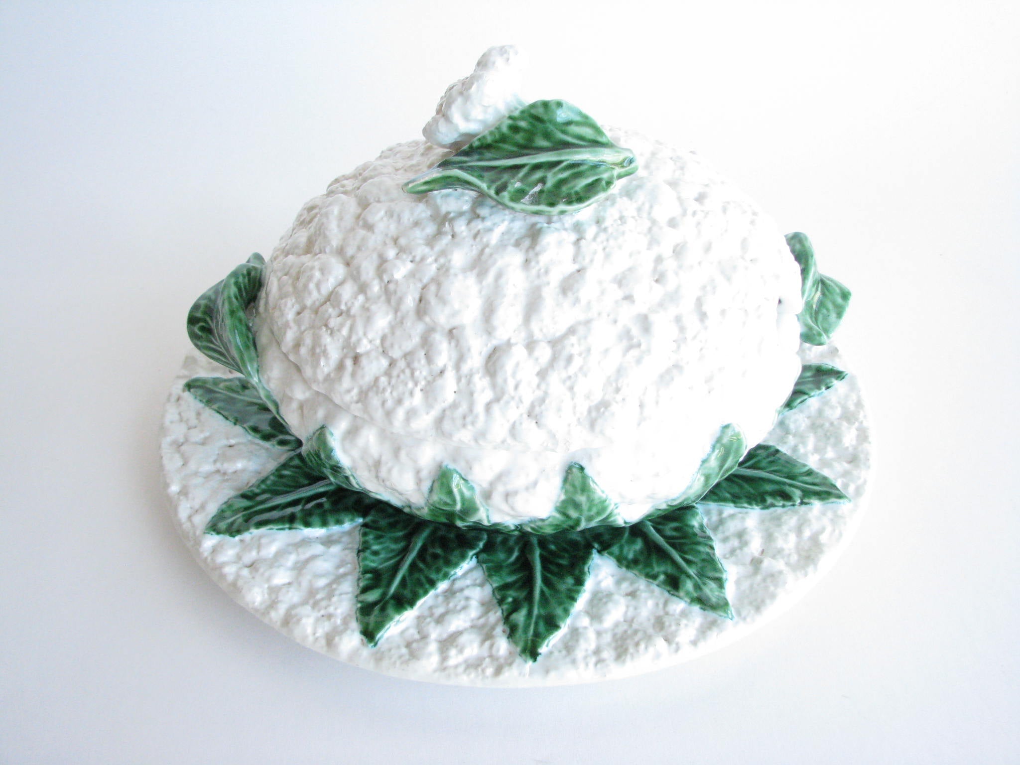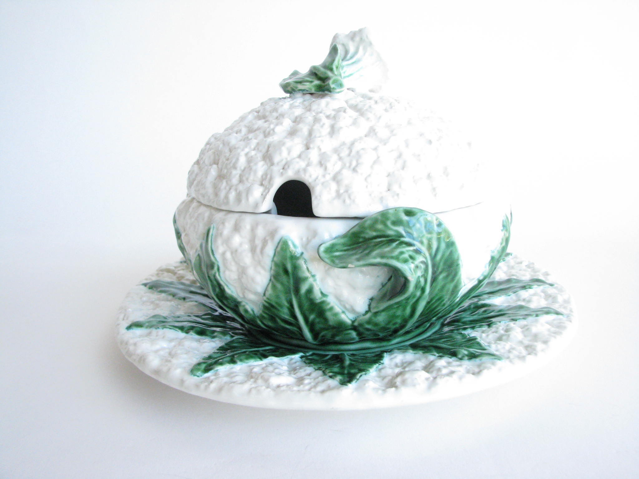 Vintage faience / majolica cauliflower shaped lidded soup tureen or serving dish made in Portugal.