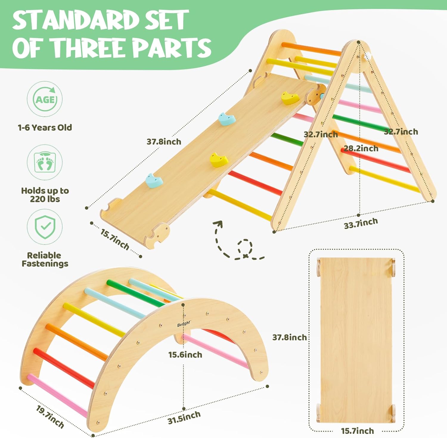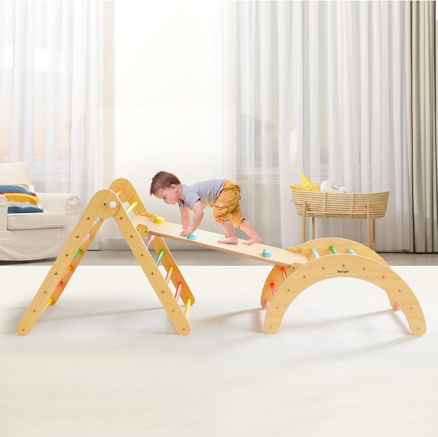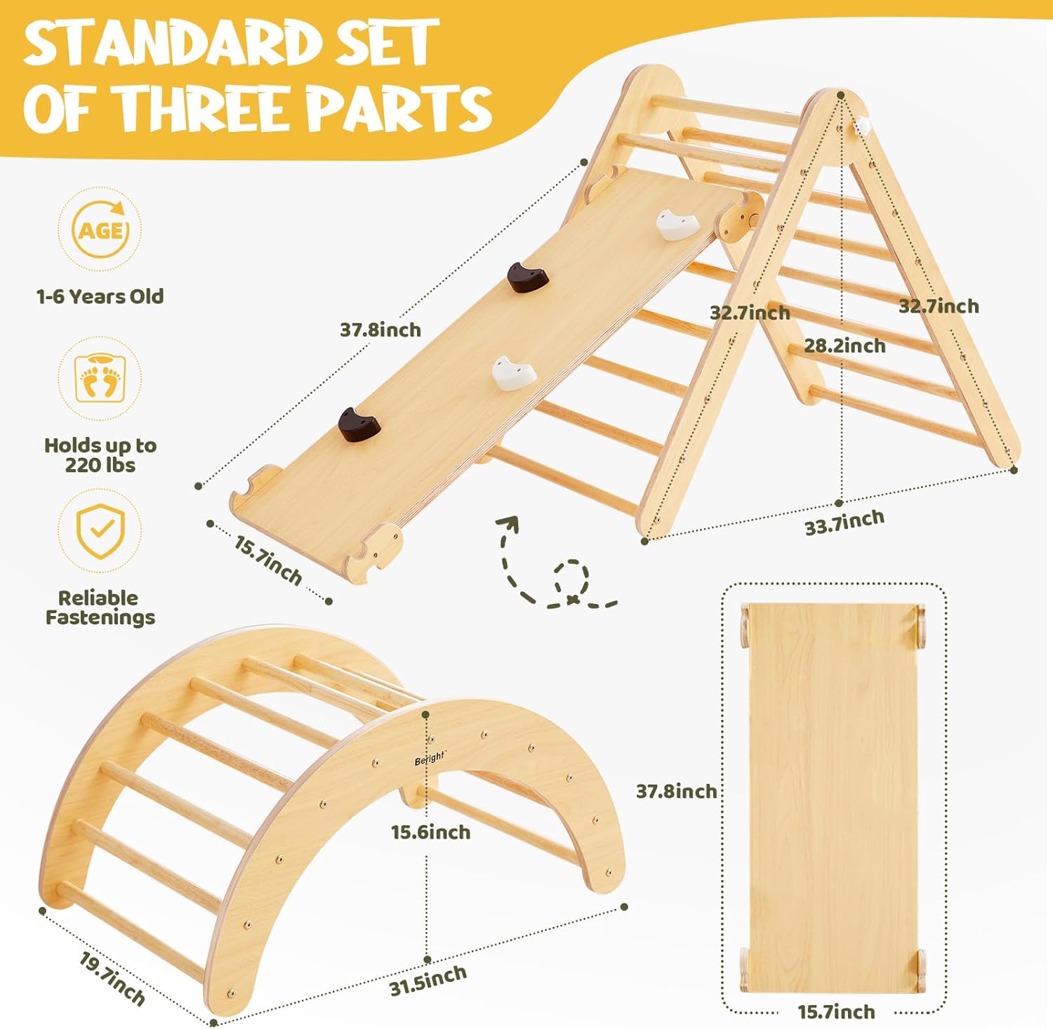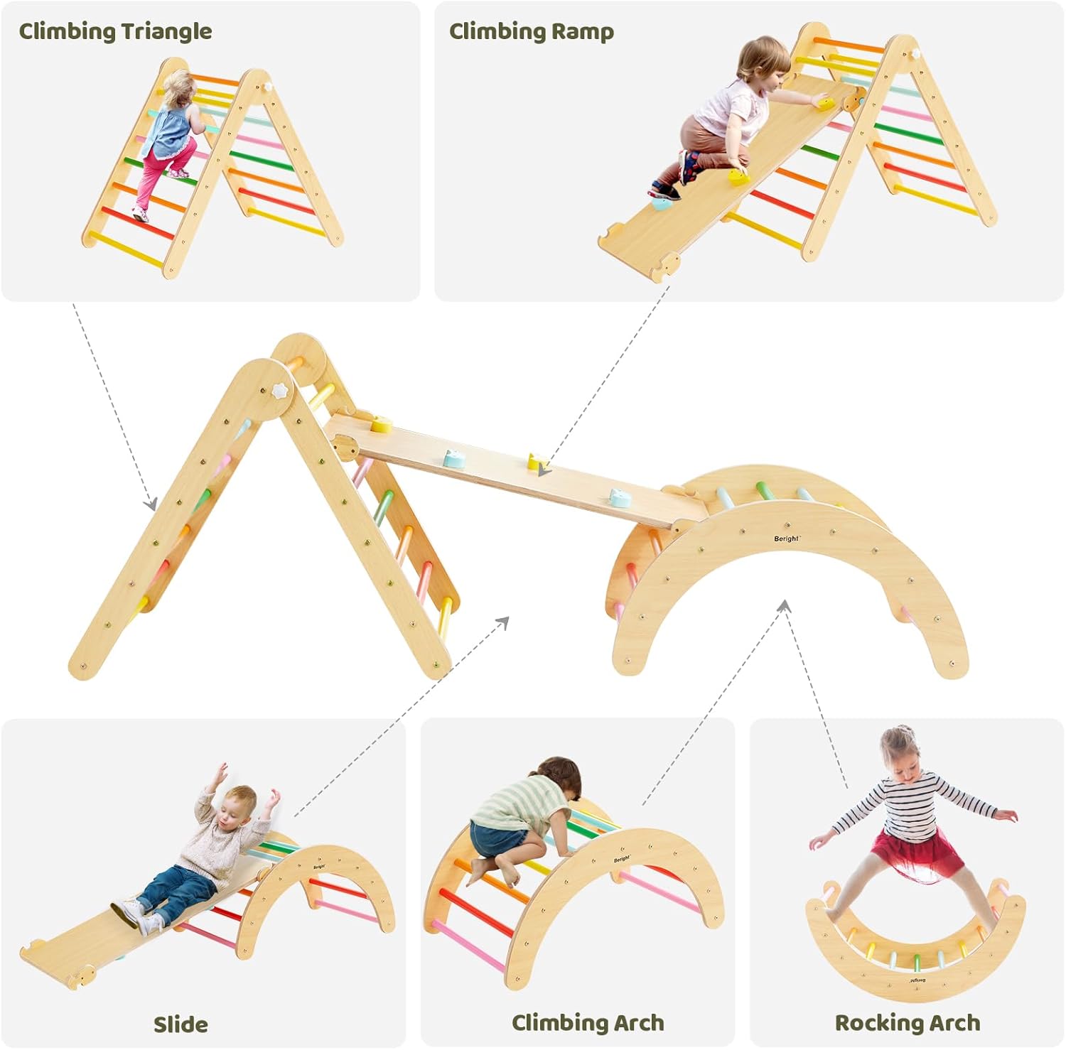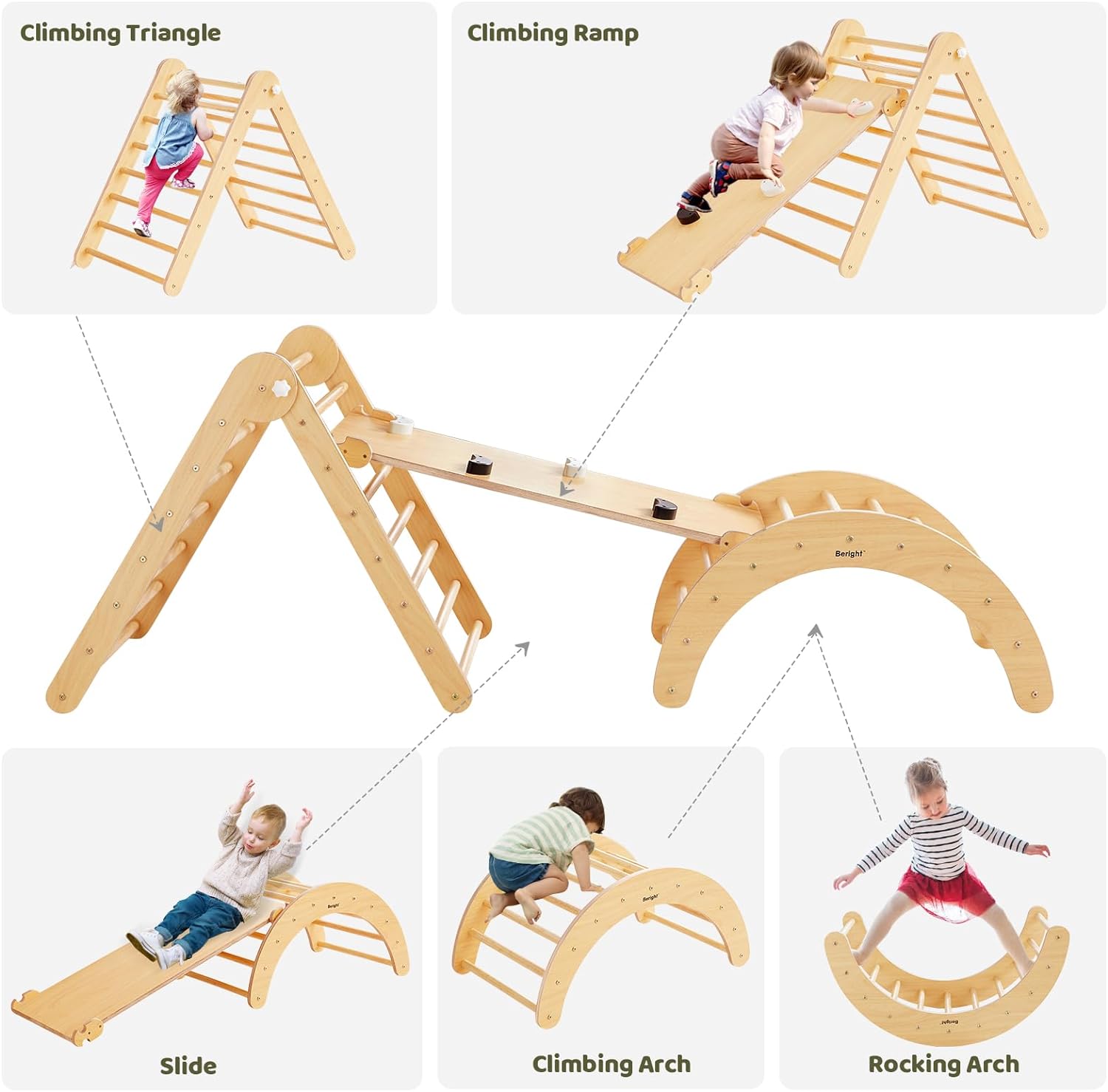 - UPGRADE 5 IN 1MONTESSORI INDOOR PLAYGROUND - Set includes a pikler triangle, one thick board and a climbing arch. The thick board is desinged with two sides, which can be used as a climbing board and slide board. Our climing struture can become a castle,a car garage, a teepee or anything else their imaginations conjure.