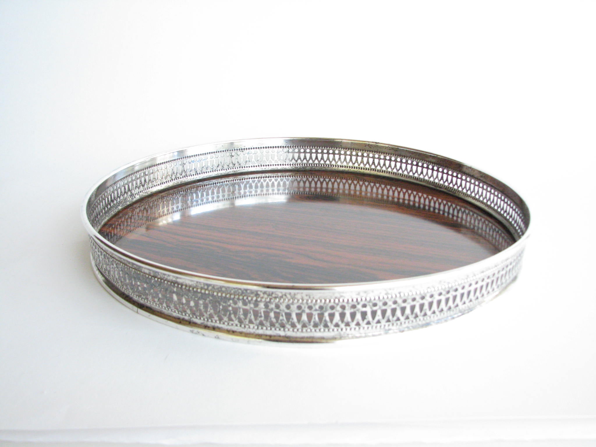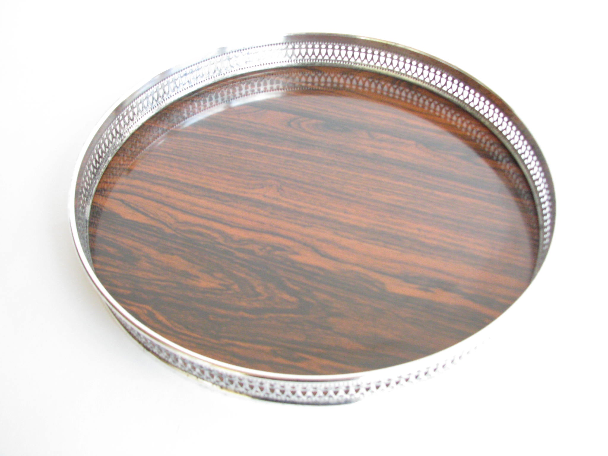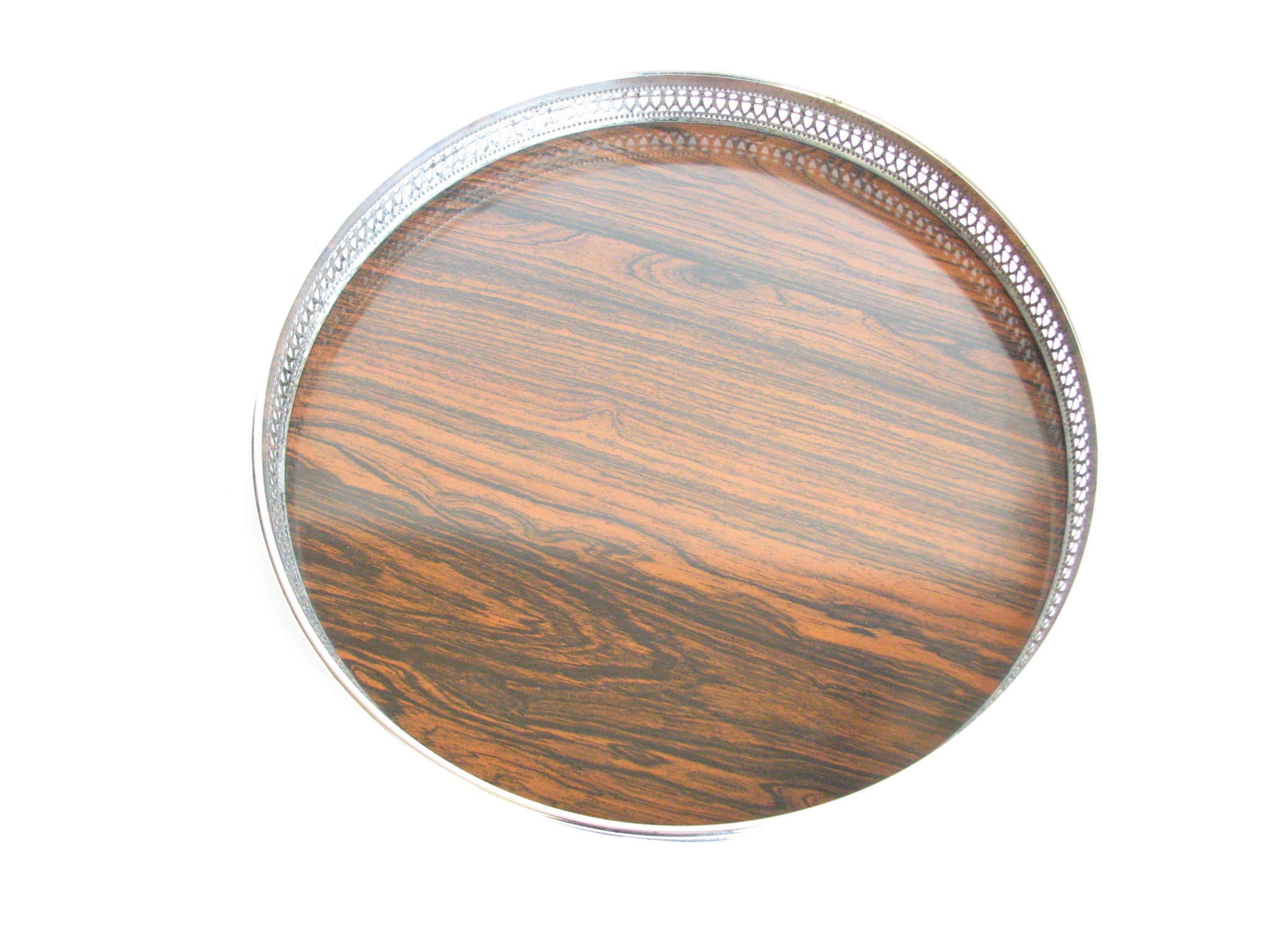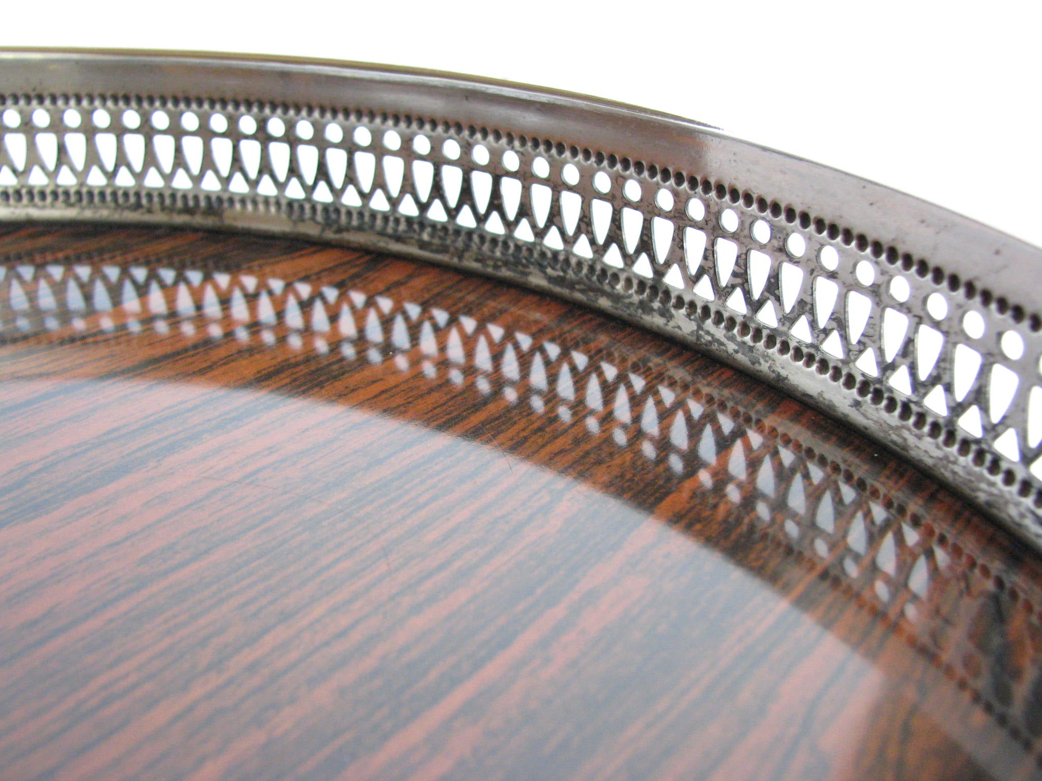 Vintage Formica brand laminate serving tray with Sheffield Silver Company reticulated silver plate gallery. Laminate is rosewood. Dons original tag.