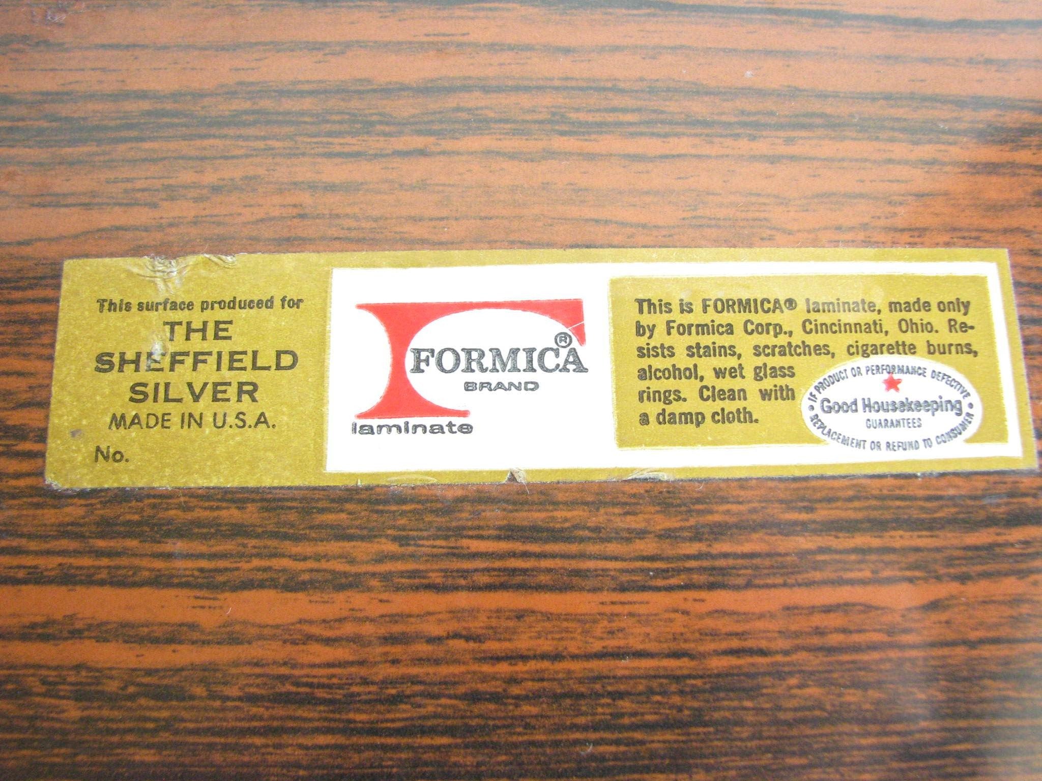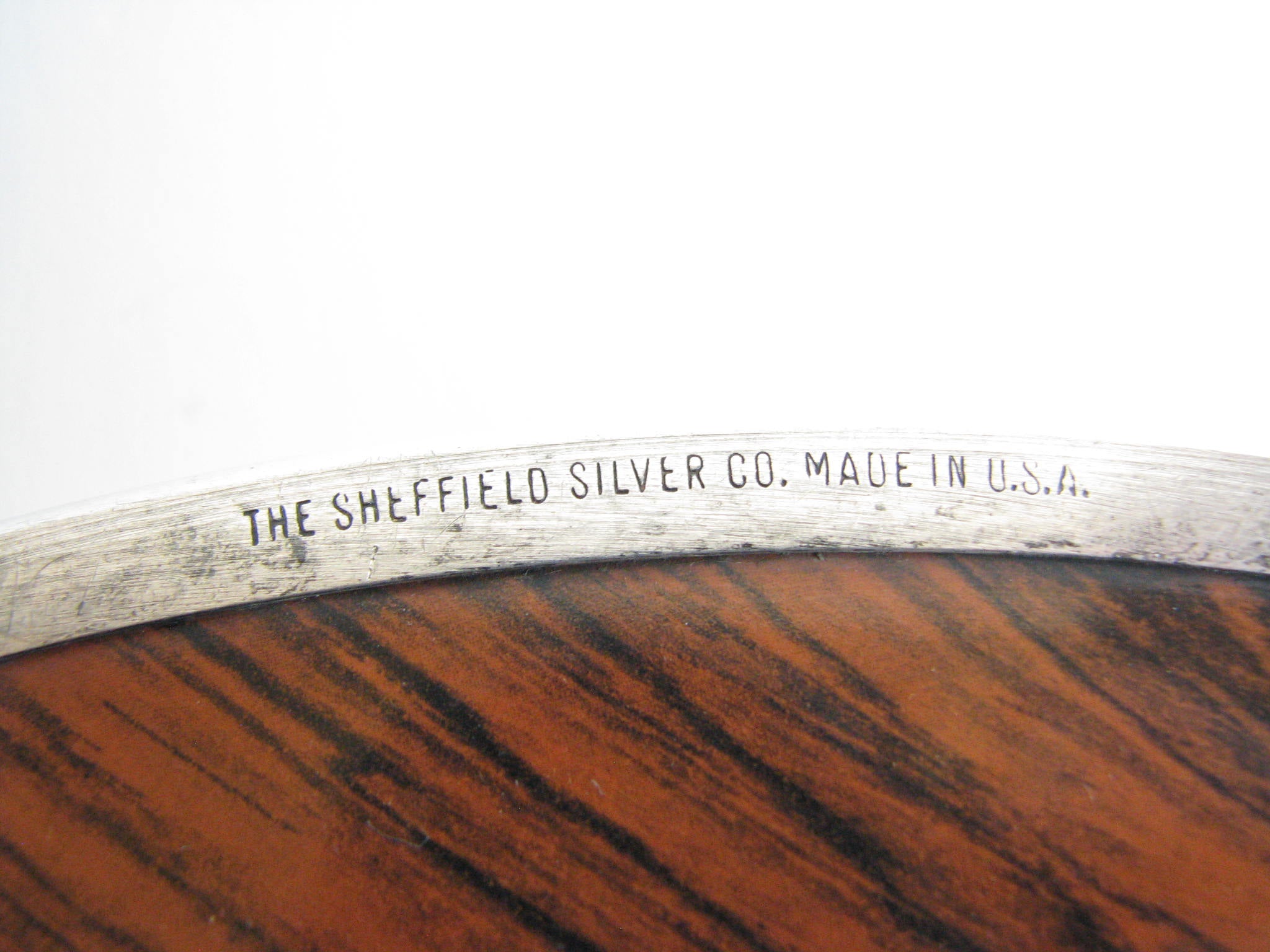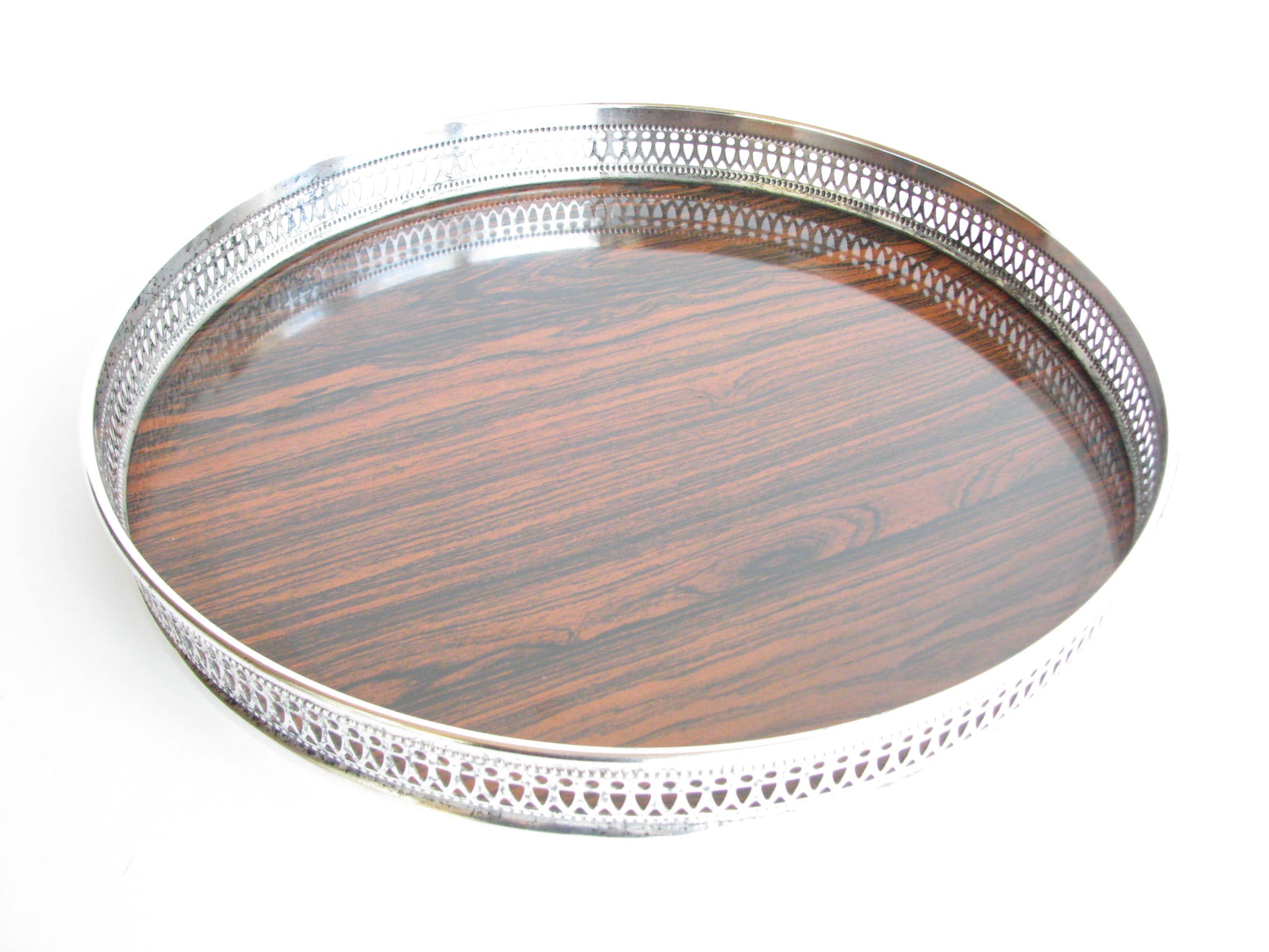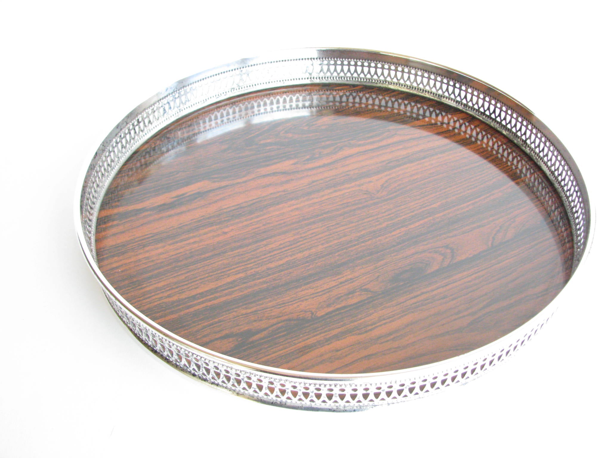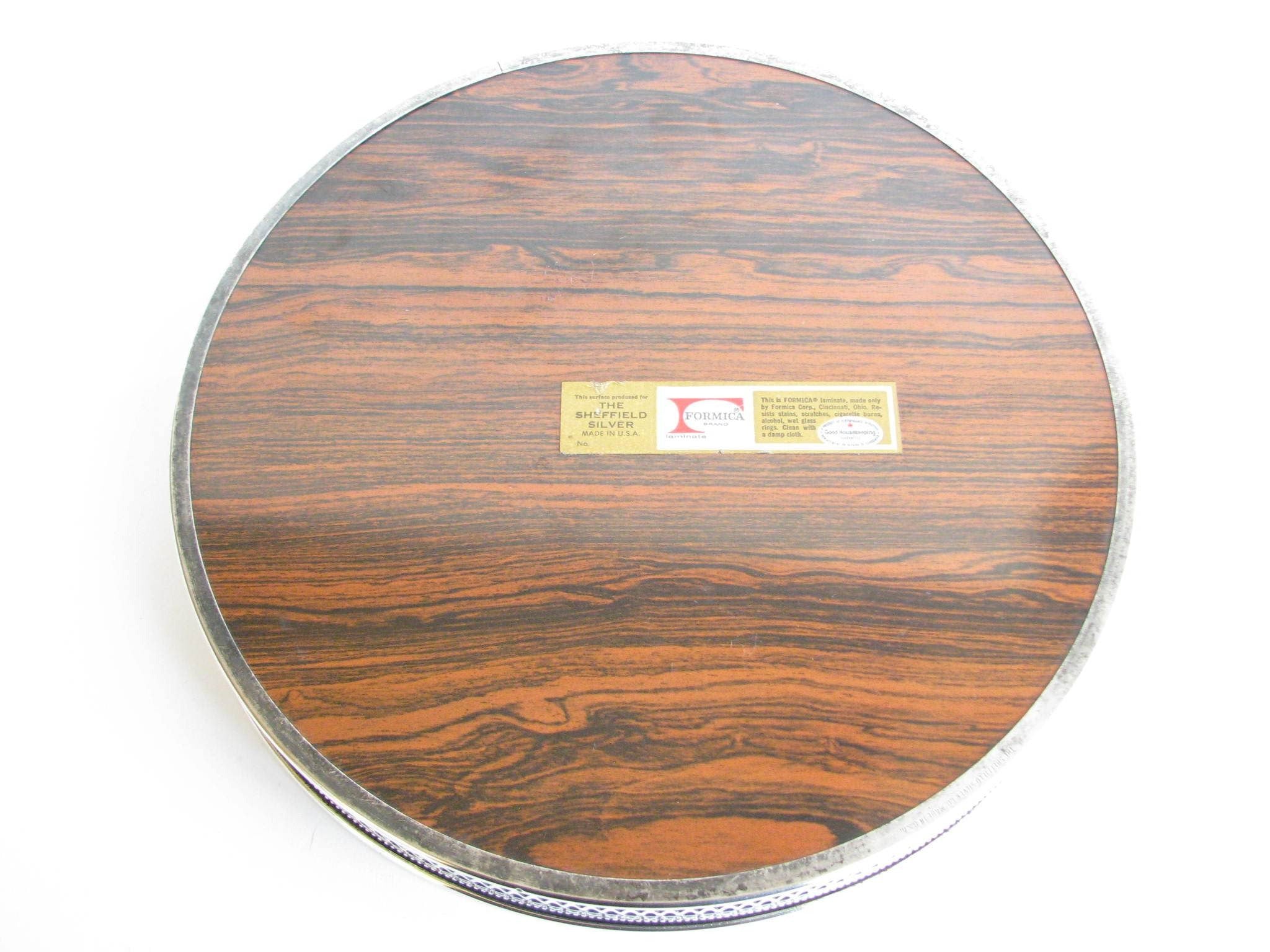Vintage Formica brand laminate serving tray with Sheffield Silver Company reticulated silver plate gallery. Laminate is rosewood. Dons original tag.