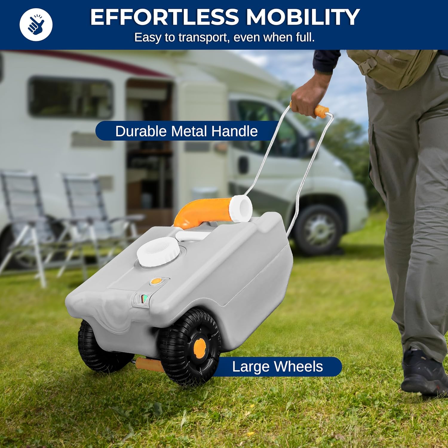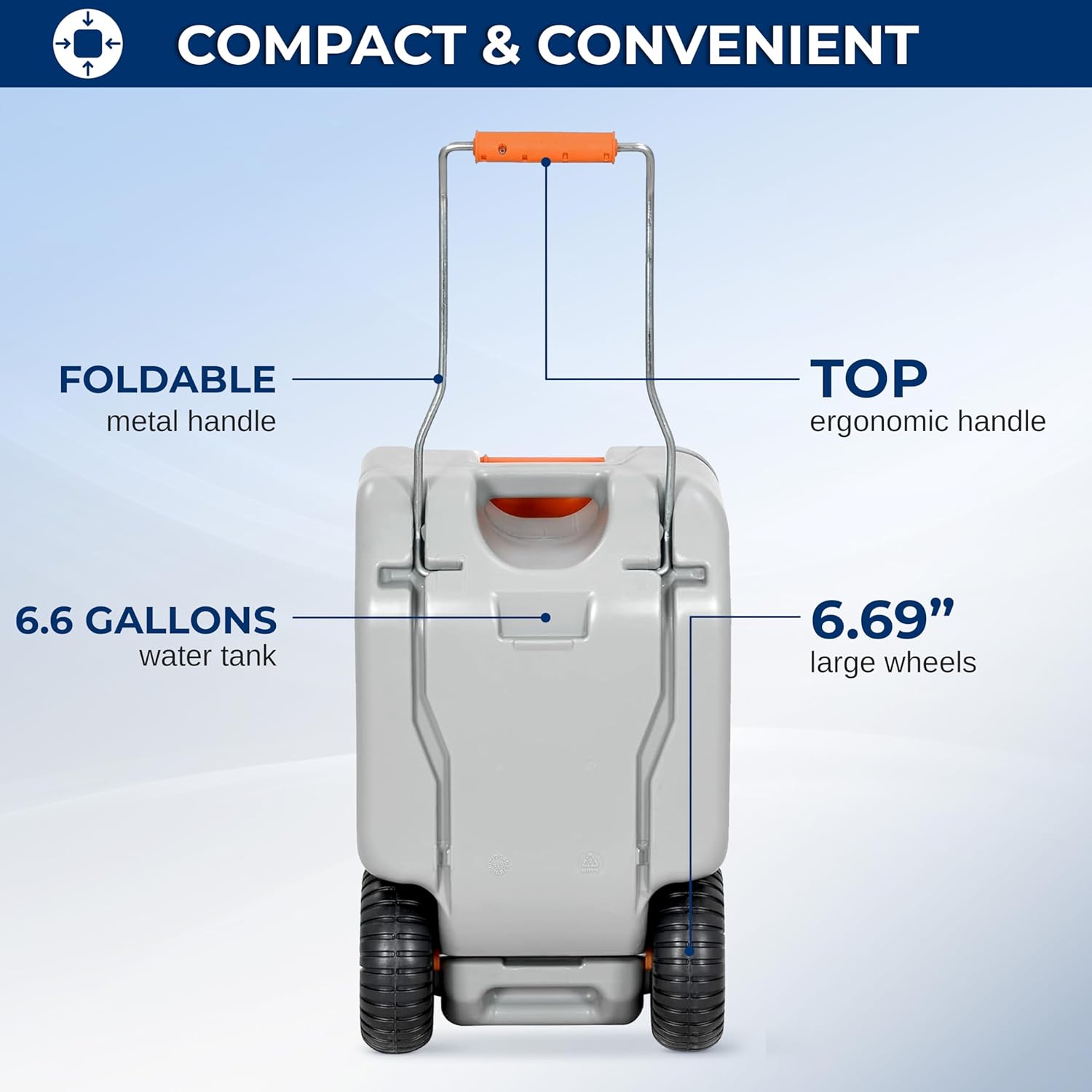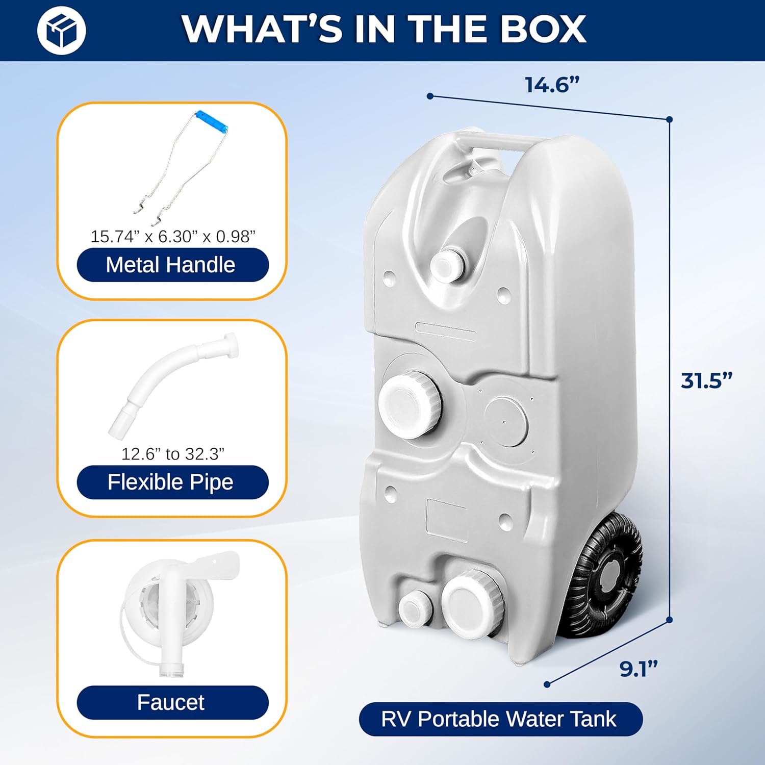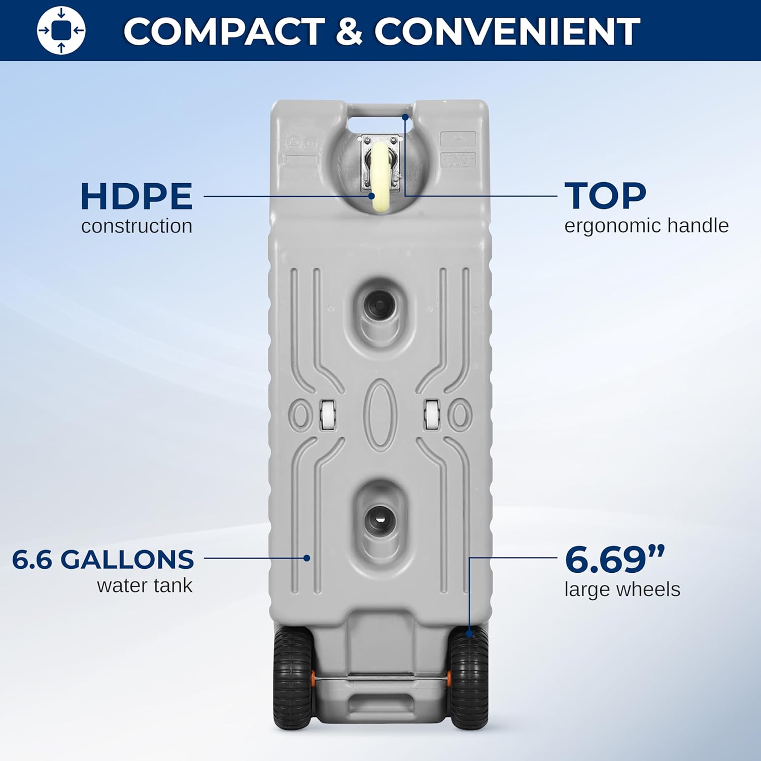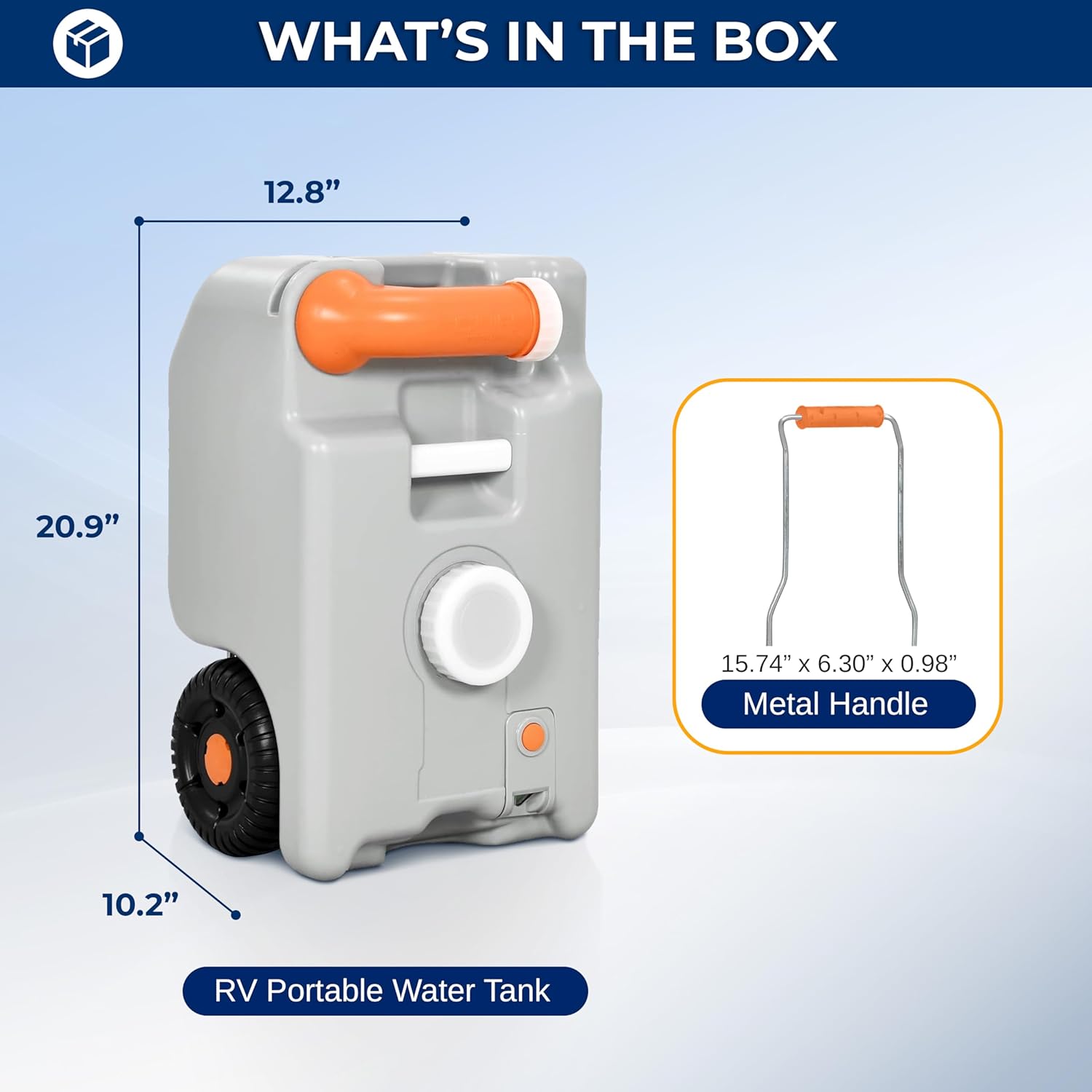 DURABLE & PORTABLE DESIGN - Made from sturdy HDPE material, this portable water tank is easy to clean. The metal handle and large rolling wheels facilitate transport, even when full, making it an ideal water container for RV and outdoor activities.