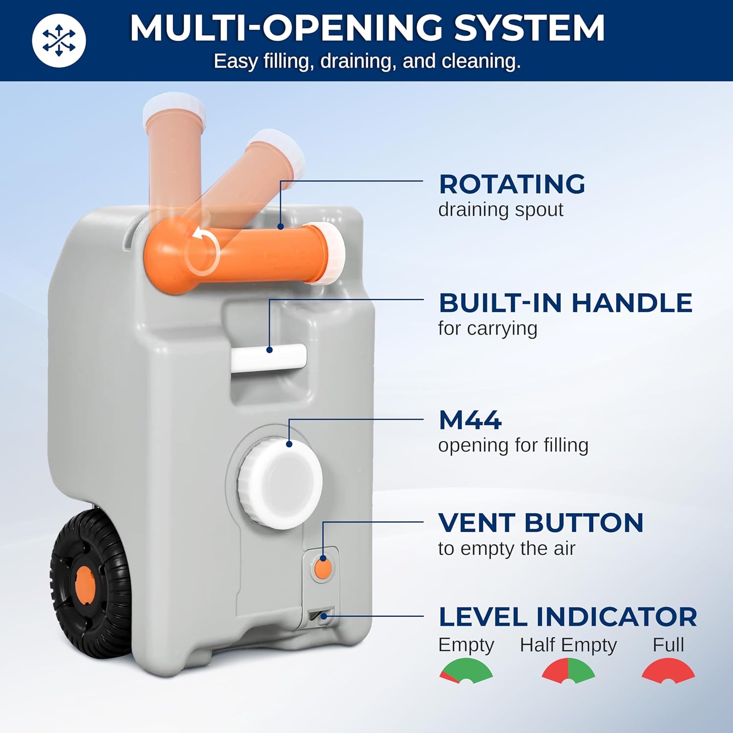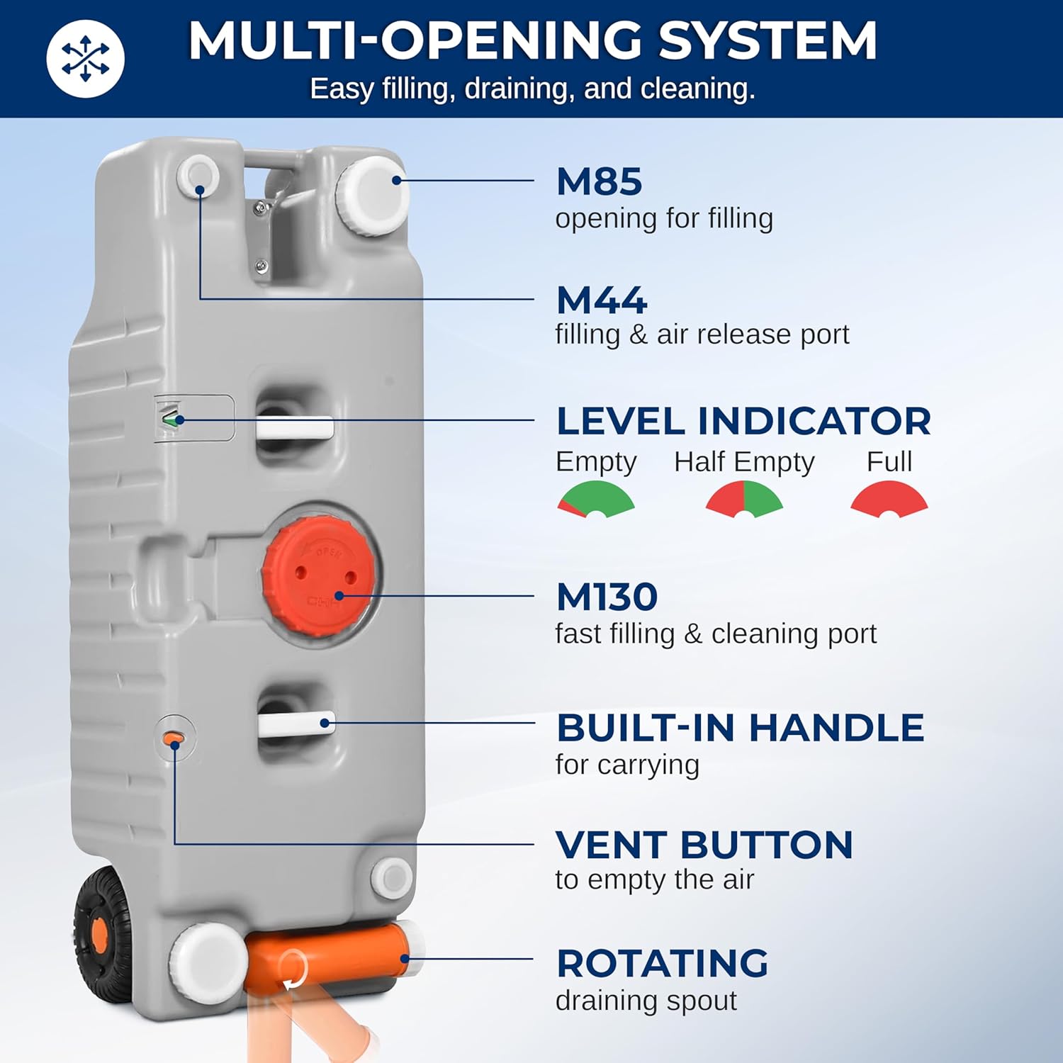 VERSATILE USE - This 40L RV portable water tank is perfect for carrying freshwater or sewage. Designed for RVs and camping, this water container provides ample capacity for your water storage needs, ensuring you have access to clean water on-the-go.