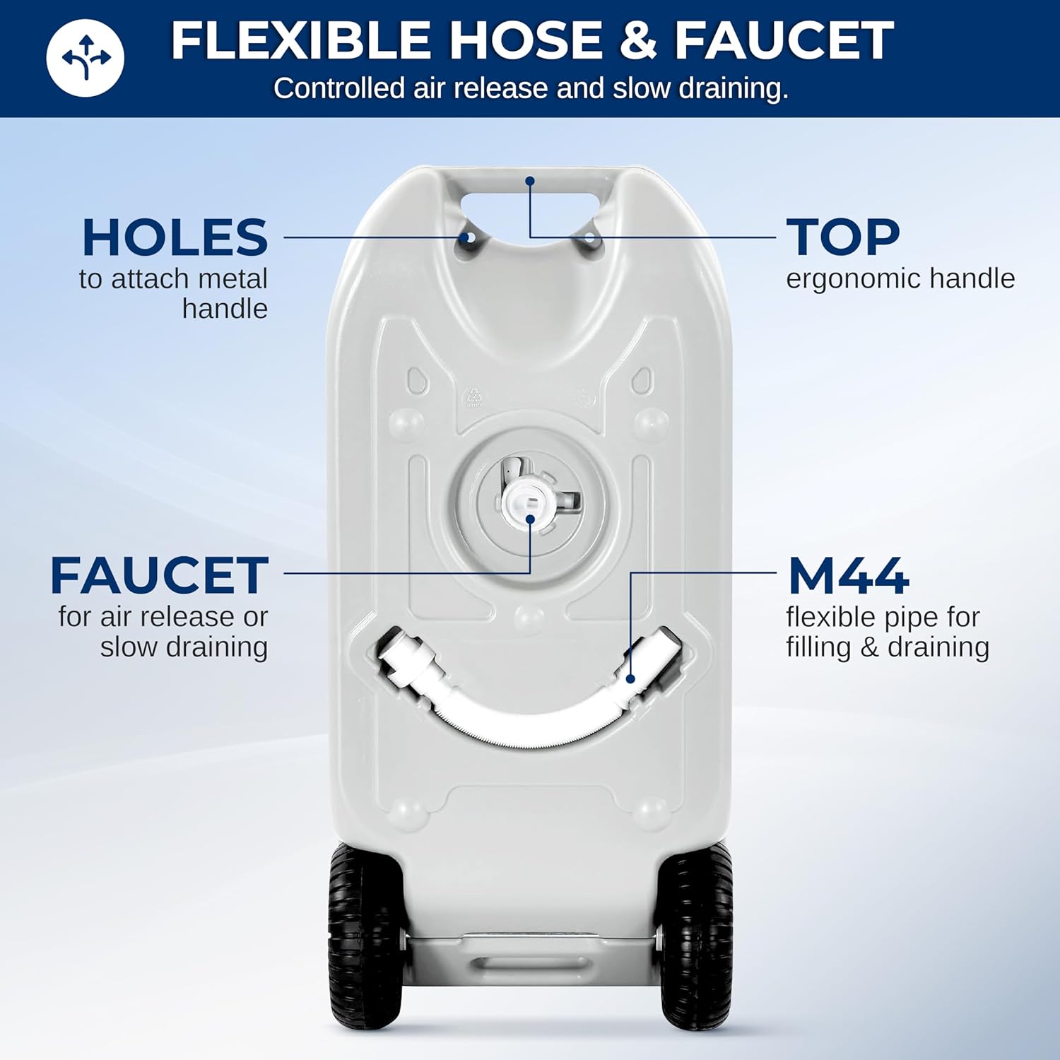 ADDITIONAL FEATURES - A faucet for controlled air release and draining ensures precise control over water flow, preventing spillage and waste. The flexible hose for water inlet or draining offers versatile use by allowing easy filling and draining.