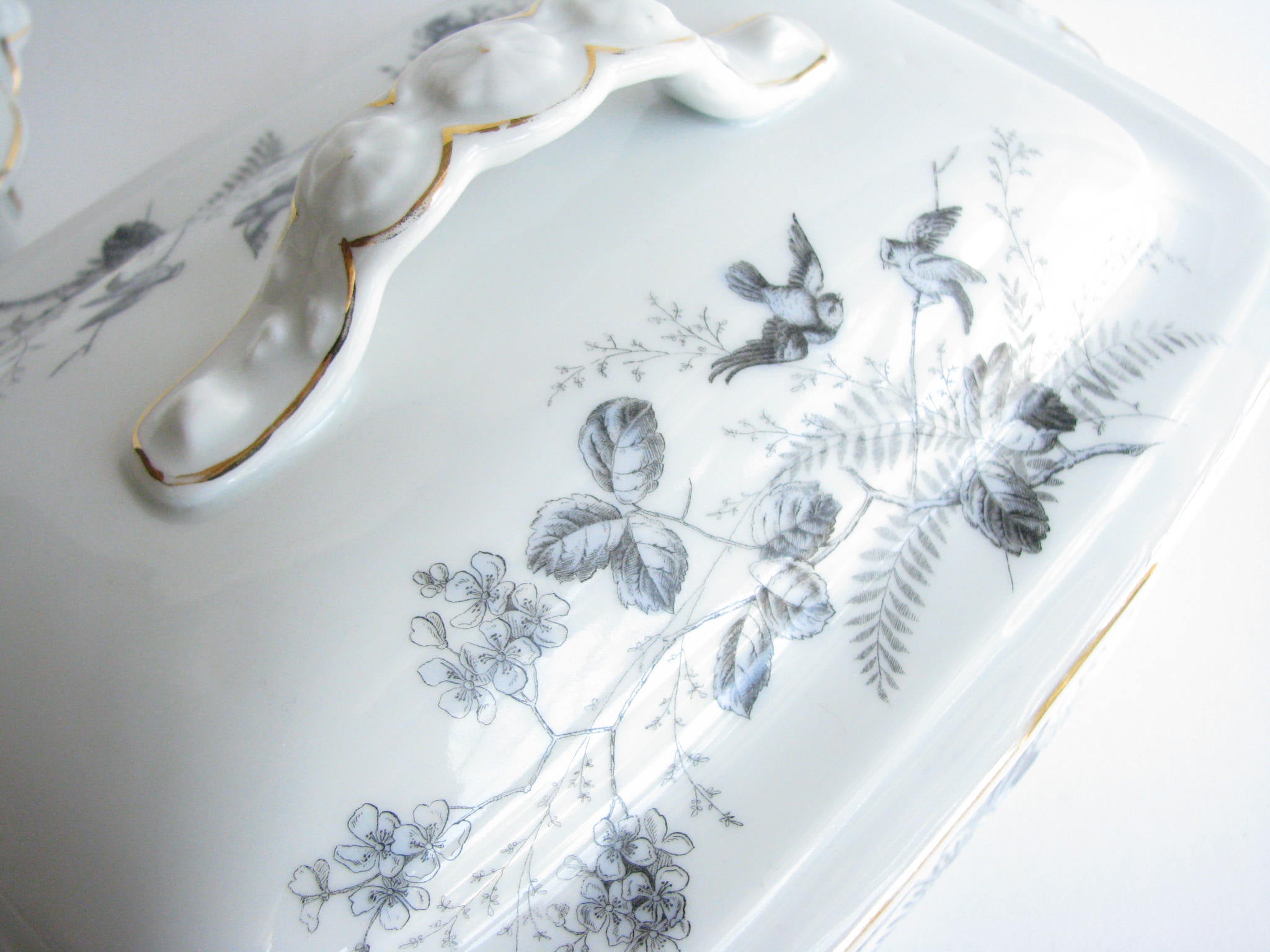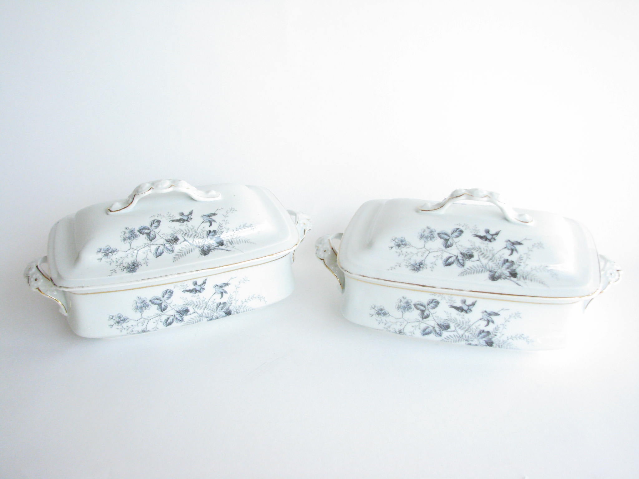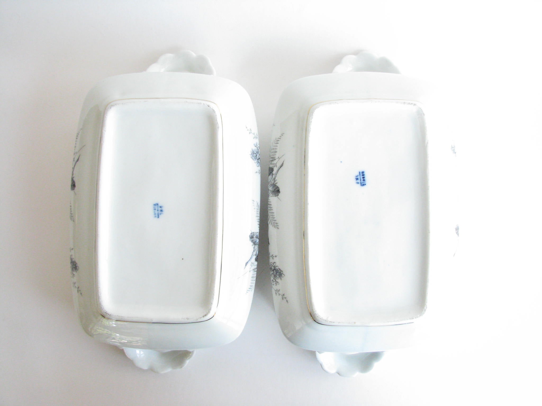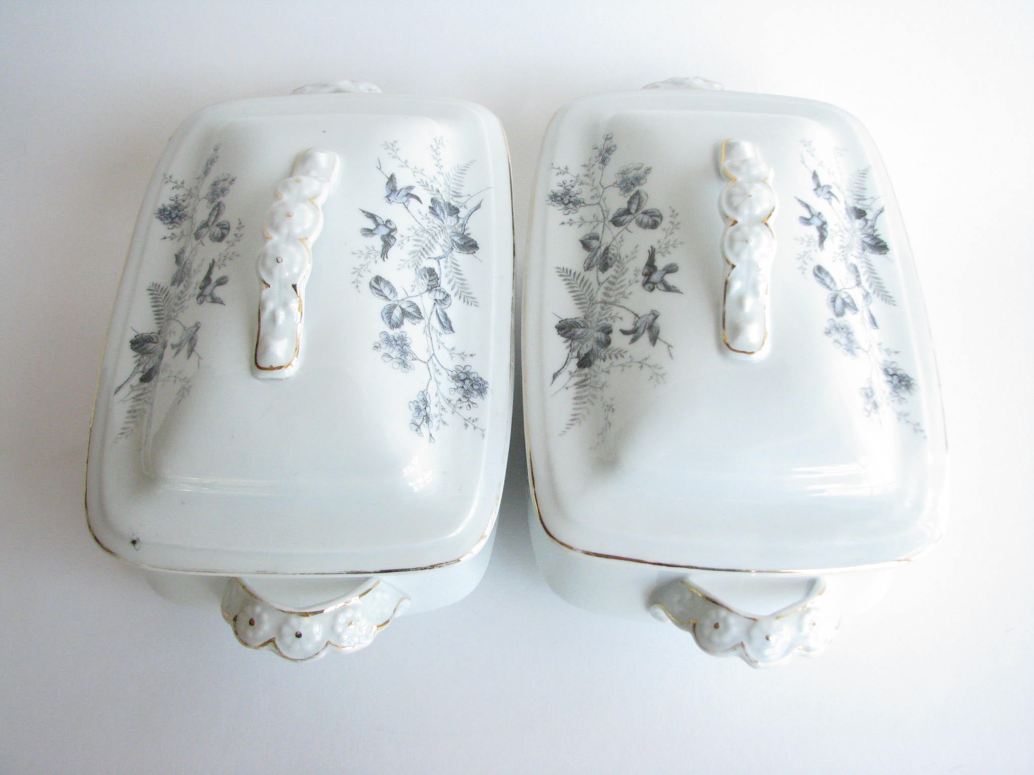 A pair of antique P.H. Leonard porcelain lidded serving / vegetable dishes with bird and foliage motif. P.H. Leonard was a major U.S. importer of Bohemian porcelain in the Late 19th Century up to approximately 1908.