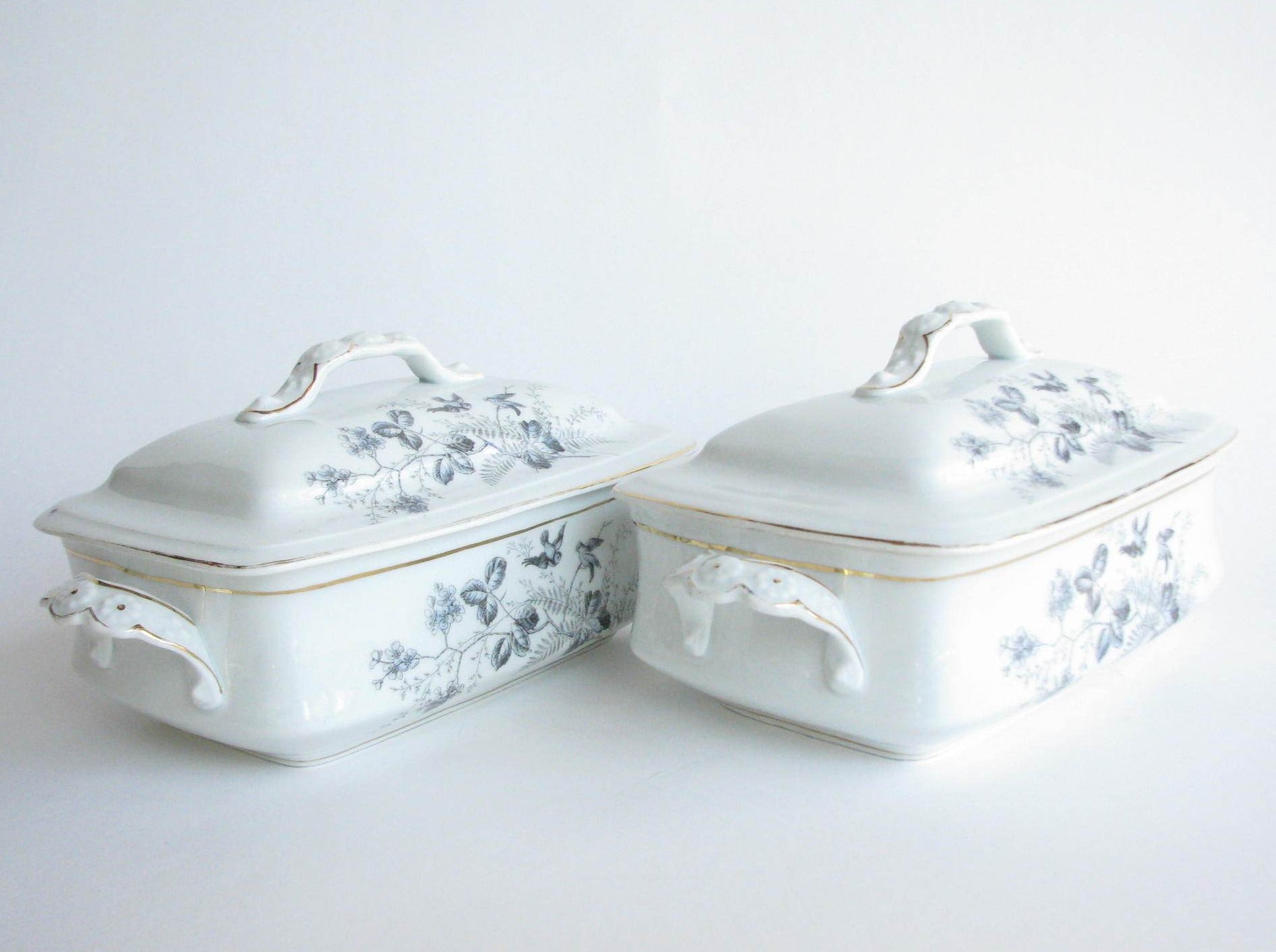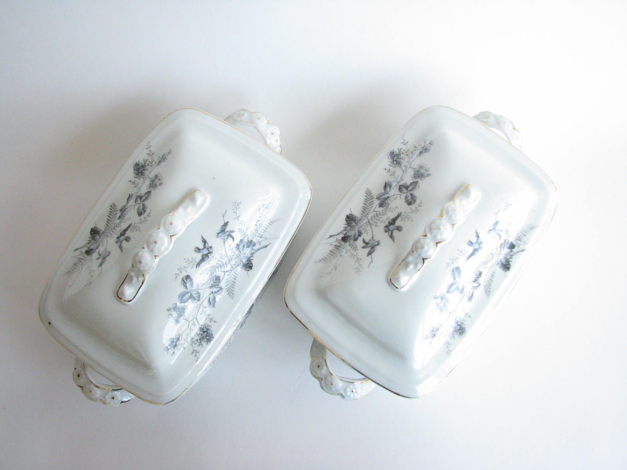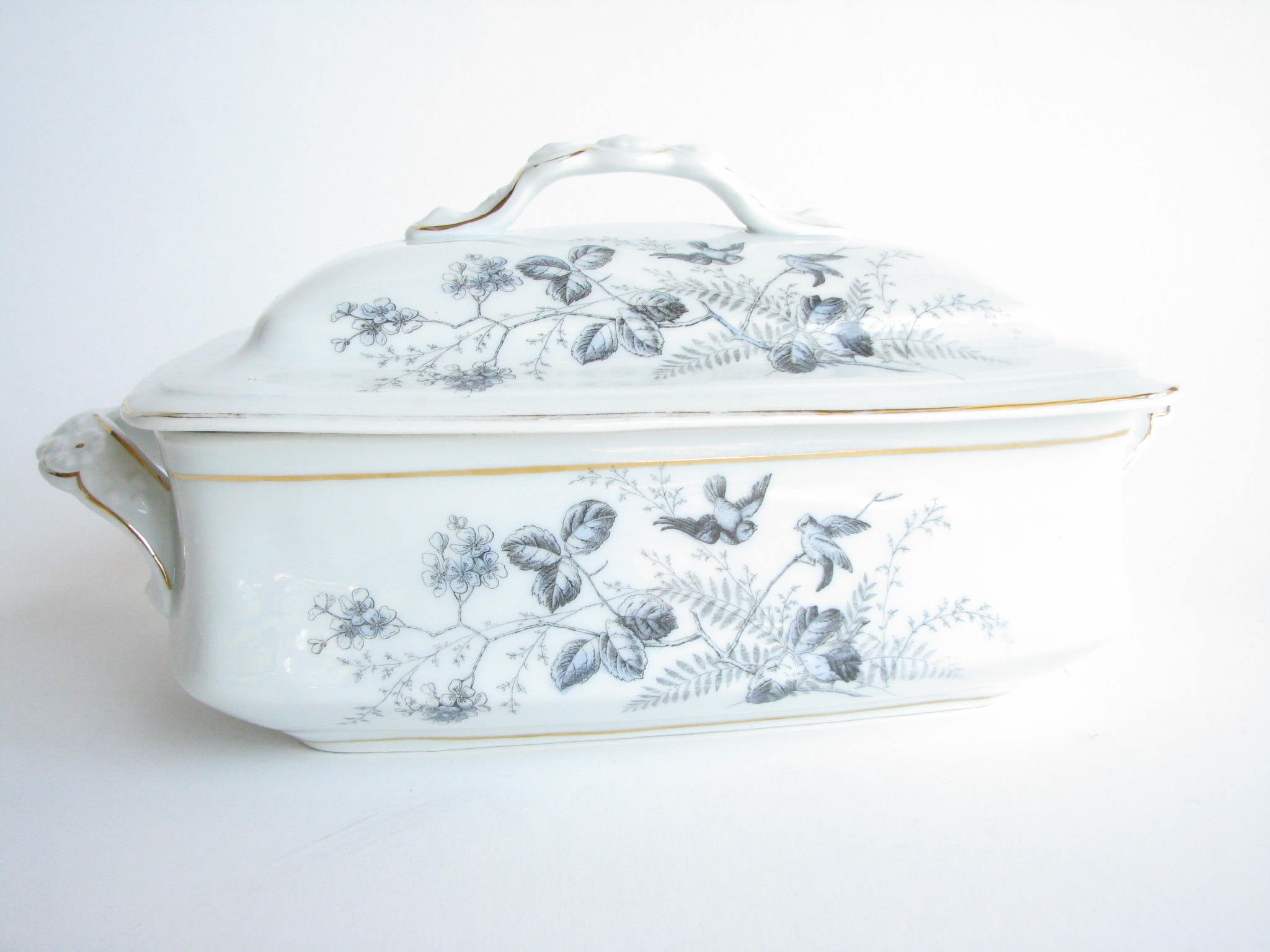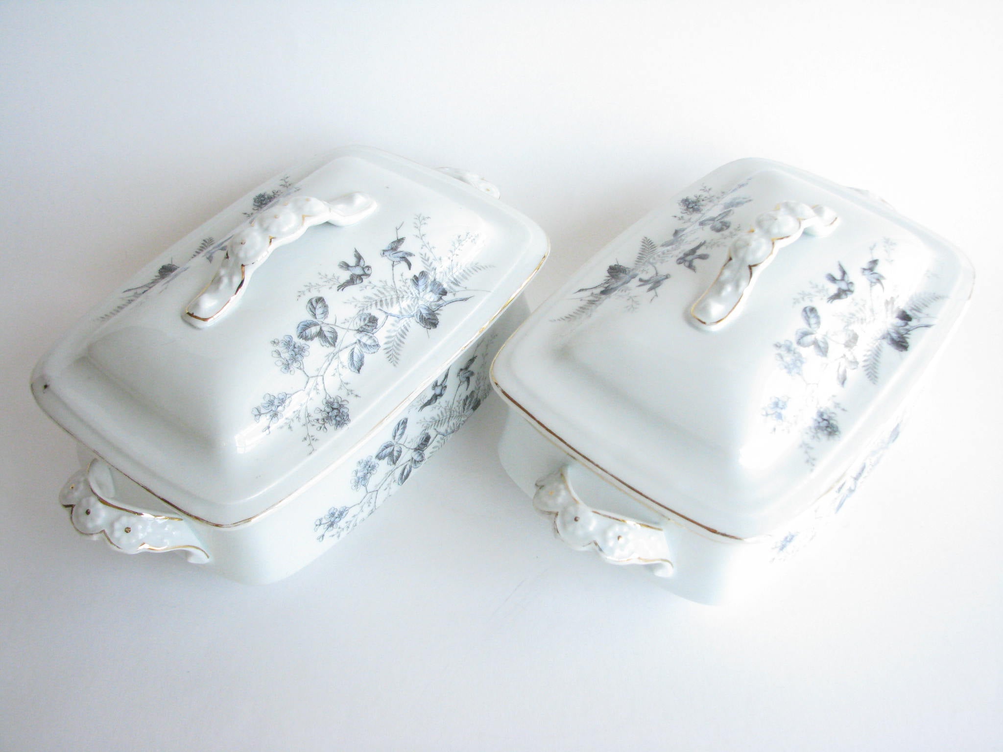 A pair of antique P.H. Leonard porcelain lidded serving / vegetable dishes with bird and foliage motif. P.H. Leonard was a major U.S. importer of Bohemian porcelain in the Late 19th Century up to approximately 1908.