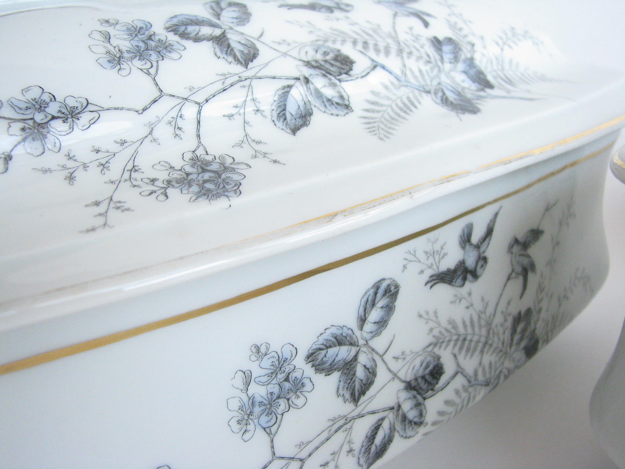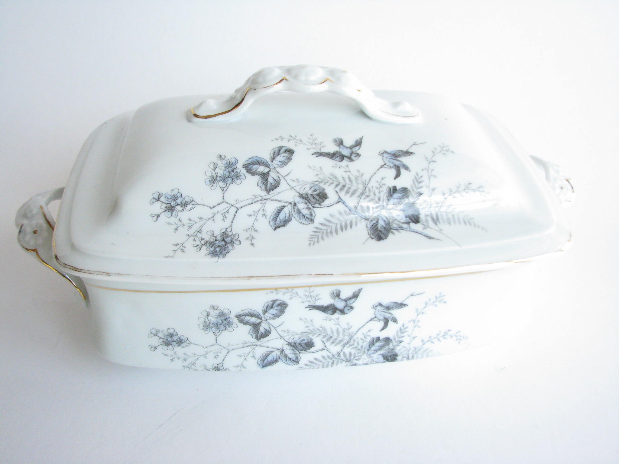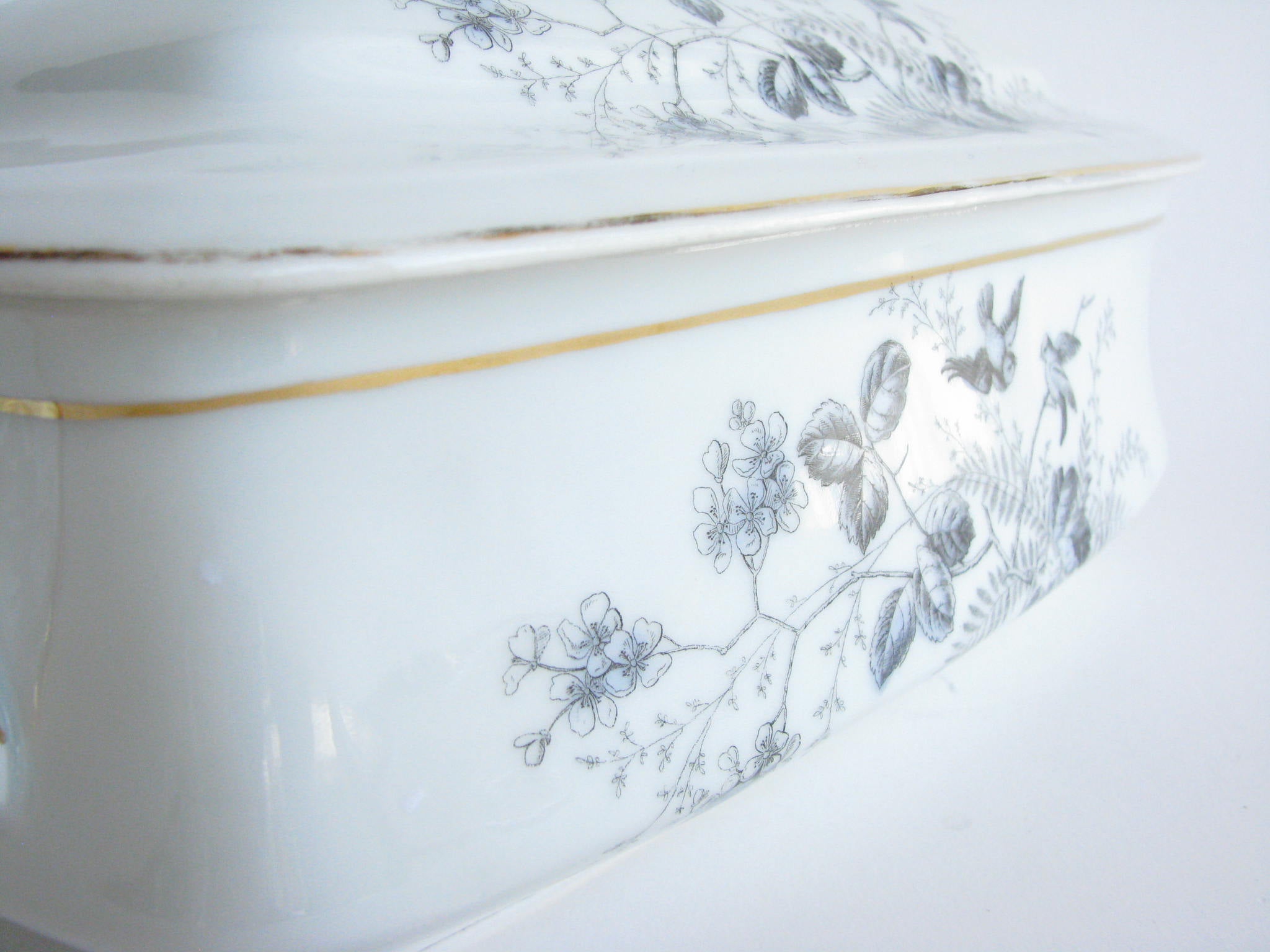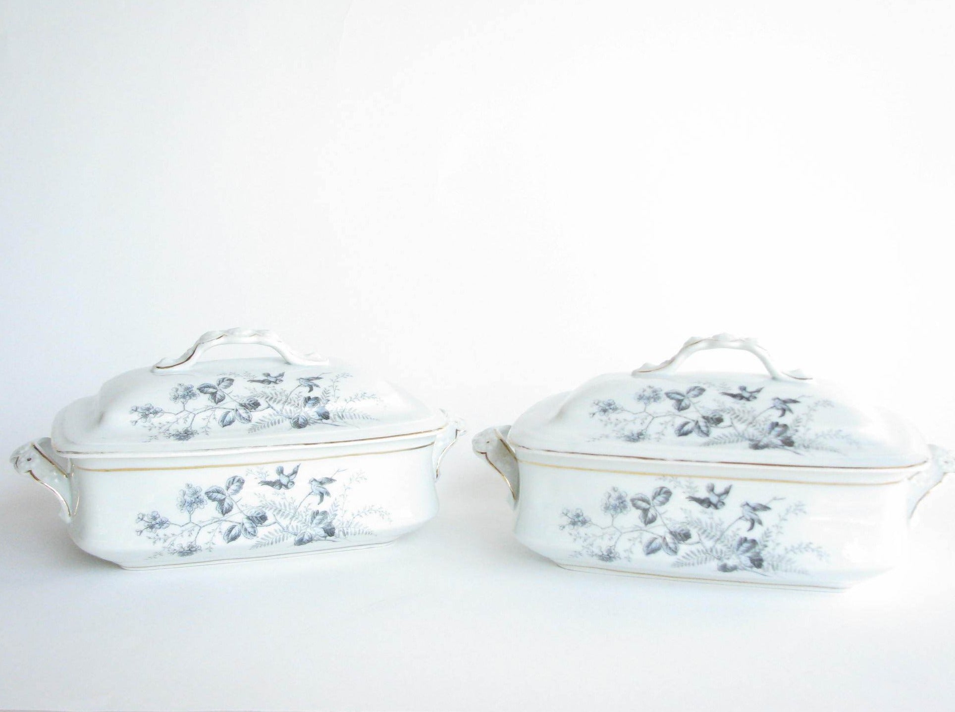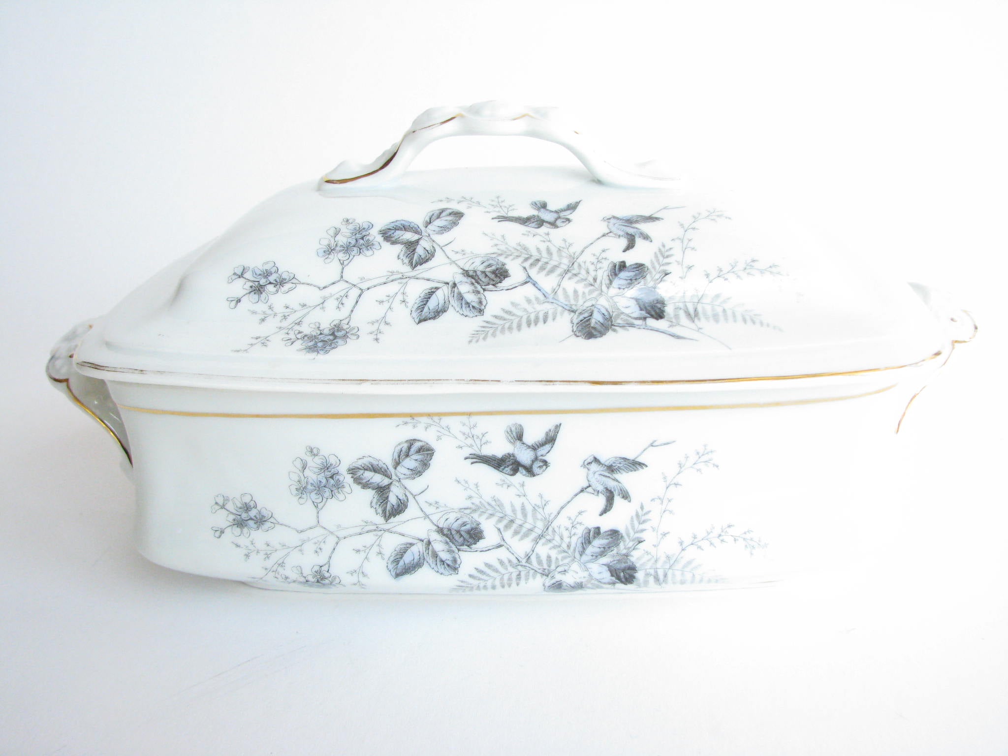 A pair of antique P.H. Leonard porcelain lidded serving / vegetable dishes with bird and foliage motif. P.H. Leonard was a major U.S. importer of Bohemian porcelain in the Late 19th Century up to approximately 1908.