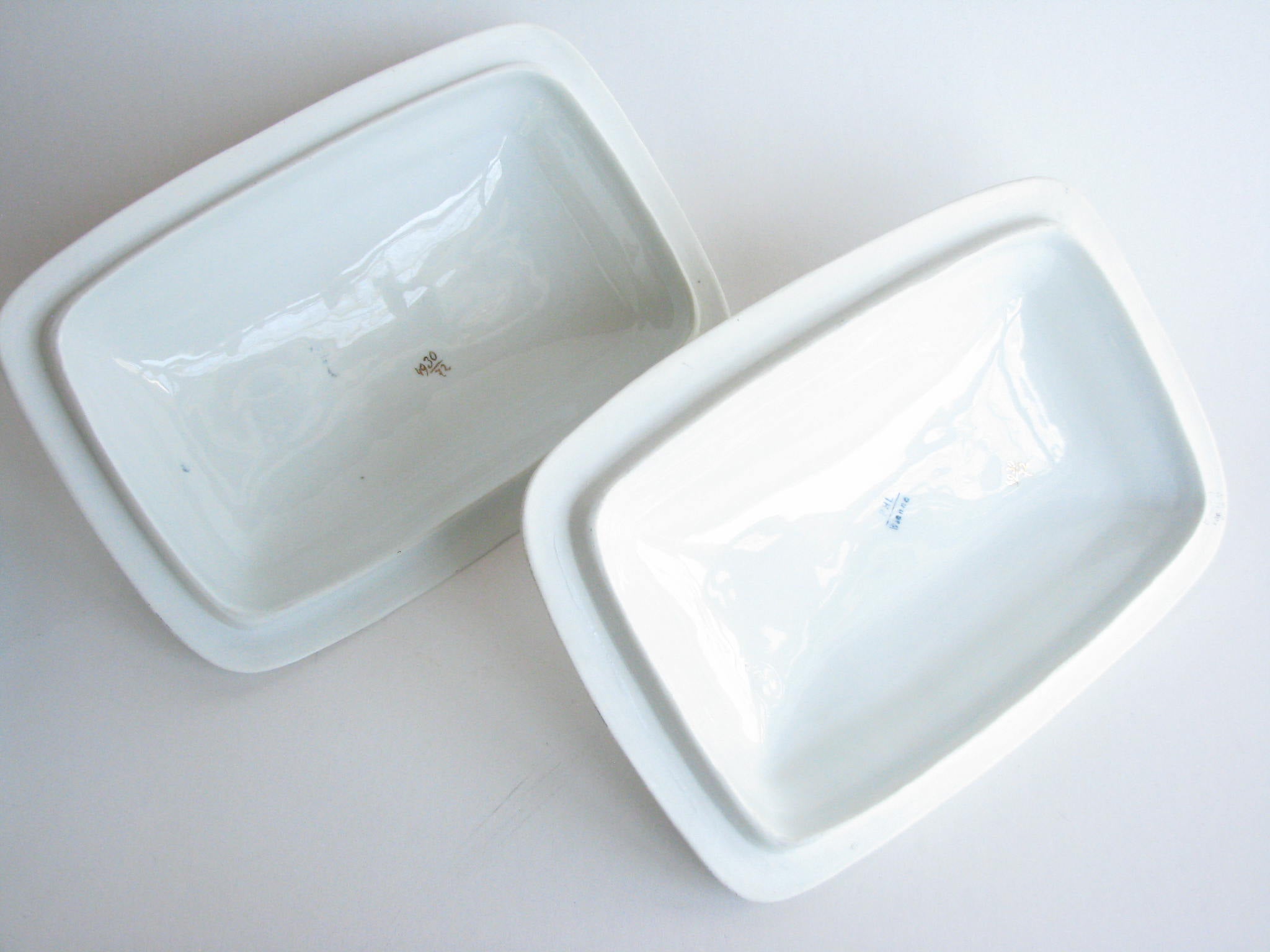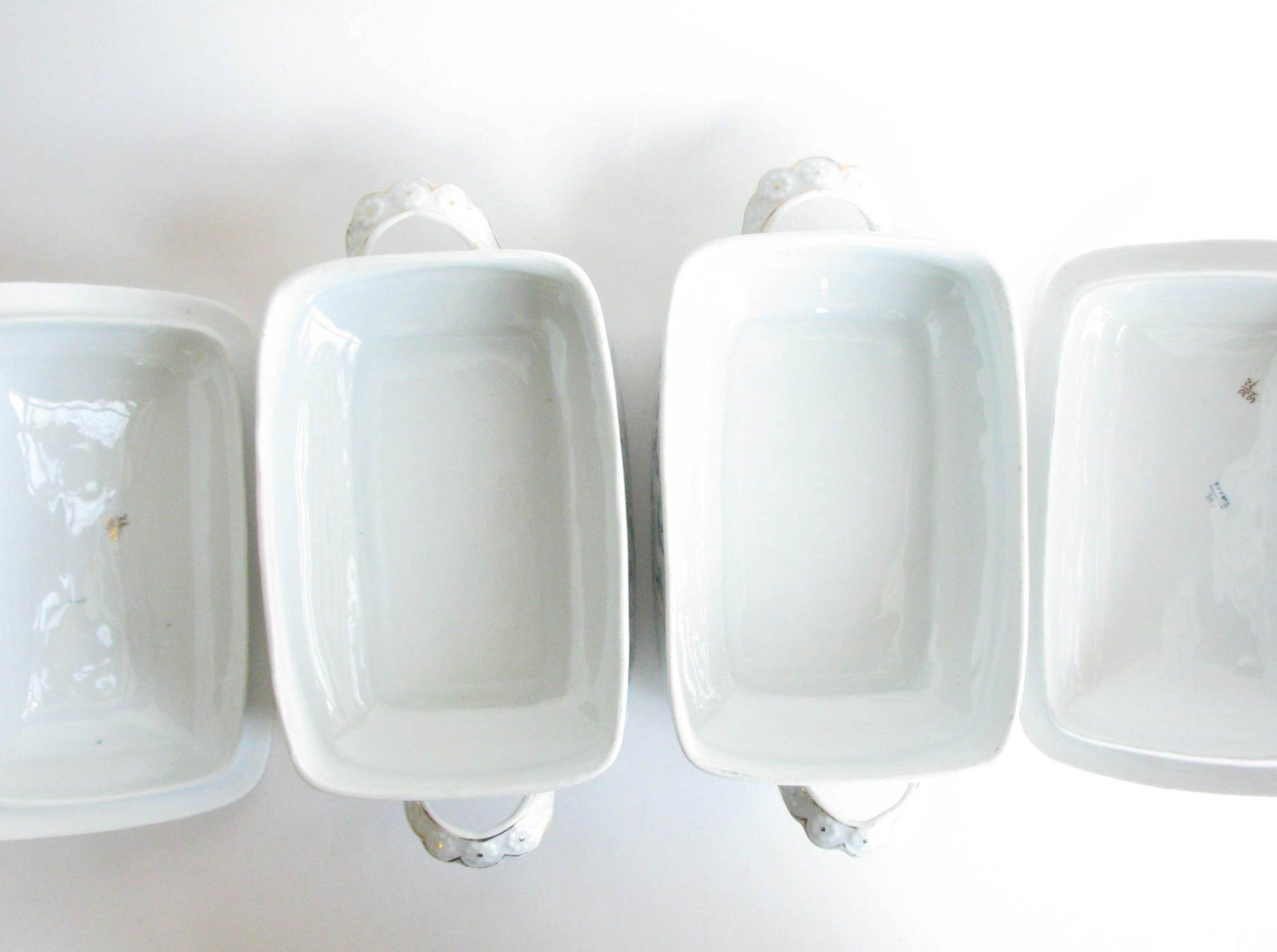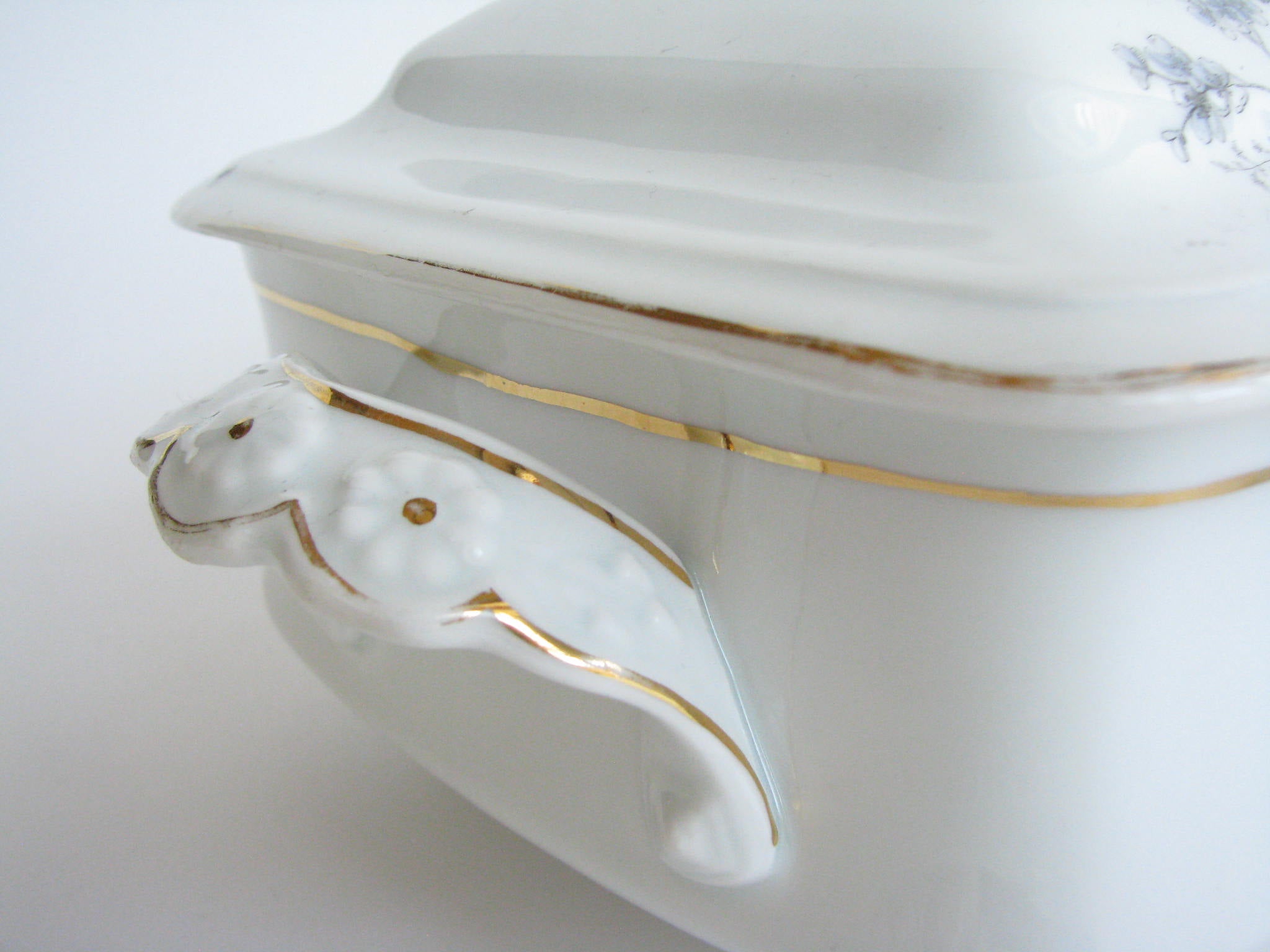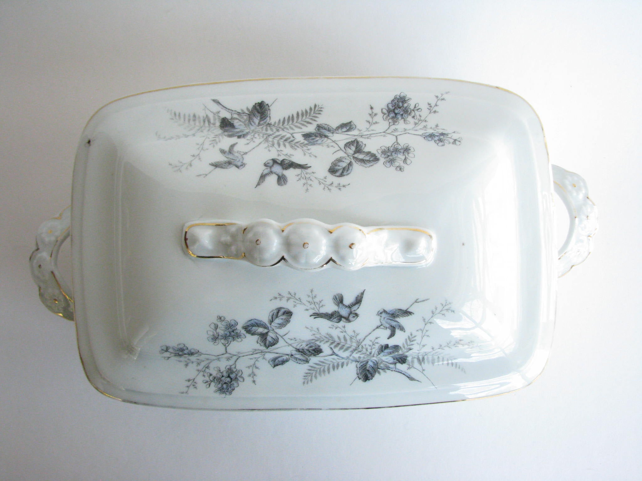 A pair of antique P.H. Leonard porcelain lidded serving / vegetable dishes with bird and foliage motif. P.H. Leonard was a major U.S. importer of Bohemian porcelain in the Late 19th Century up to approximately 1908.