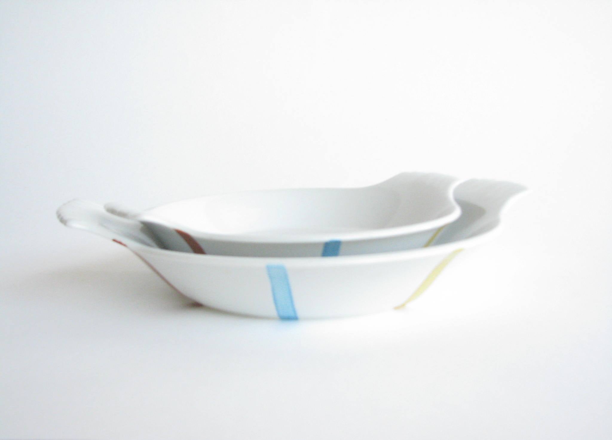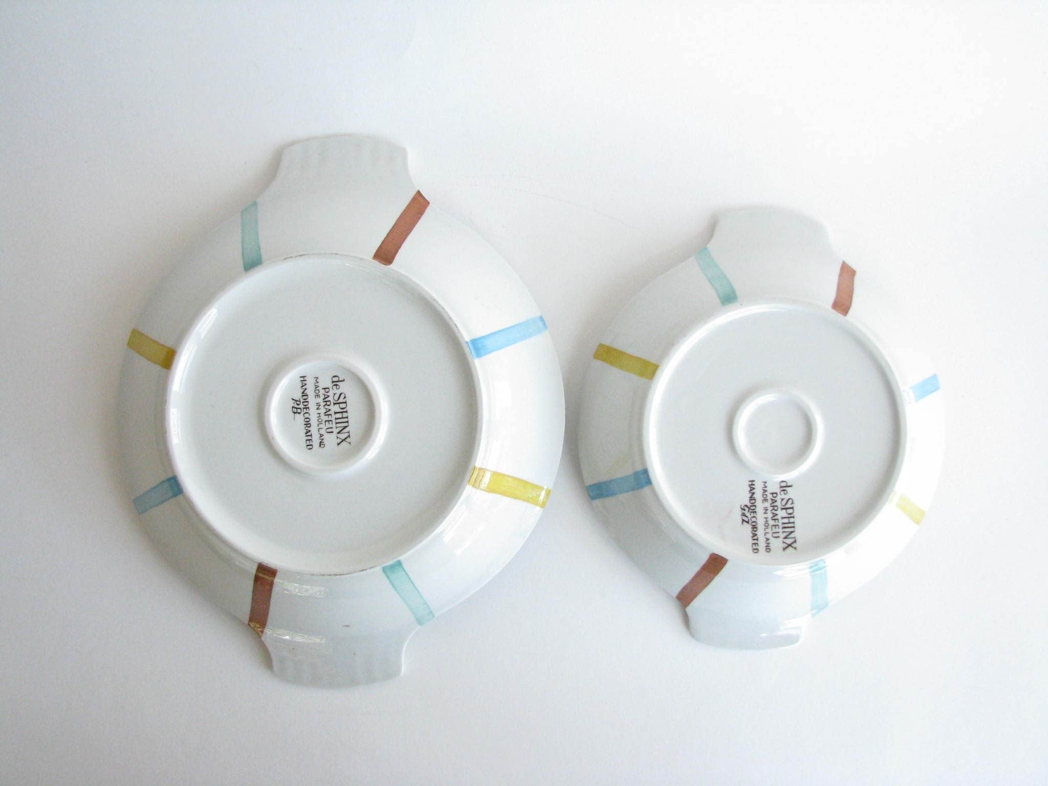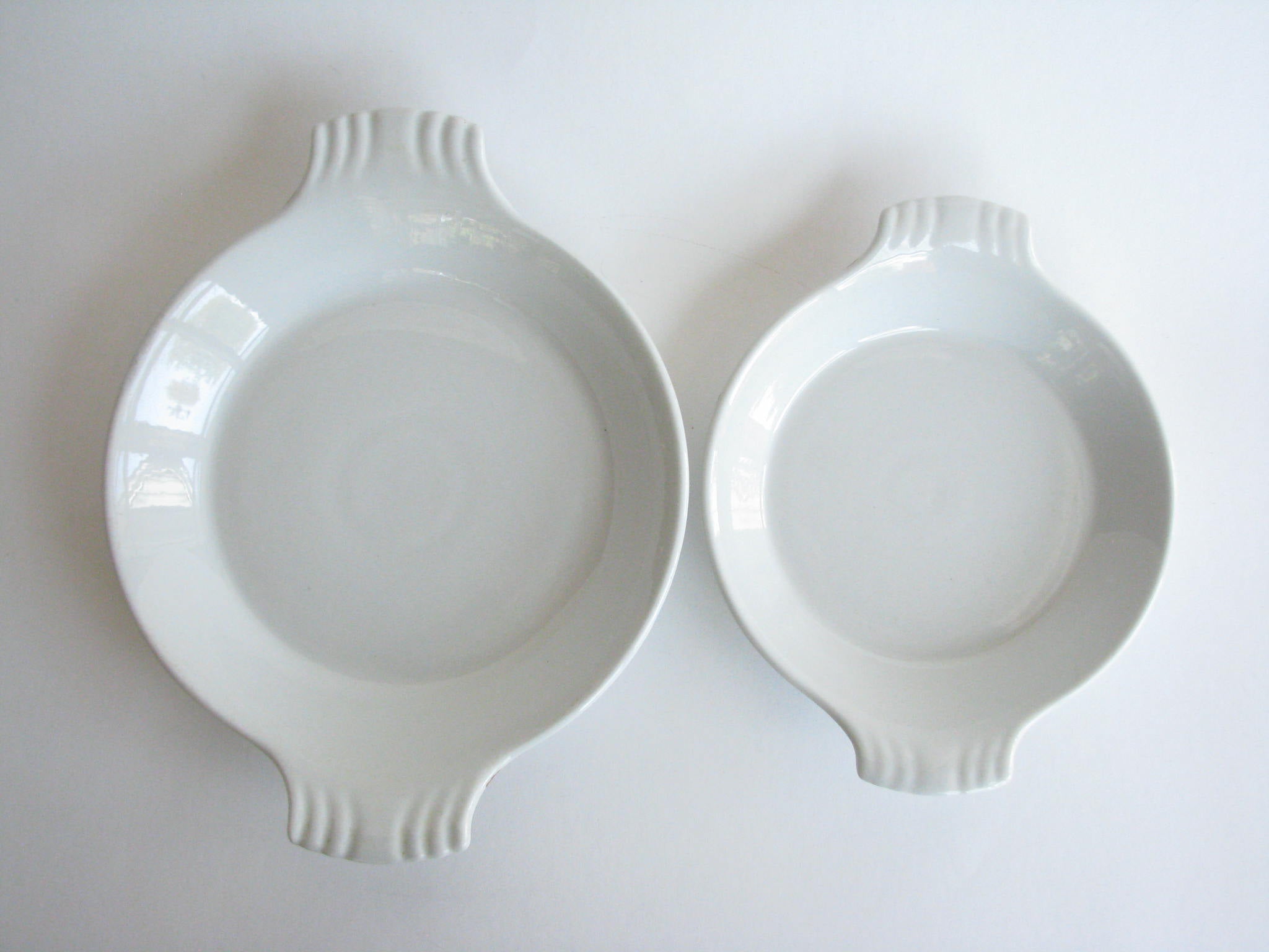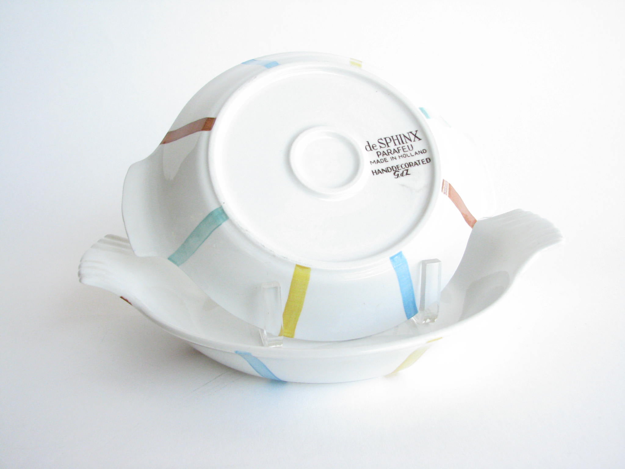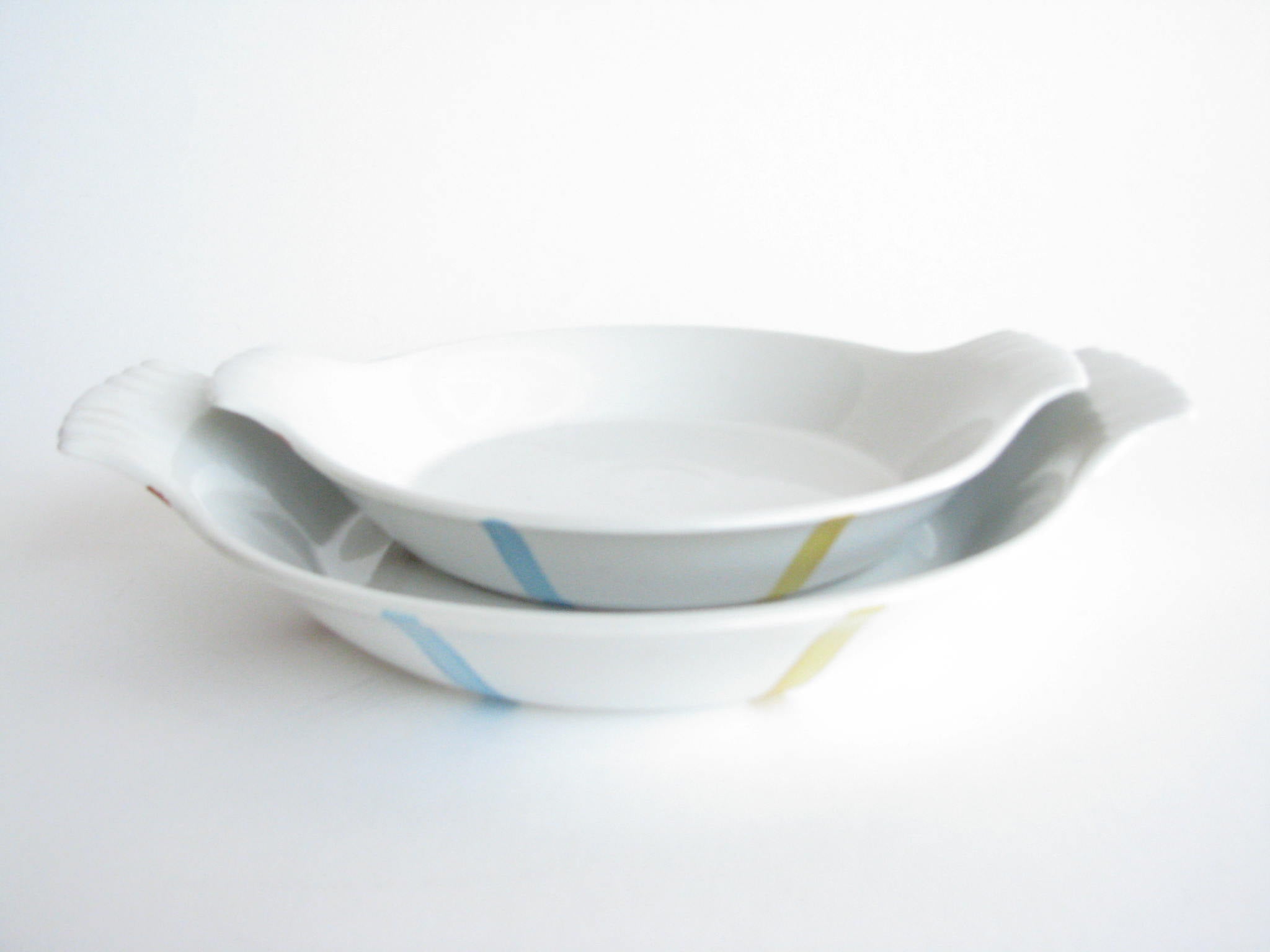 Vintage set of 2 Dutch de Sphinx Parafeu ceramic cookware / round au gratin dishes. White with striped design on outside. Marked on underside with maker and decorator.