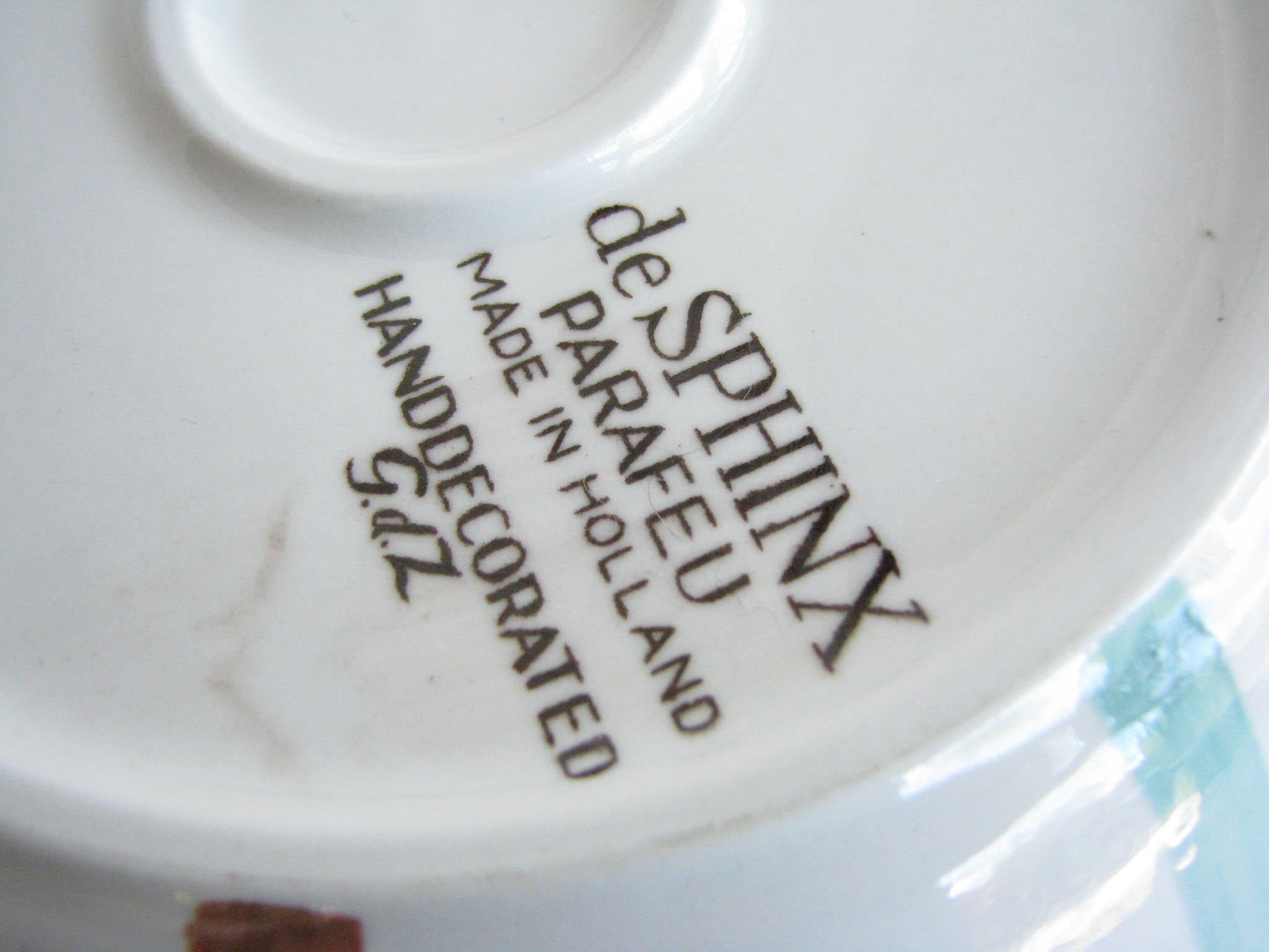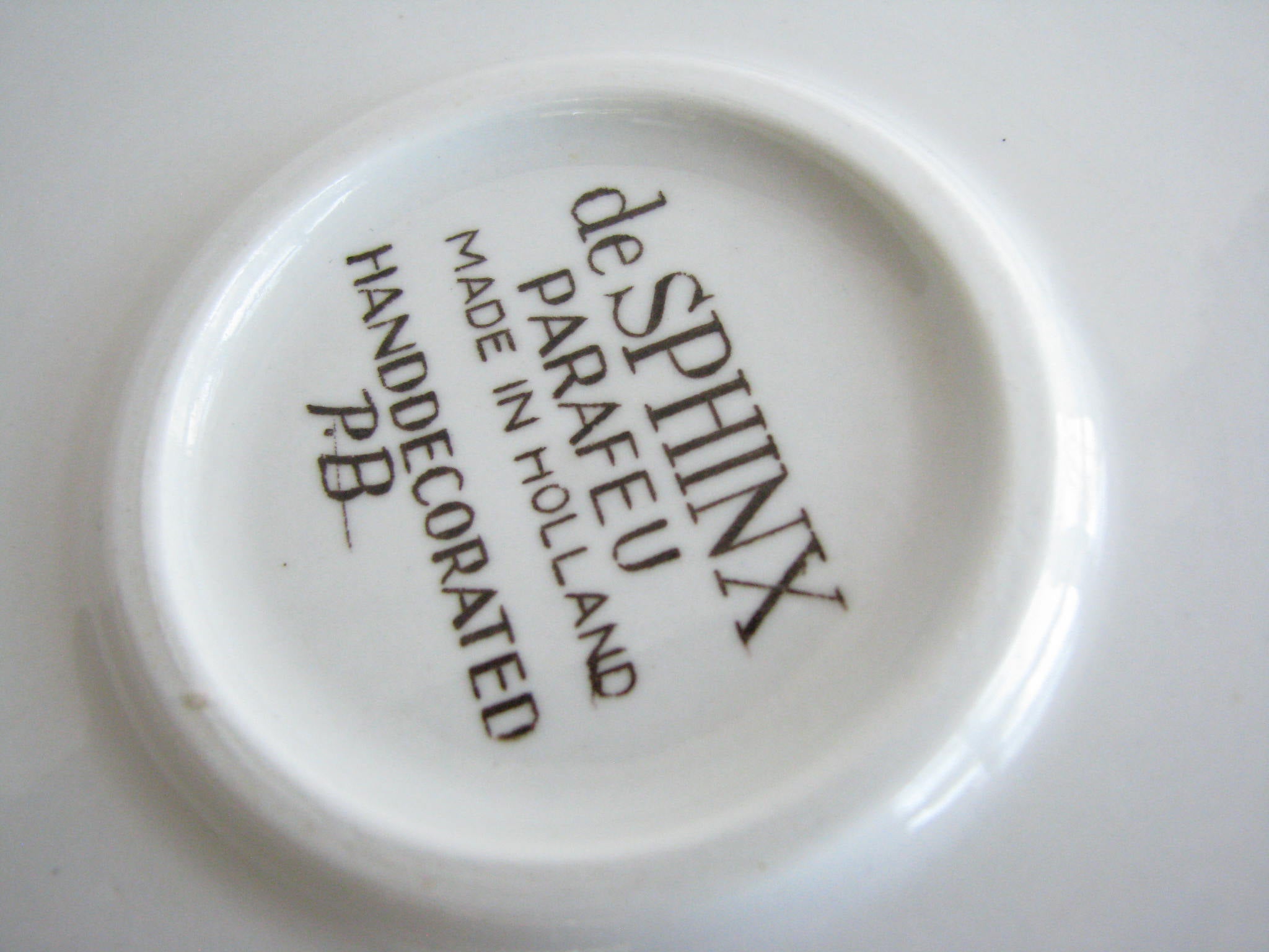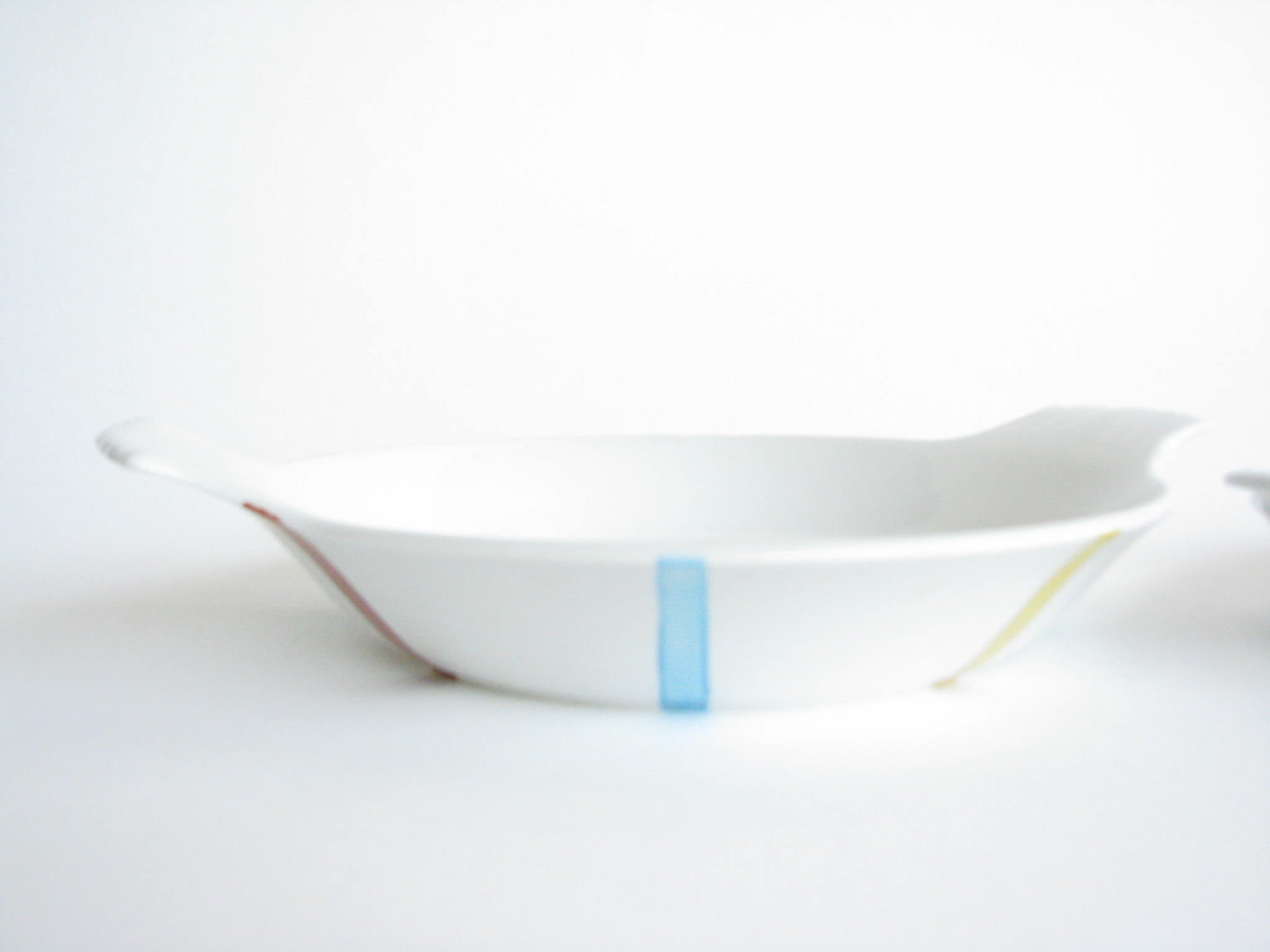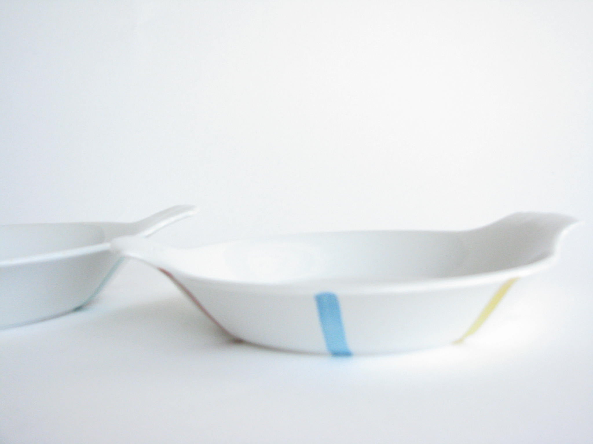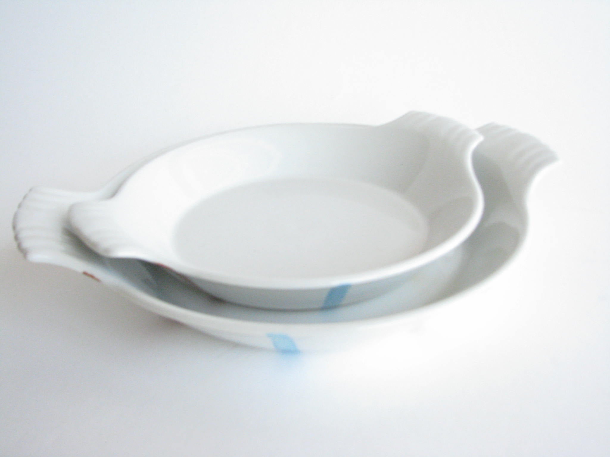 Vintage set of 2 Dutch de Sphinx Parafeu ceramic cookware / round au gratin dishes. White with striped design on outside. Marked on underside with maker and decorator.