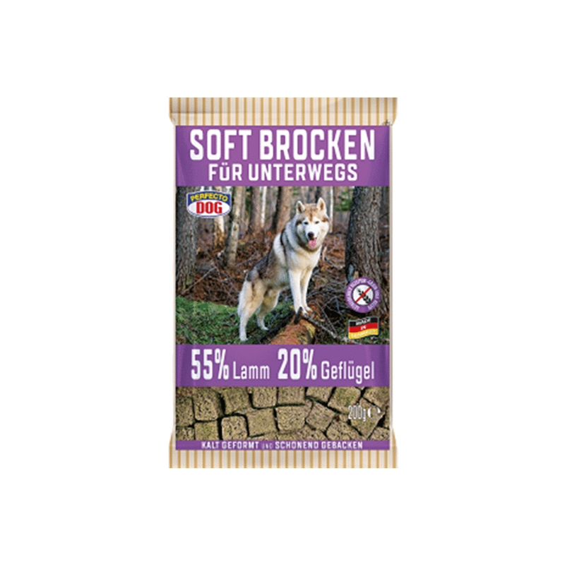 Supplementary feed for adult dogs. These soft chunks are the ideal reward for on the go. The snack is ideal as a small snack between meals and for daily enjoyment; it was also shaped and gently baked. Grain-free recipe !!