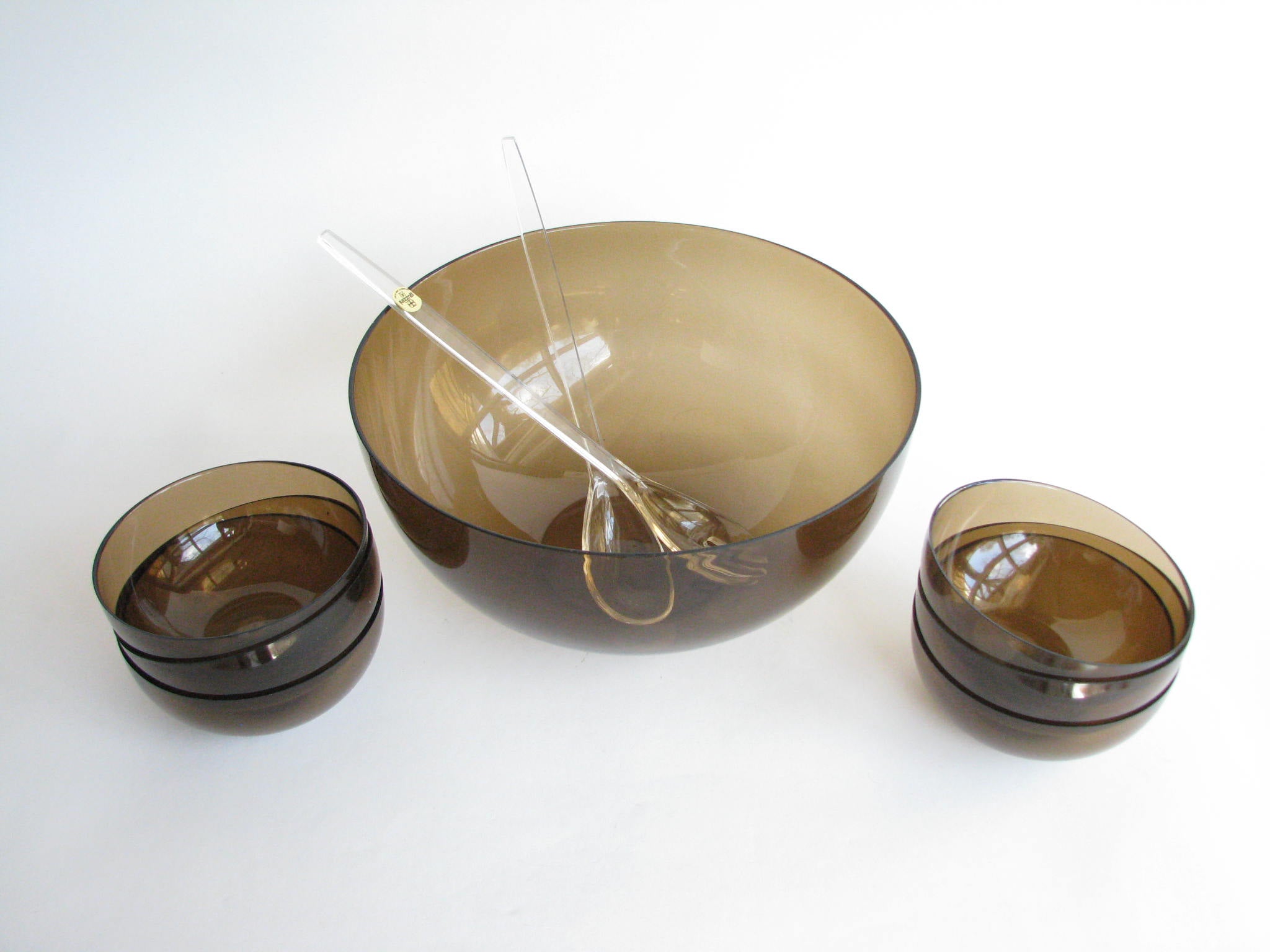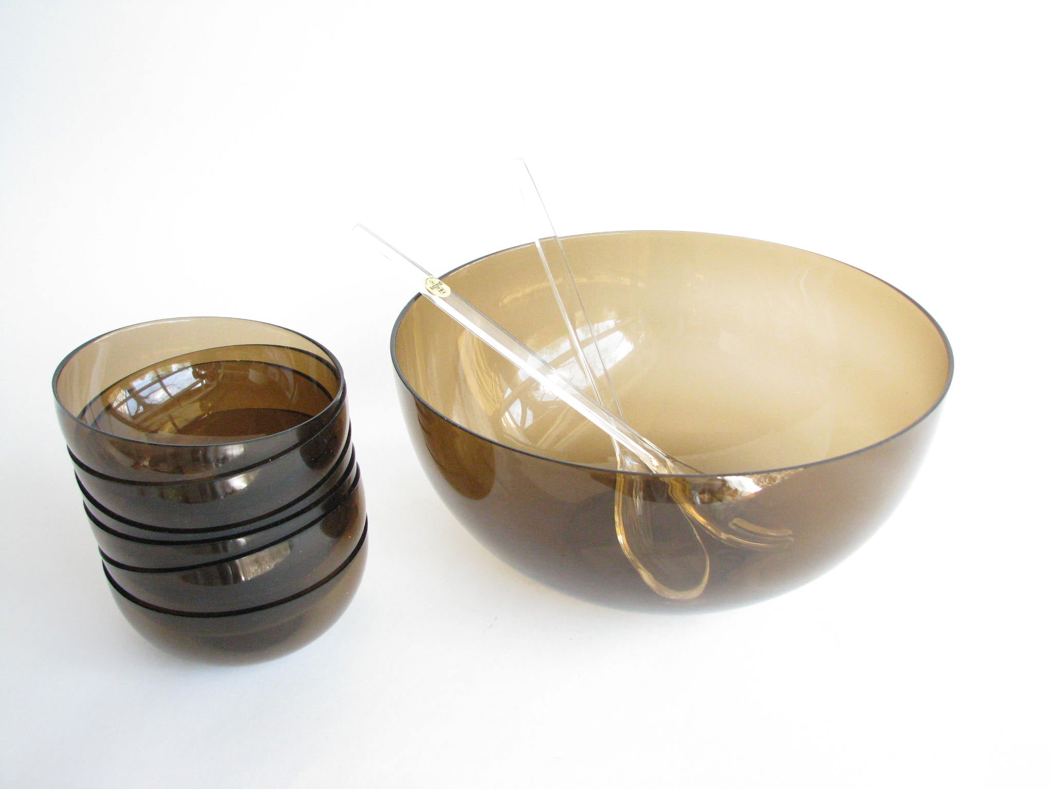 Rare Guzzini Tullia smoked brown / dark amber acrylic salad serving set made in Italy. This 9 piece set includes 1 large serving bowl, 6 salad bowls, and 2 clear serving utensils. This set is still in original wrapping and box, unused.