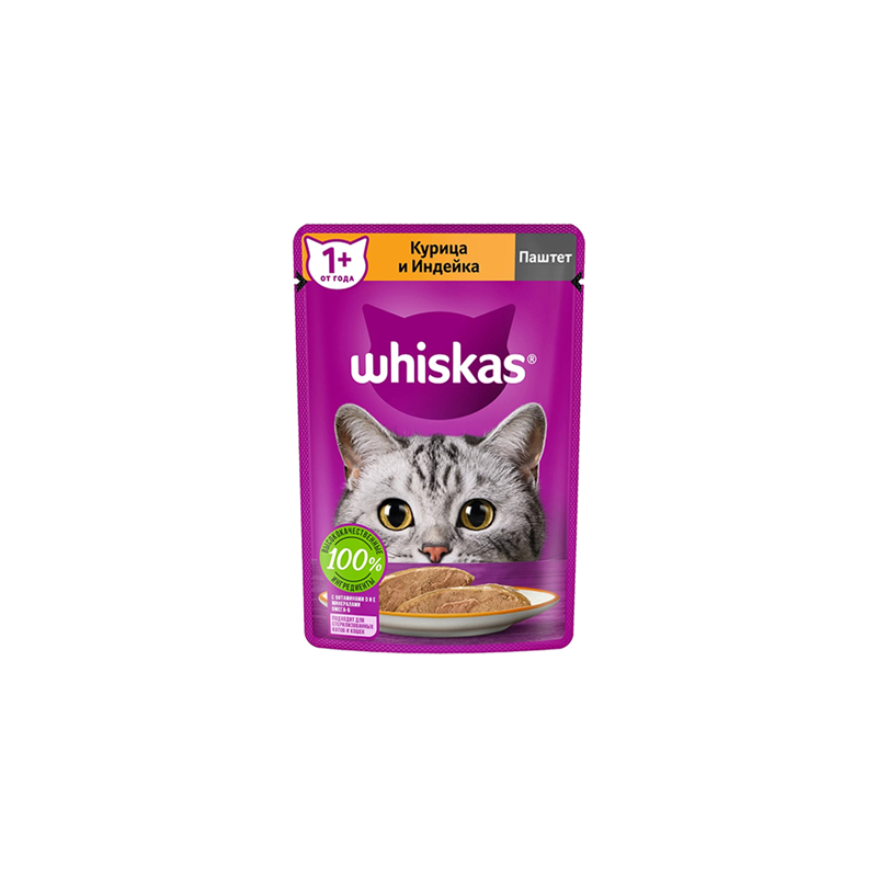 This is a balanced diet prepared just the way your cat likes it. Appetizing pate with chicken and turkey will give your pet a real treat. Life is exciting because the Whiskas® diet contains everything you need to make your cat’s food not only tasty but also healthy. Whiskas® will support your cat’s immune system, and digestion and keep your cat’s skin and coat healthy. Suitable for sterilized cats and cats. Whiskas® diets for adult cats are • 100% natural high-quality ingredients: meat and offal – no added flavors, artificial colors, or preservatives. • Optimal balance of nutrients for a fulfilling life • Everything you need to keep your pet healthy: Omega-6, calcium, phosphorus and taurine, vitamin D and E, and zinc Your cat will purr with pleasure! WHISKAS® recommends combining different food formats in your cat’s diet. In the morning and in the evening, your pet should be given a wet diet, and dry during the day. This type of food will combine the advantages of each of the formats. Advantages of dry diets: • Prevention of diseases of the oral cavity • Prevention of diseases of the gastrointestinal tract Advantages of wet diets: • Prevention of obesity • Prevention of diseases of the urinary system It should be remembered that mixing dry and wet diets in one bowl is not recommended. In addition, your pet should always have access to clean drinking water. Nutrient content (100 g): protein – 8.0 g; fat – 4.0 g; ash – 1.8 g; fiber – 0.2 g; moisture – 85 g; vitamin A – at least 150 IU; vitamin E – at least 1.0 mg. Energy value (100 g): 70 kcal / 293 kJ.