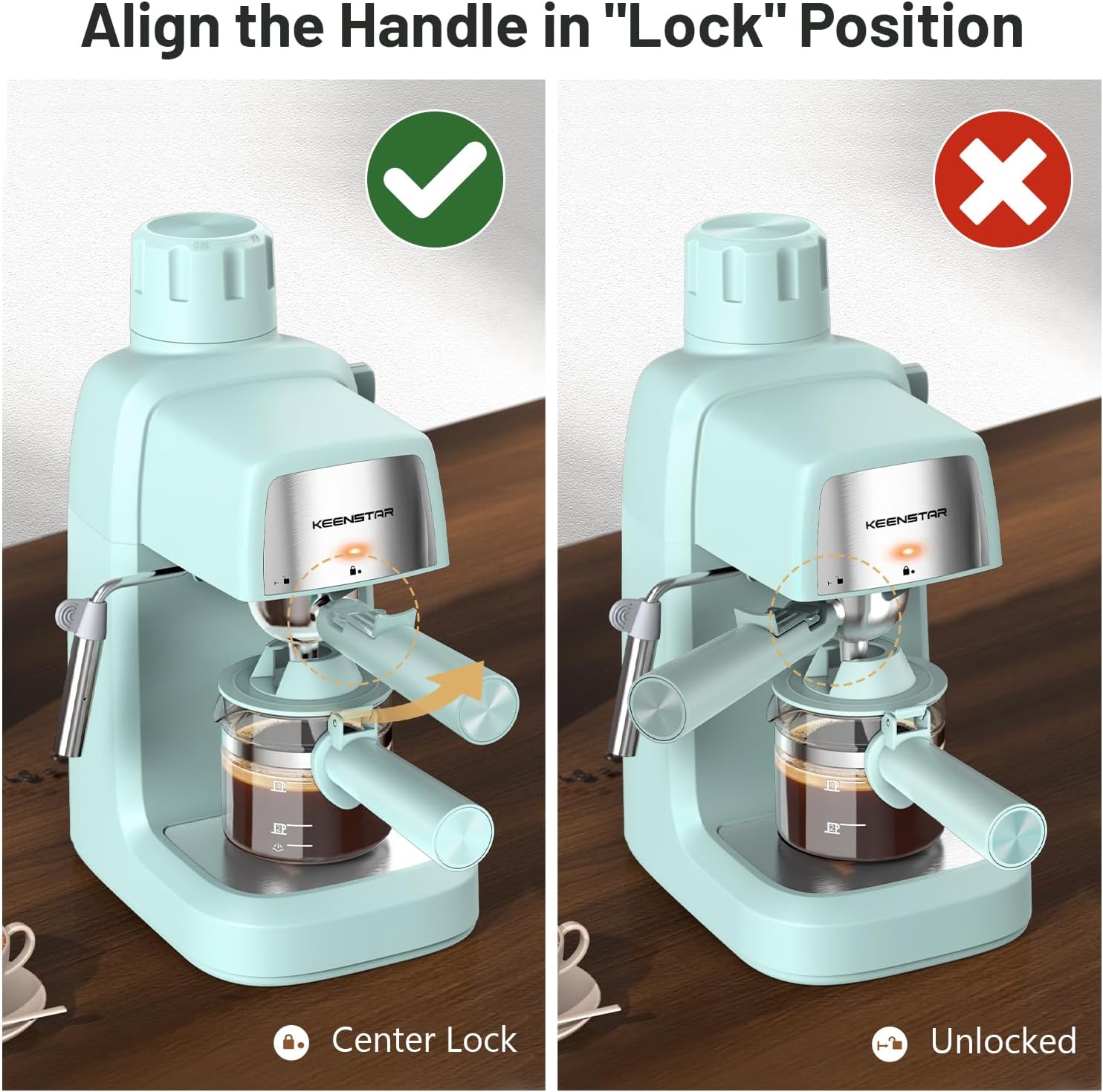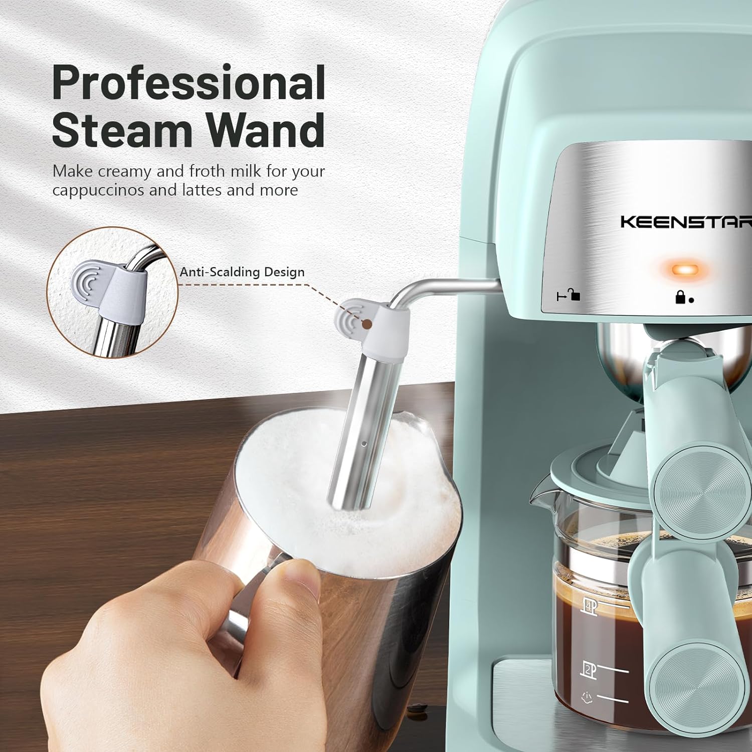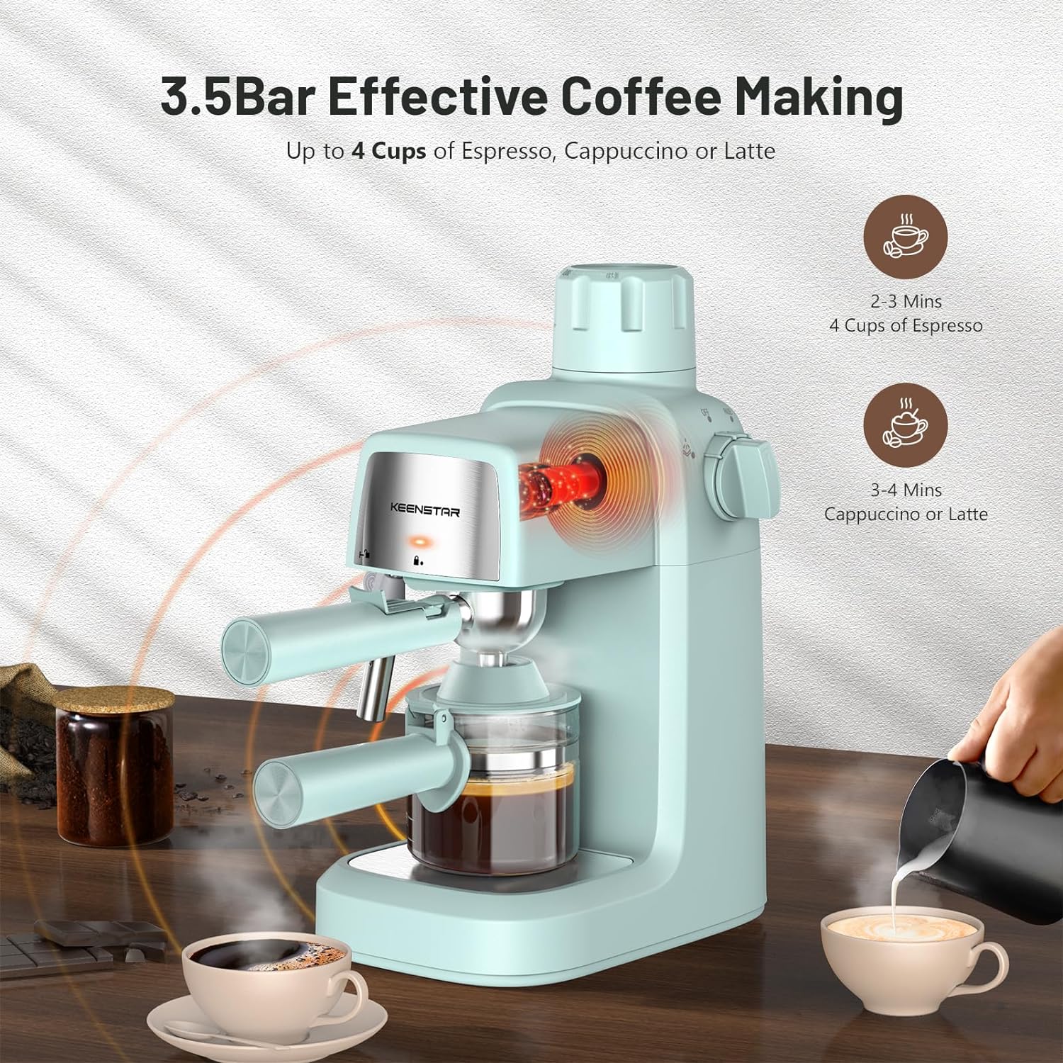 Fast Brewing Technology: Advanced heating technology makes water quickly heat to the right temperature. Keenstar 3.5 bar pressure coffee maker can make 1-4 cups (240ml) of coffee within 2 minutes. Easy-pour glass cup is clearly marked to serve the perfect amount every time and delivers a truly rich espresso in seconds.