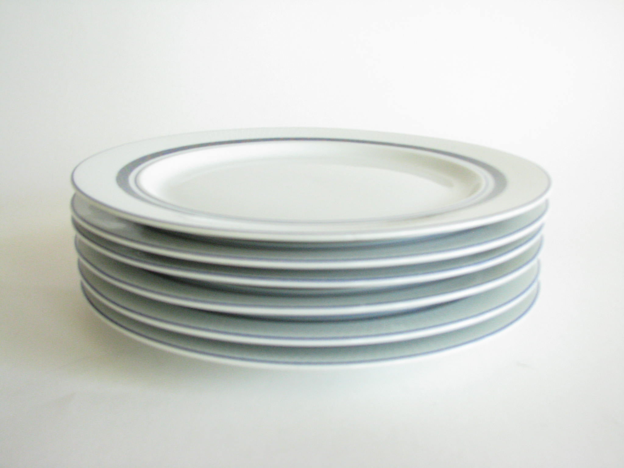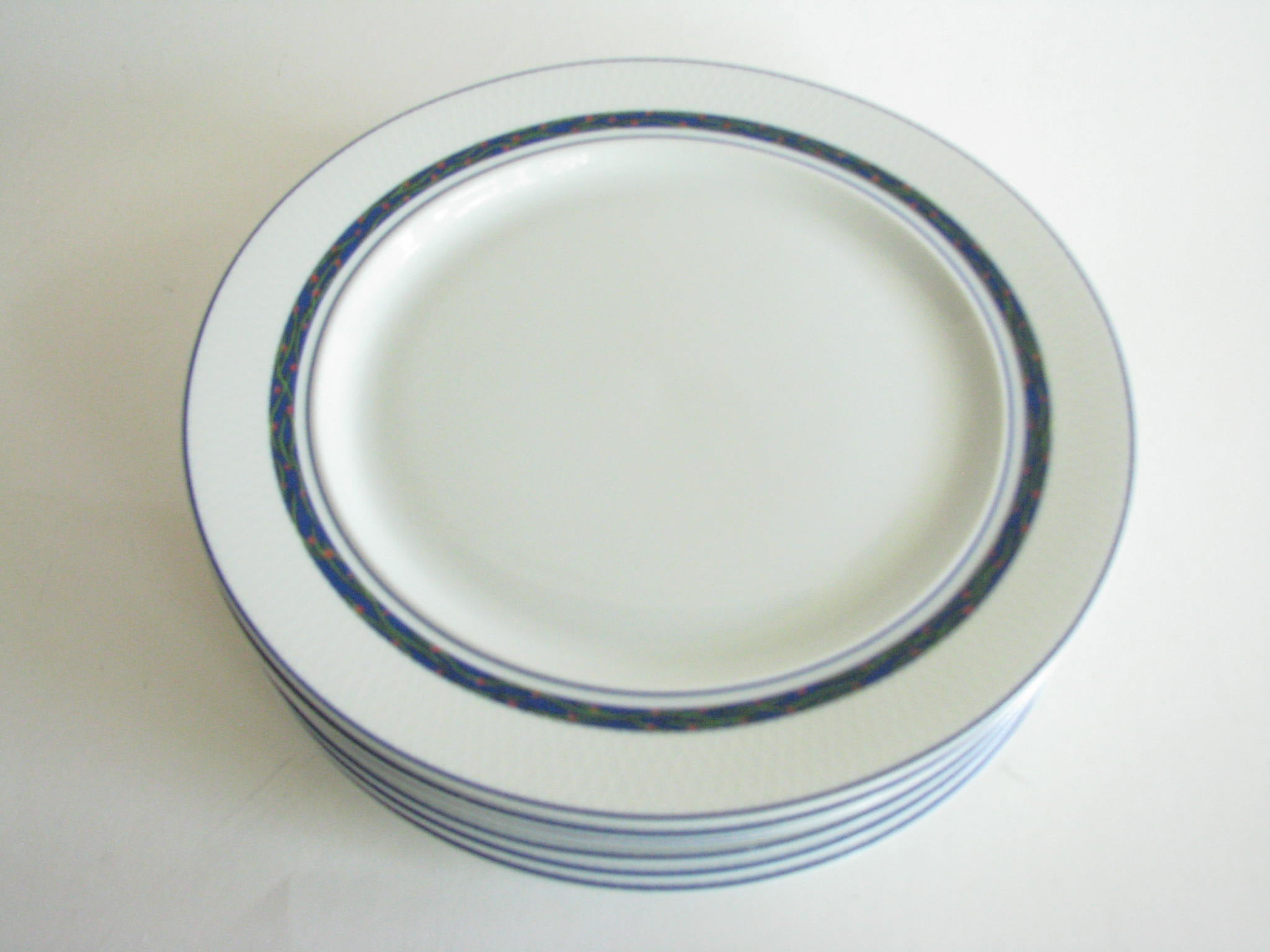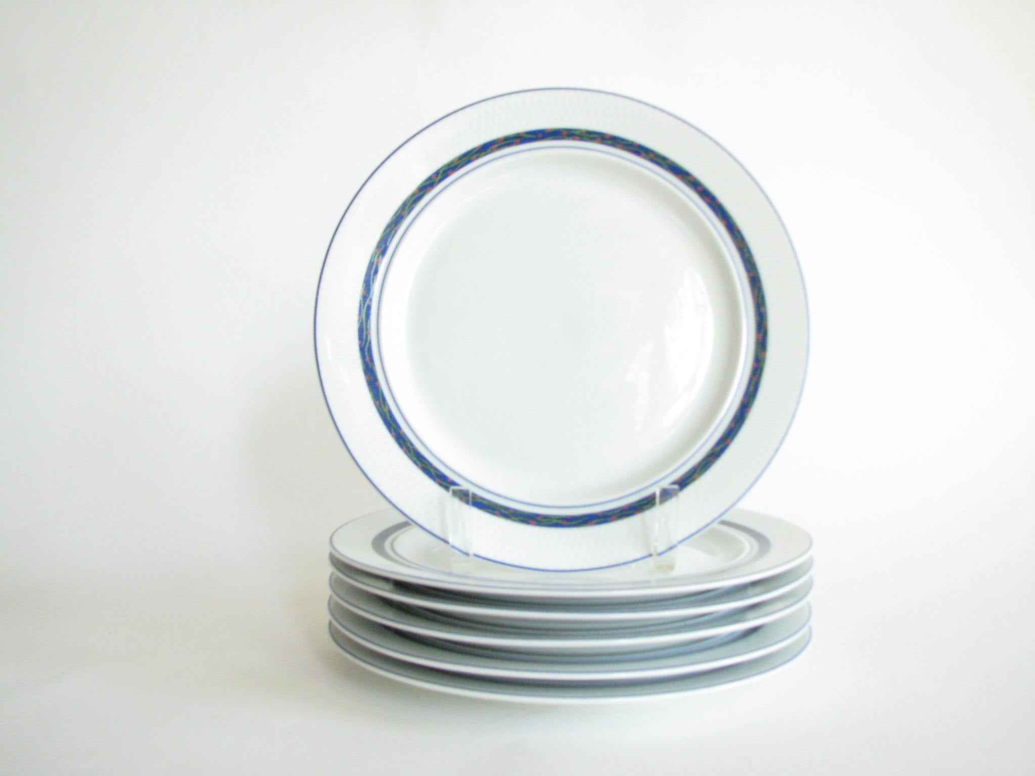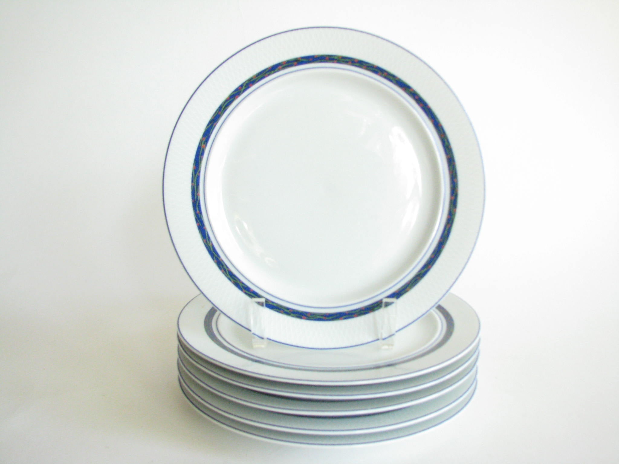 Vintage set of 6 Dansk New Scandia salad plates with blue trim and raised lattice edges.