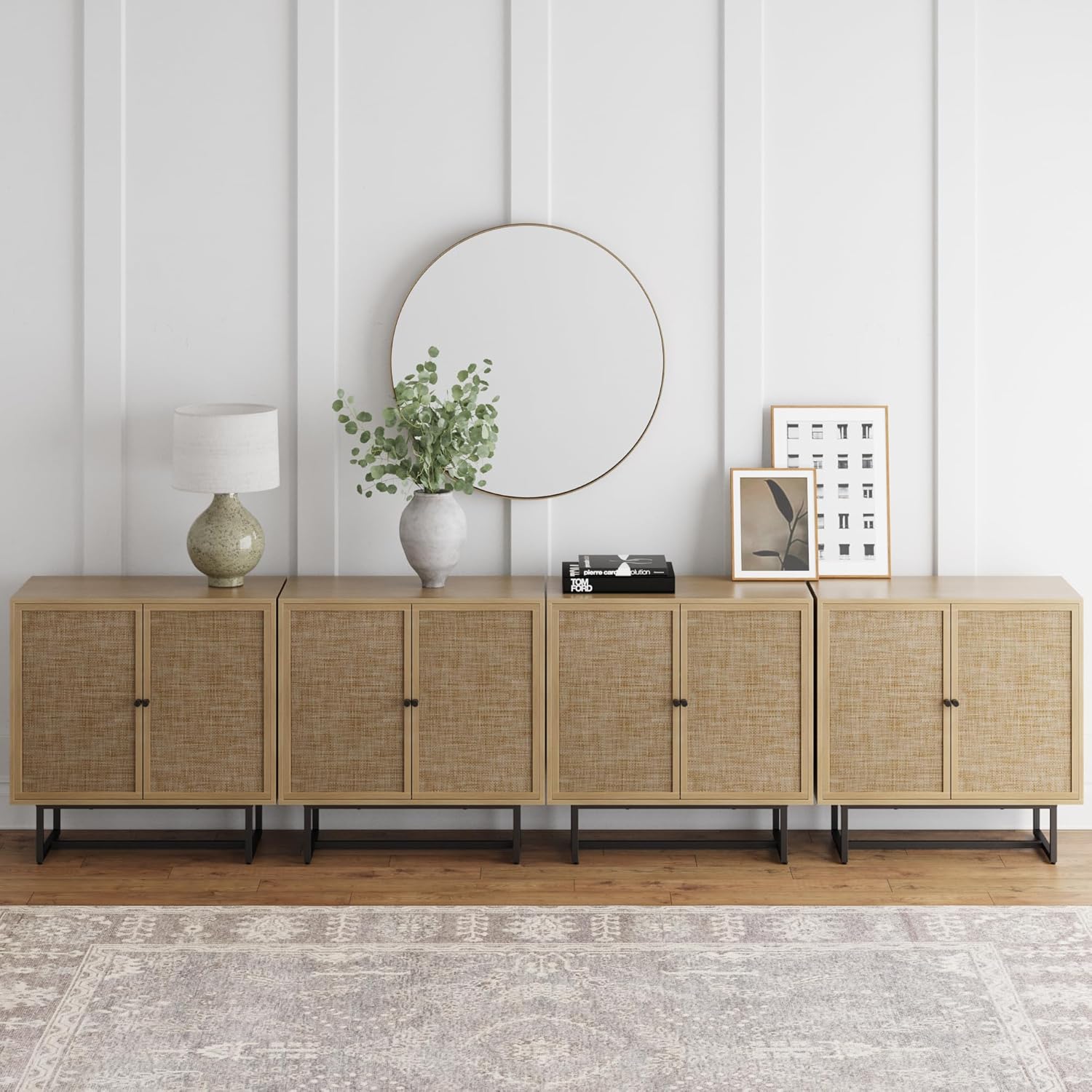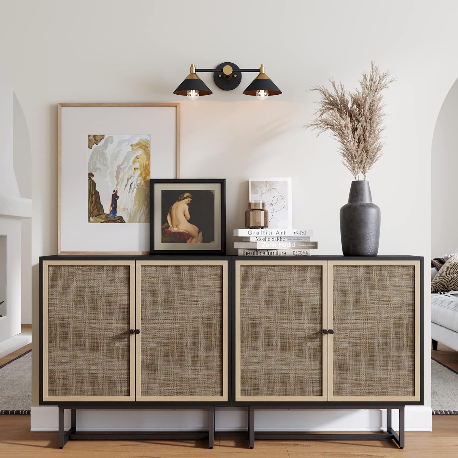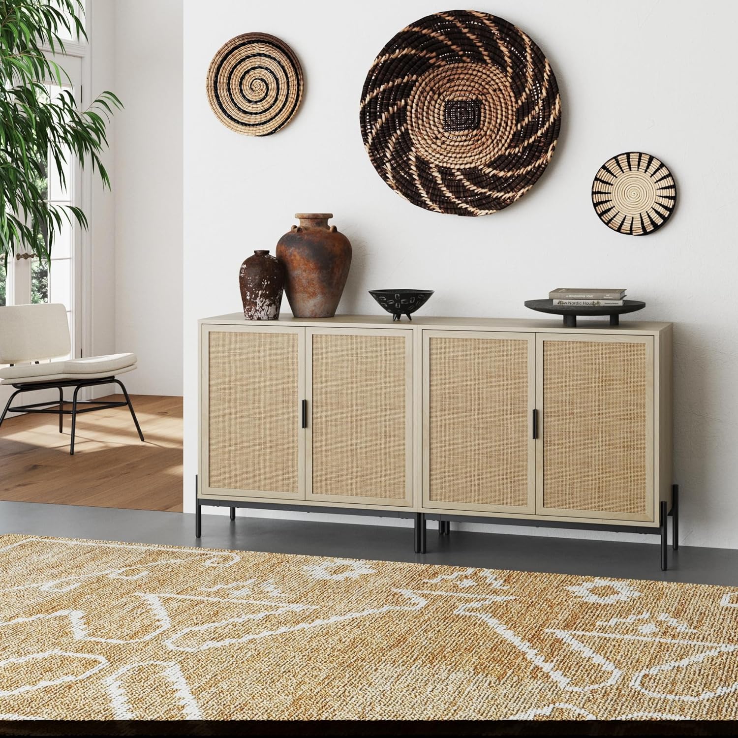 The accent cabinet or kitchen sideboard features natural rattan cabinet doors and sleek metal legs, giving it a natural yet elegant appeal.
