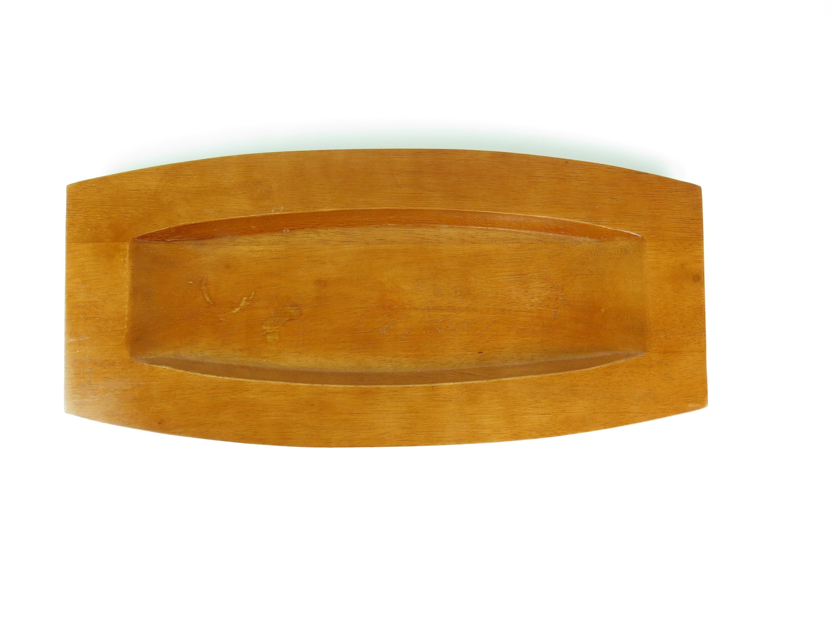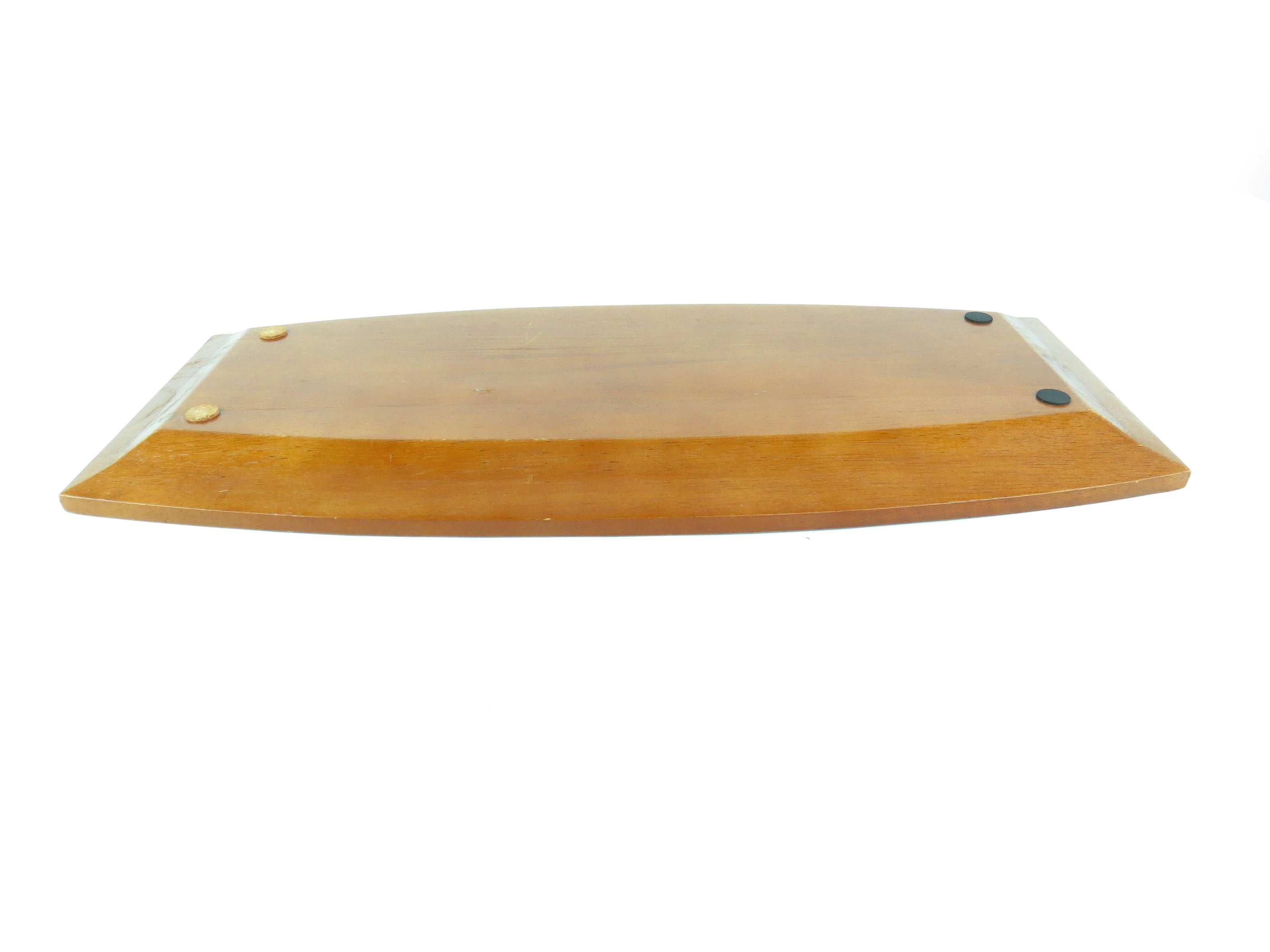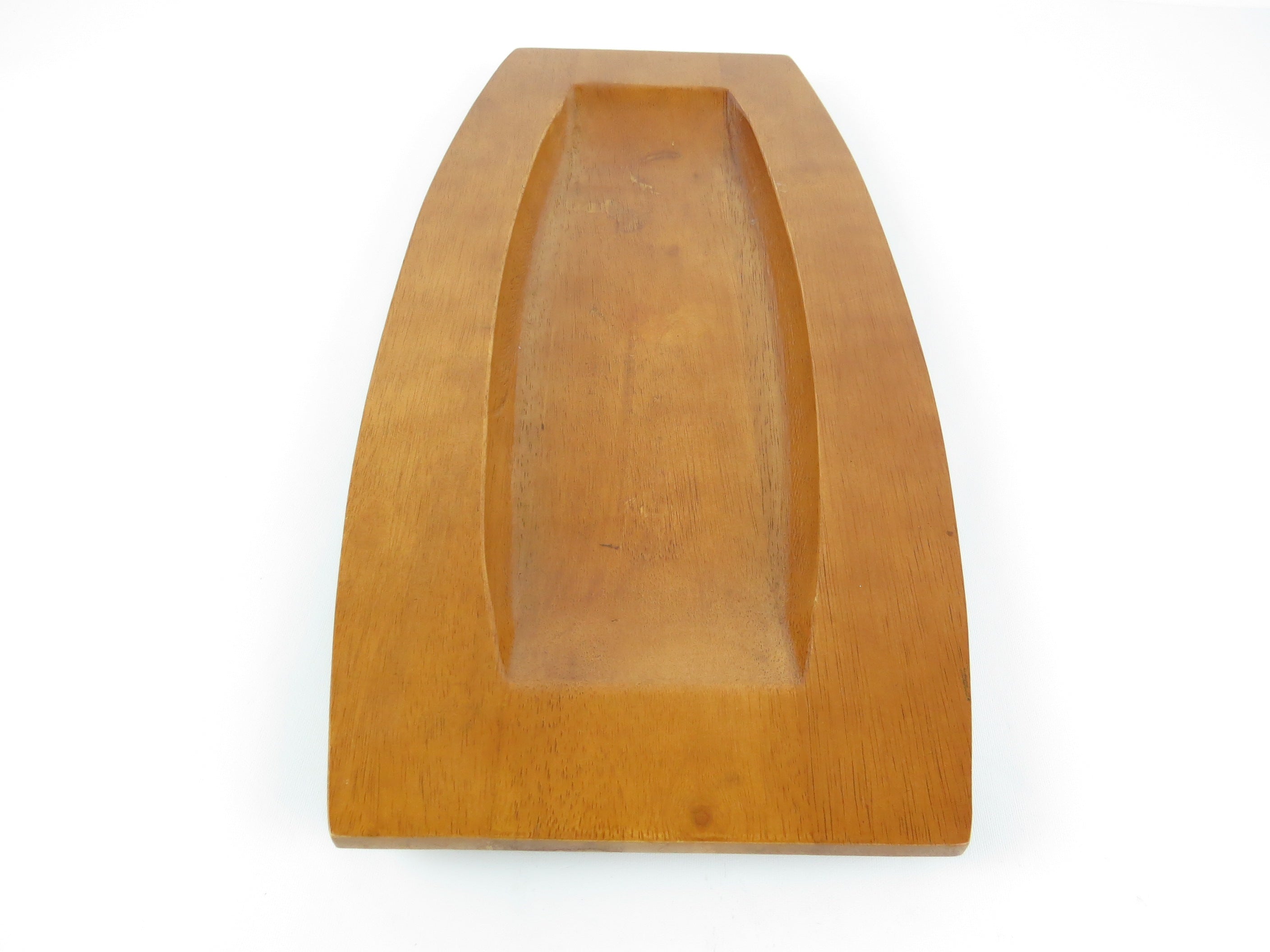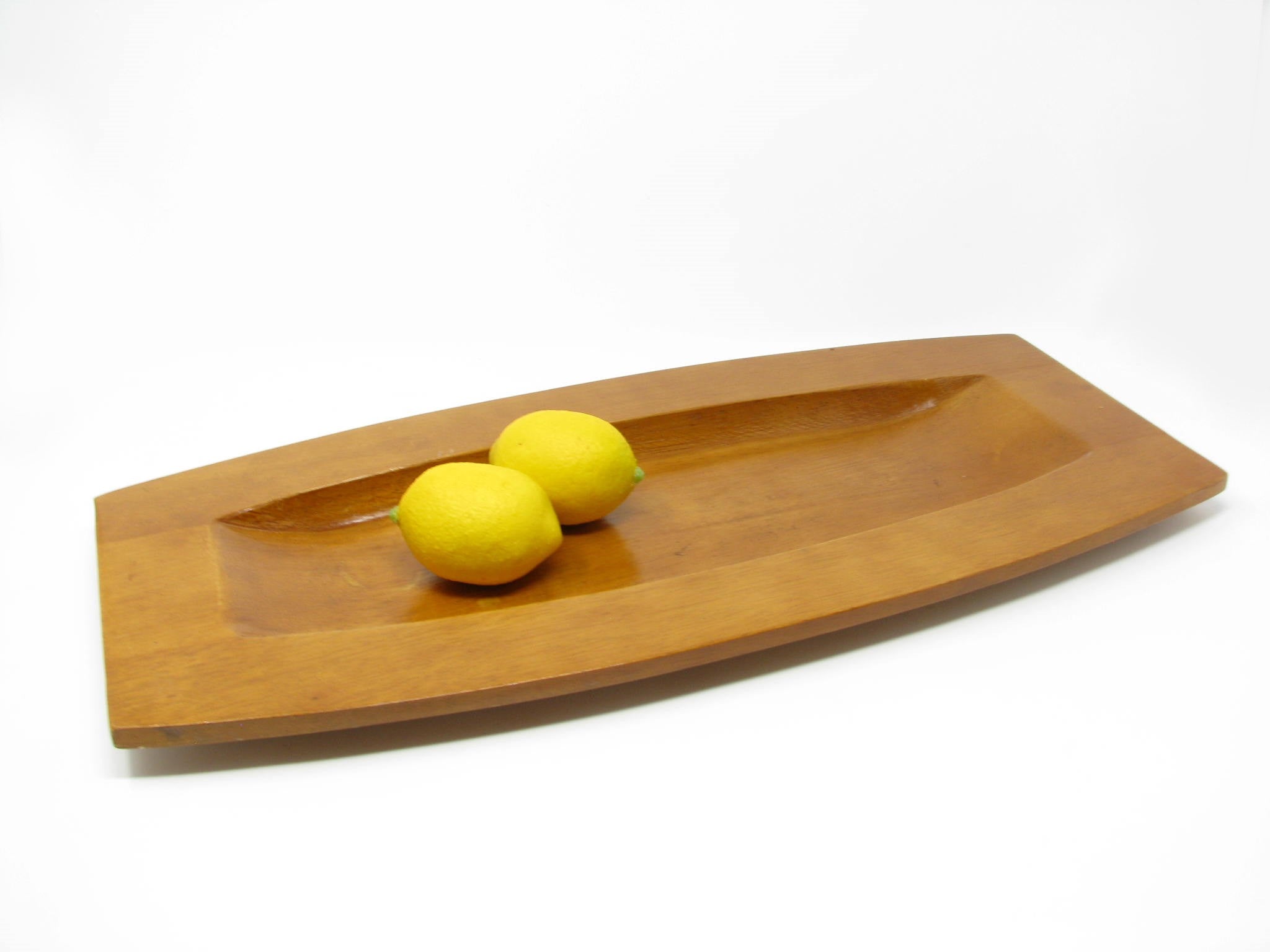 Vintage solid teak sculptural serving tray with boat shape. Faux lemons not included.