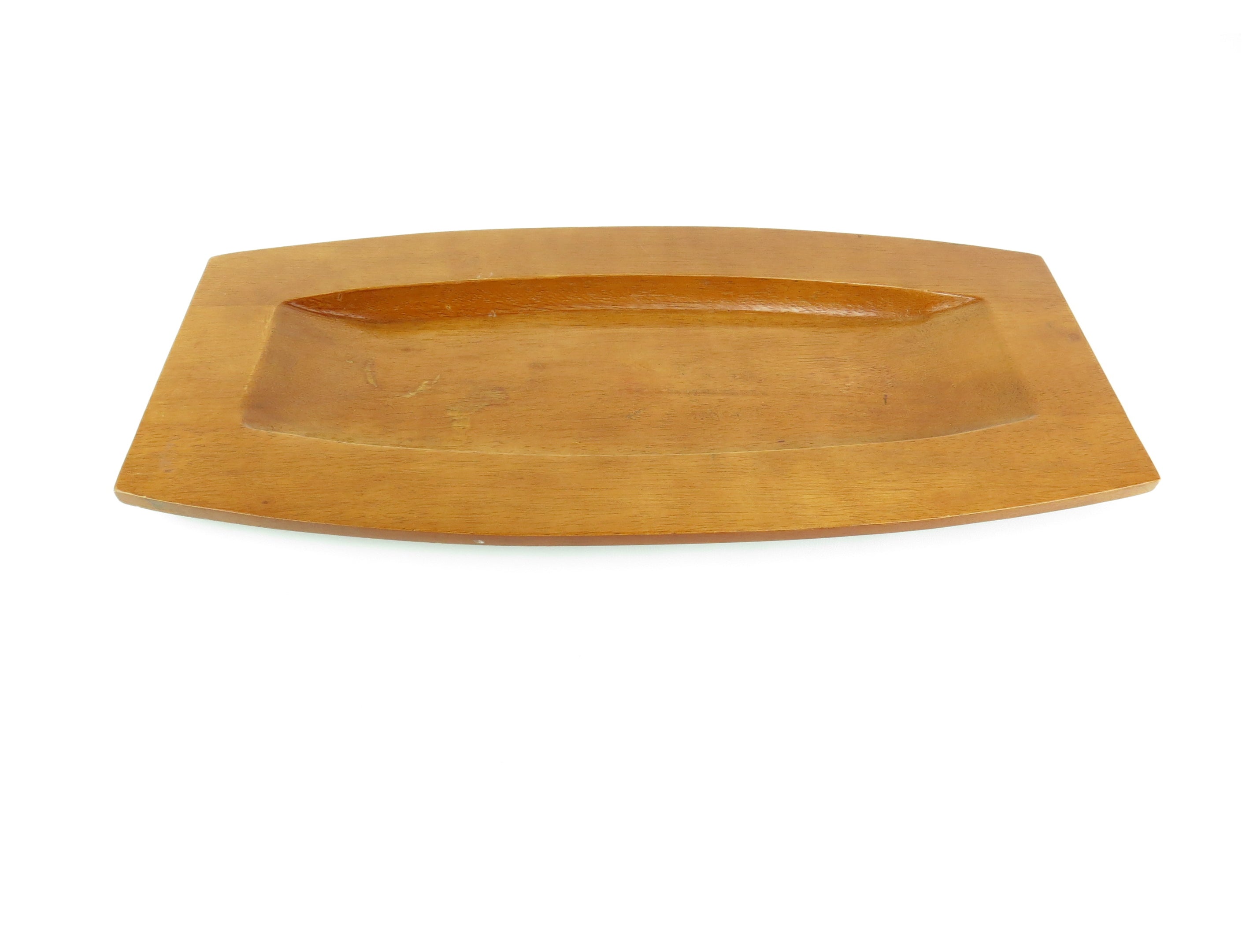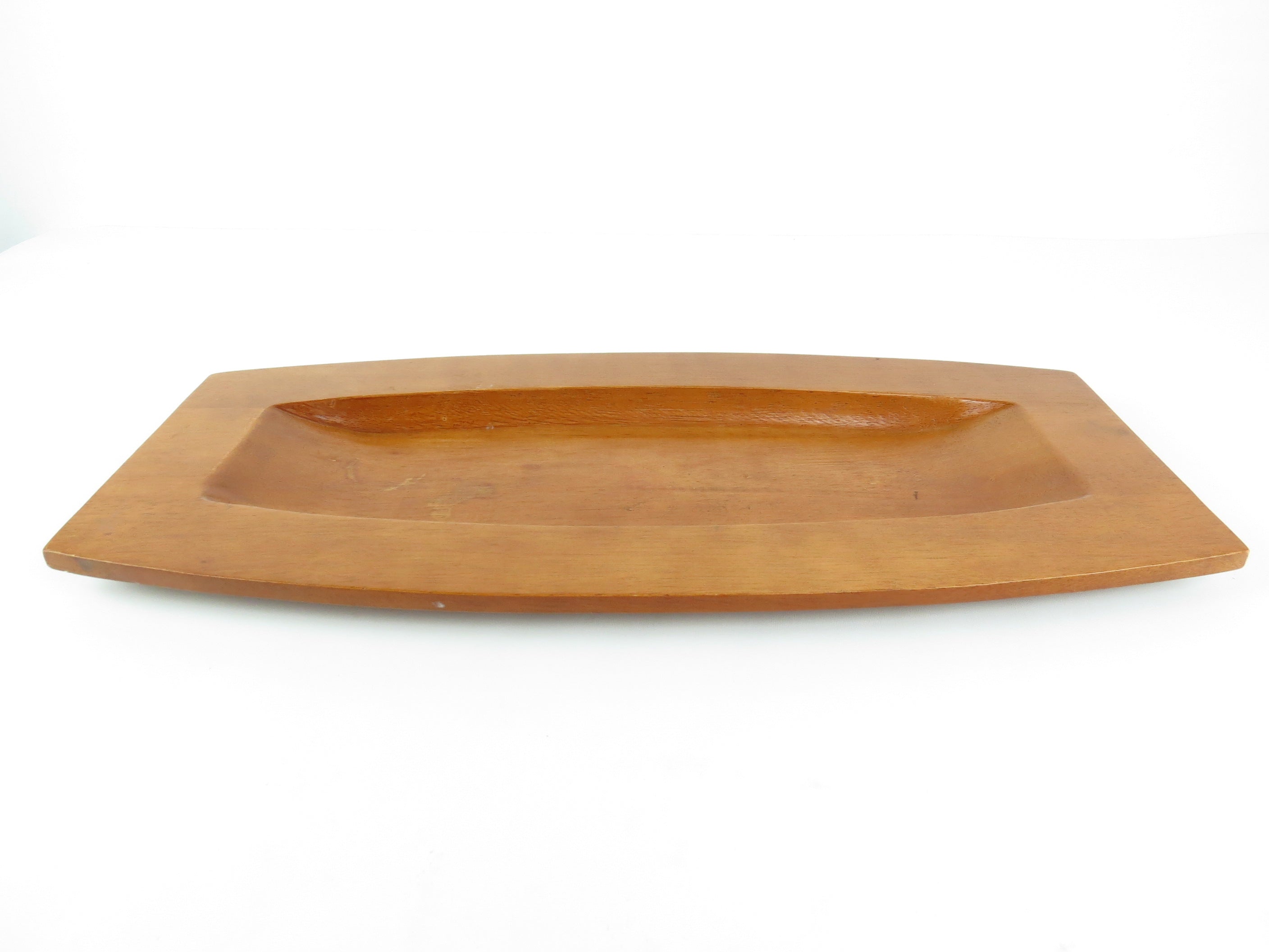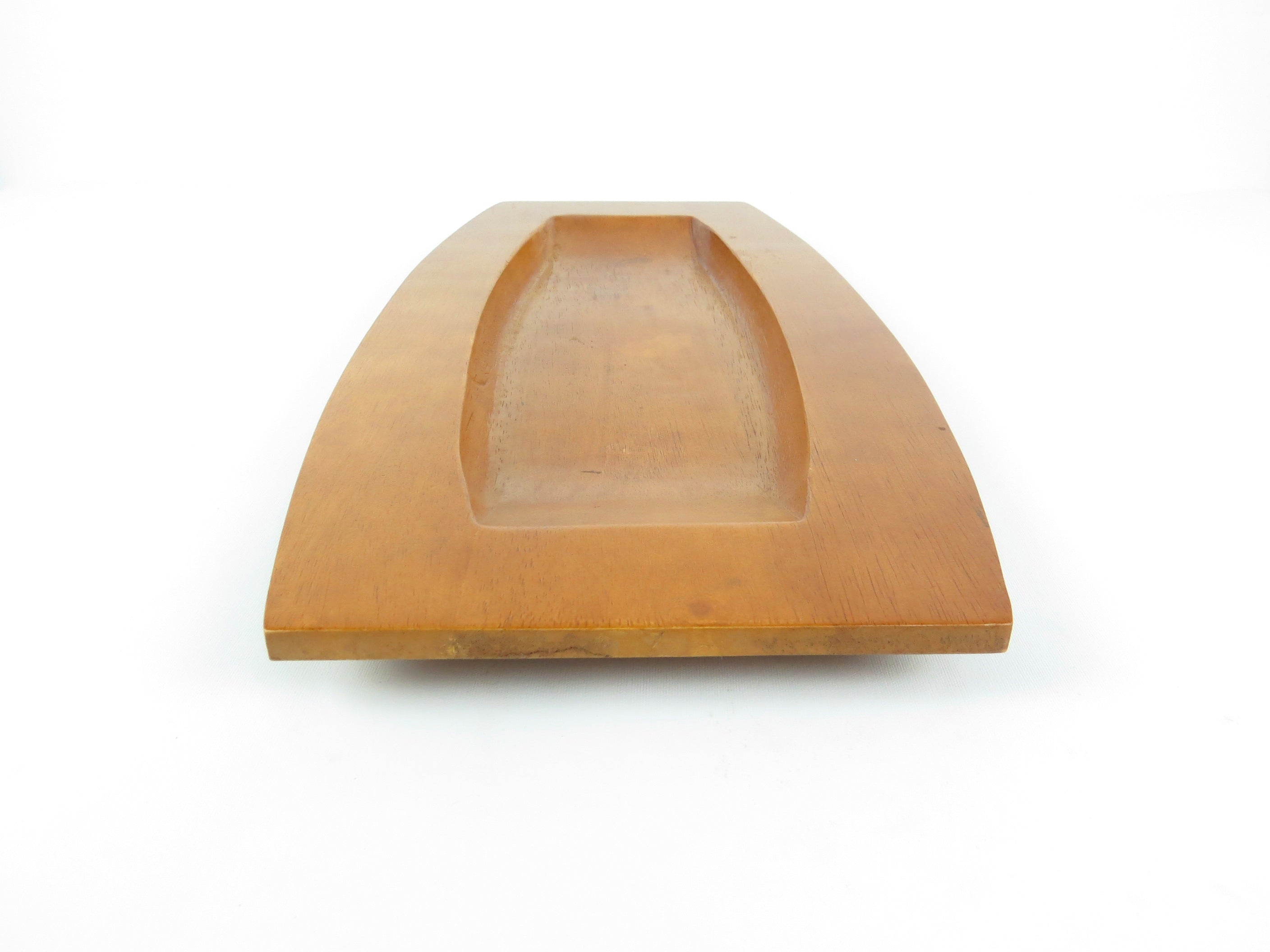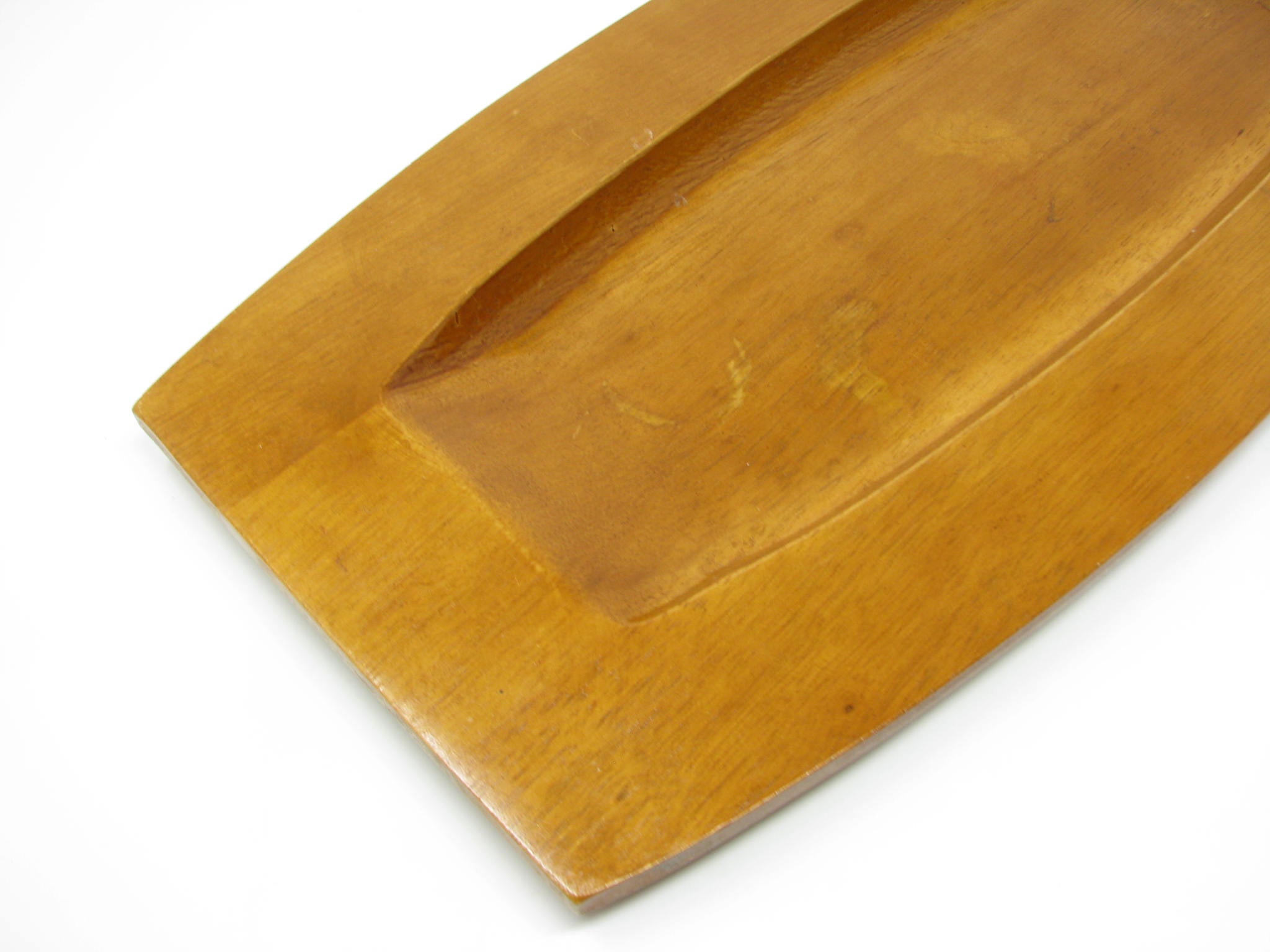 Vintage solid teak sculptural serving tray with boat shape. Faux lemons not included.