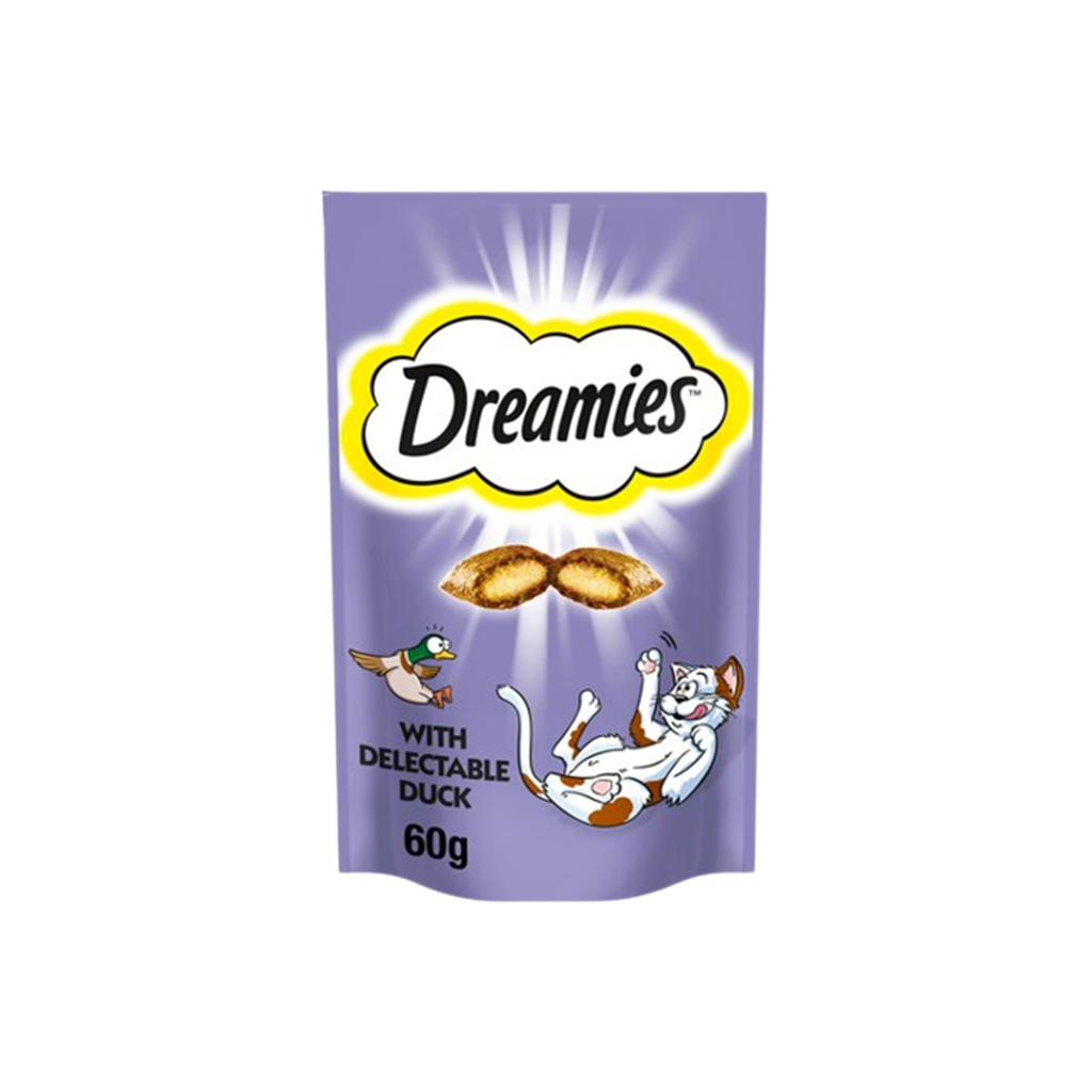 - DREAMIES cat treats are packed full of things cats love. Share moments with your feline friend with these dual-texture treats with an enticingly crunchy outside and a soft inside. DREAMIES with Delectable Duck contains vitamins and minerals, at just 2 calories per treat. So go on, give the bag a shake and watch your cat come running!