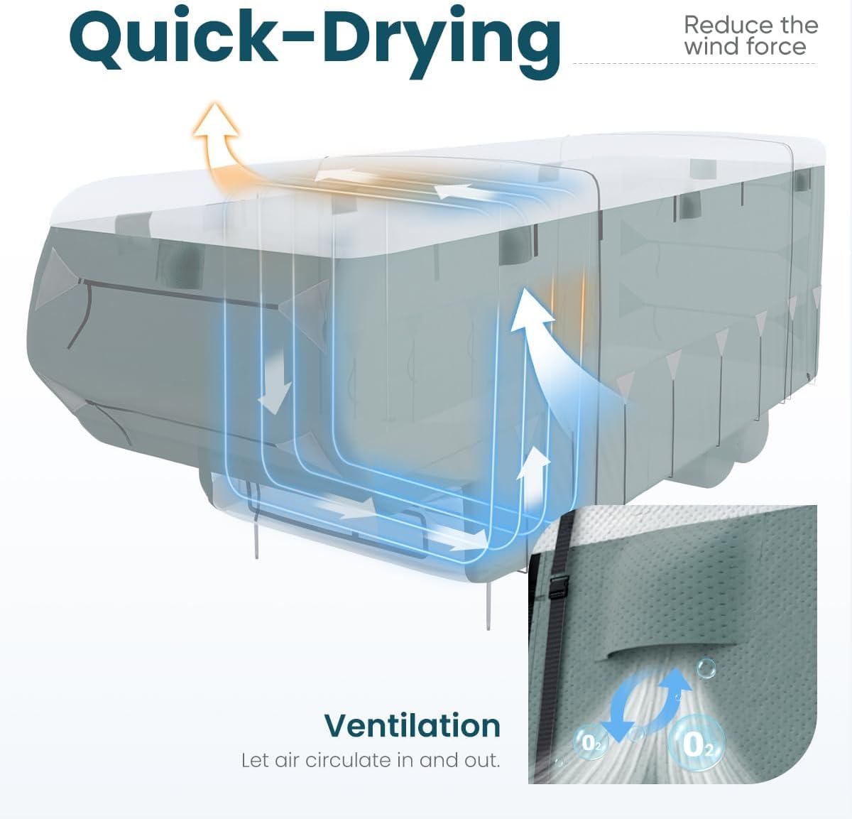 ✅【WIND PROOF】–The change of position of the middle tension panels on the side effectively increases the stress area and provide 2pcs extra straps to tie the body of your RV. we lead the windproof design of tension panel & windproof straps, and we believe that our innovative spirit and professionalism for rv covers cannot be imitated