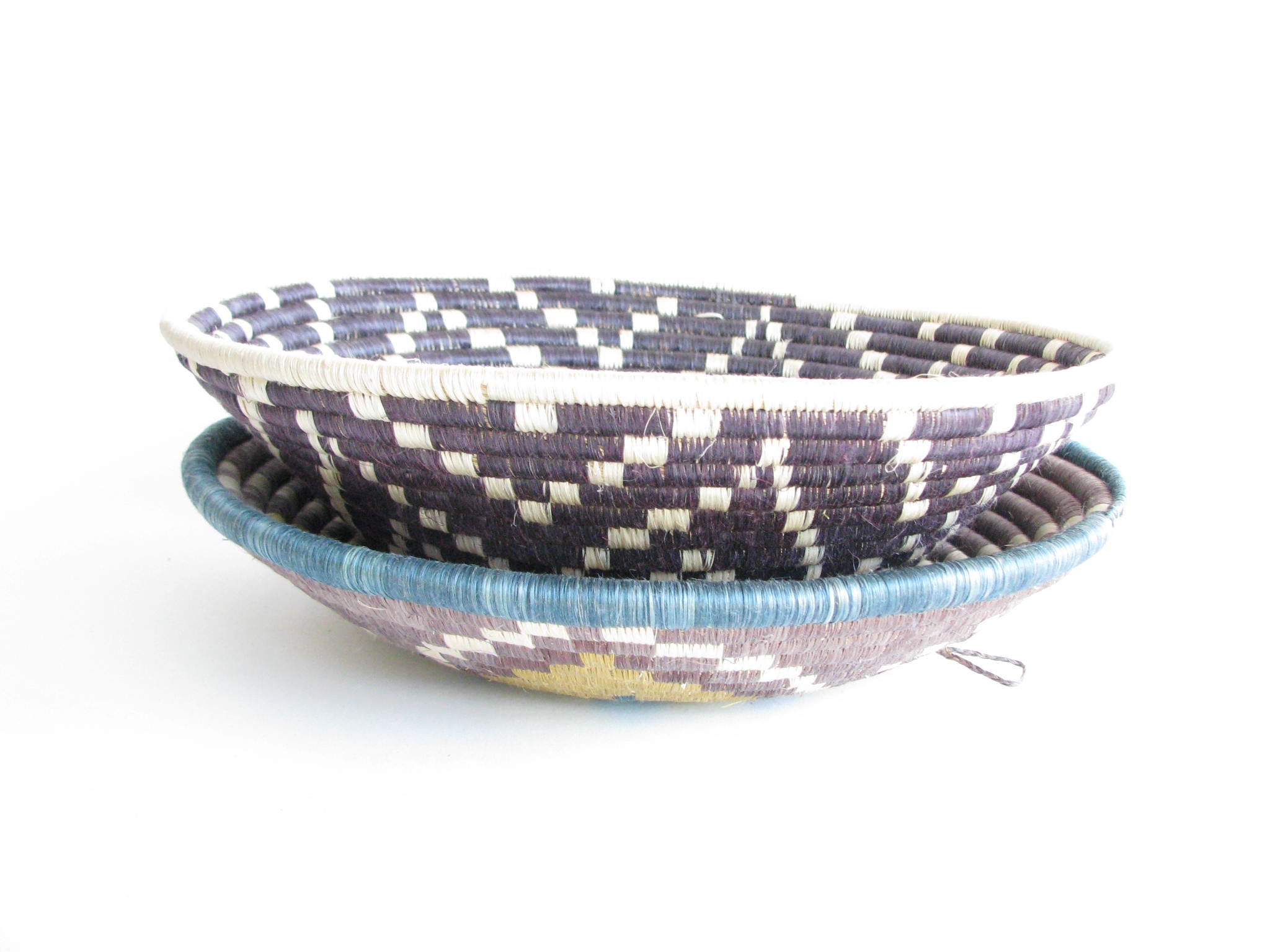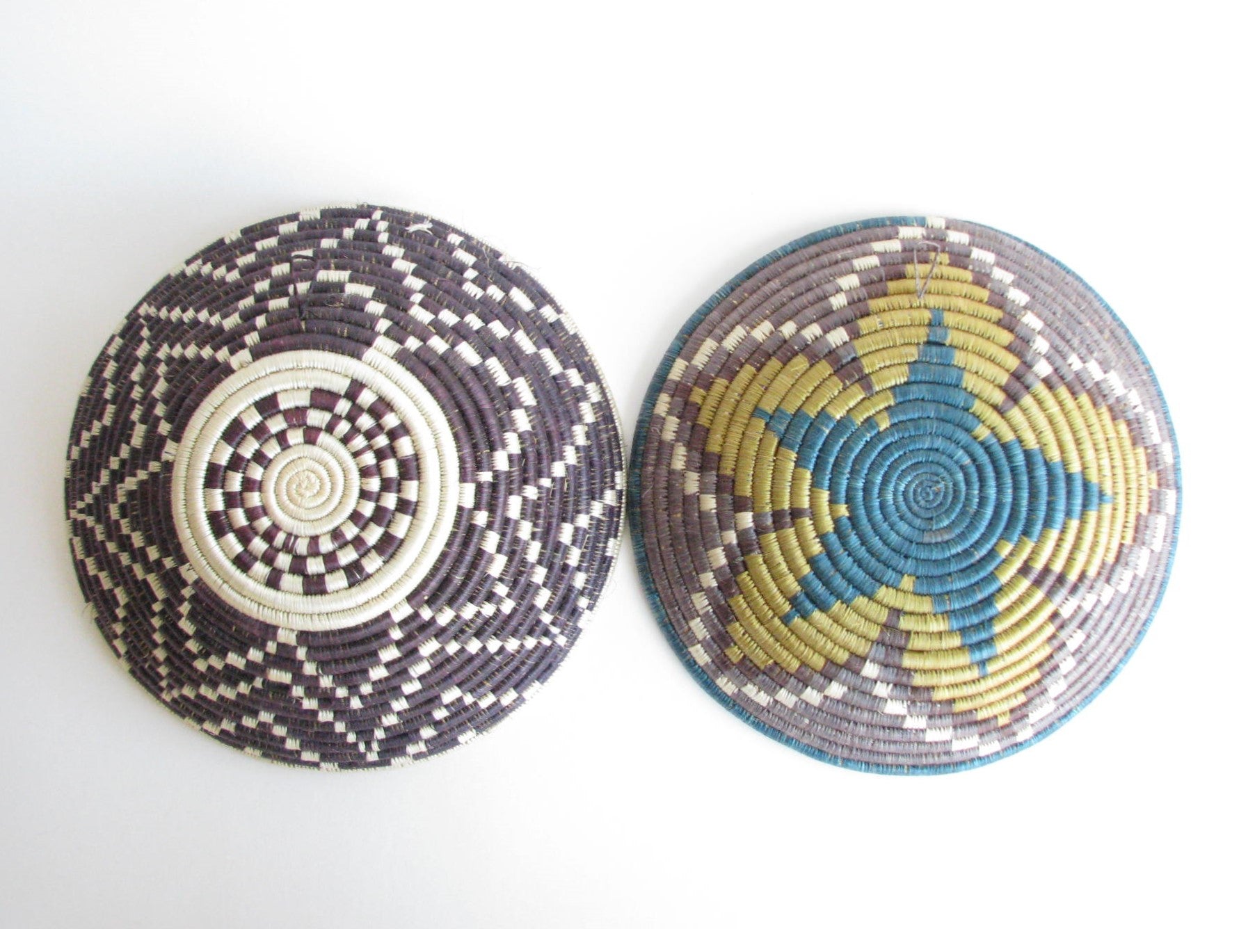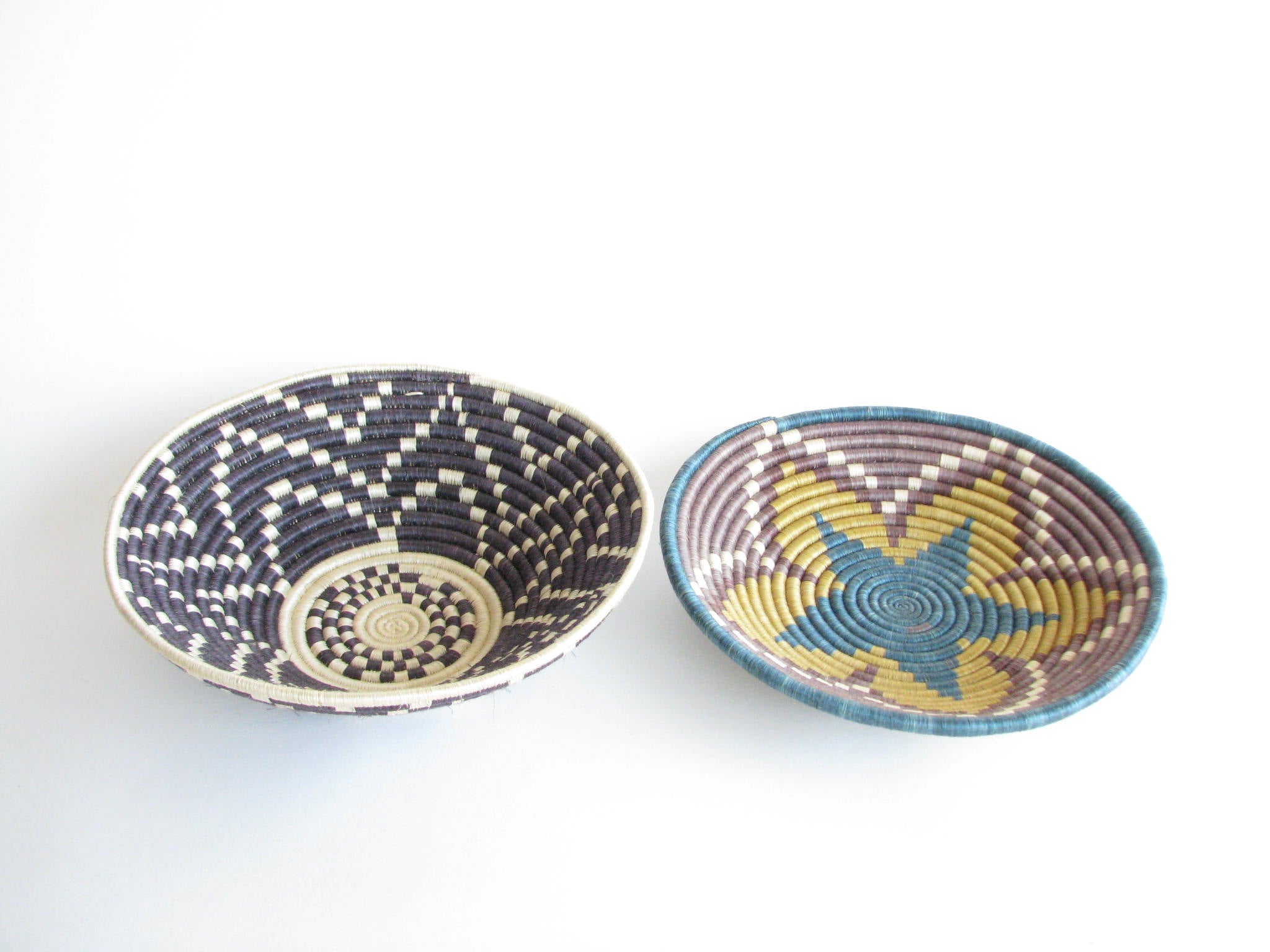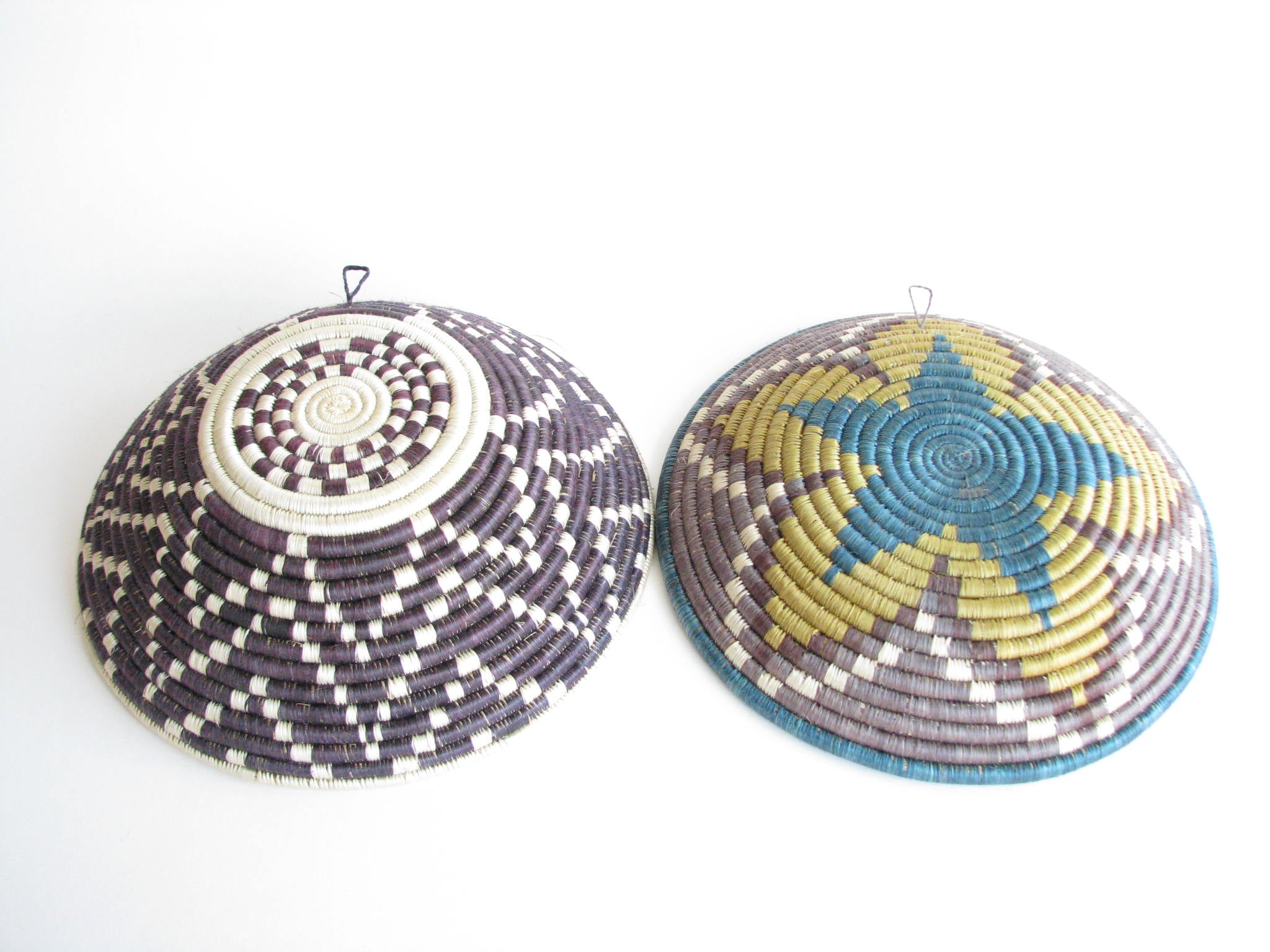 Vintage set of 2 African hand-woven sisal and sweetgrass baskets. Sisal fiber is extracted from the plant, hand-dyed and woven with ability and patience around the sweetgrass. It typically takes two days to create each work of art and they are typically made by local female artisans. Each basket has a loop on the back making it easy to hang on a wall.