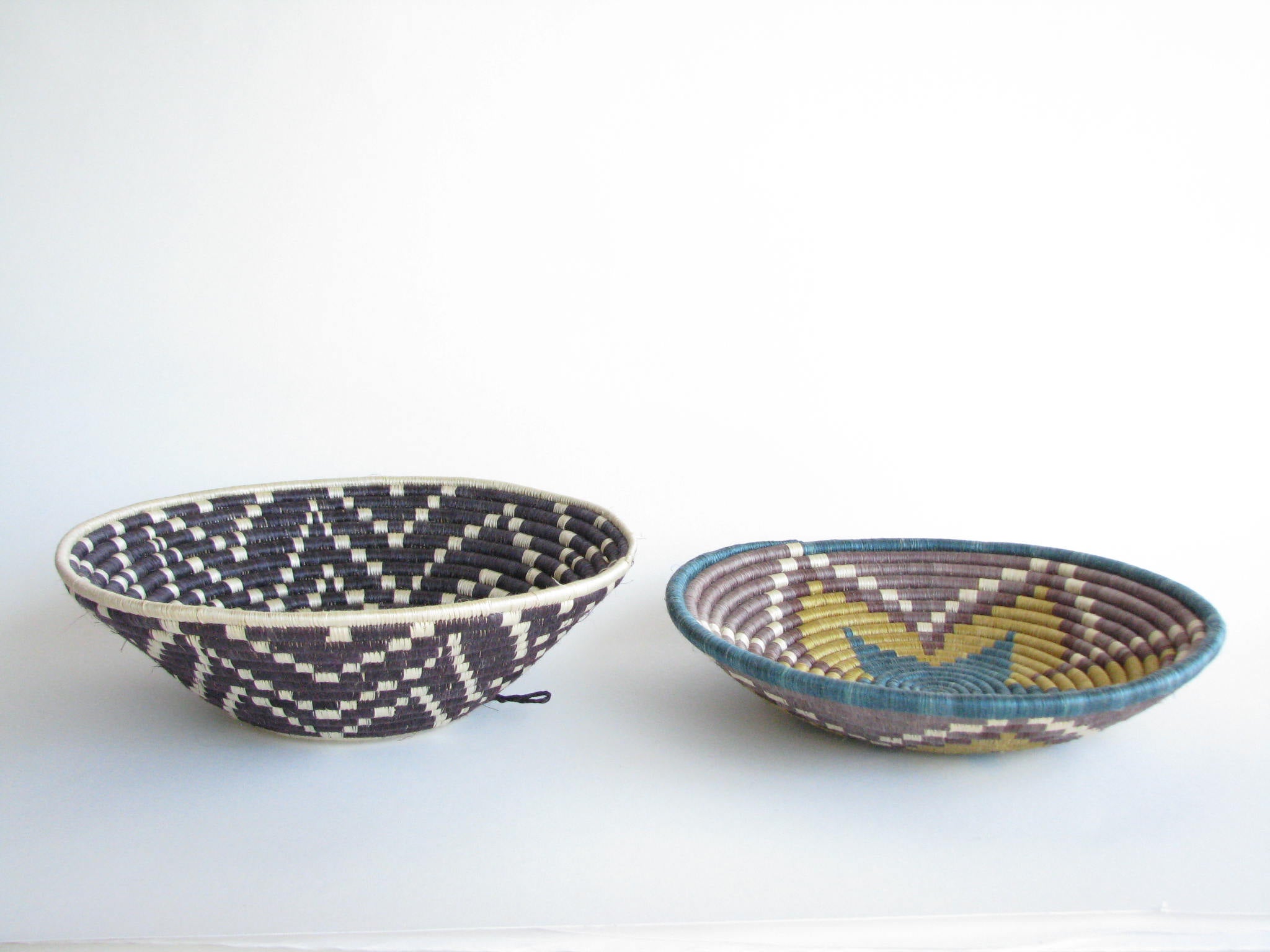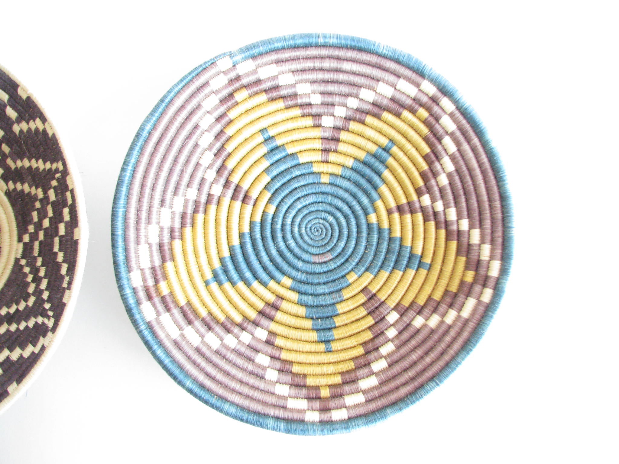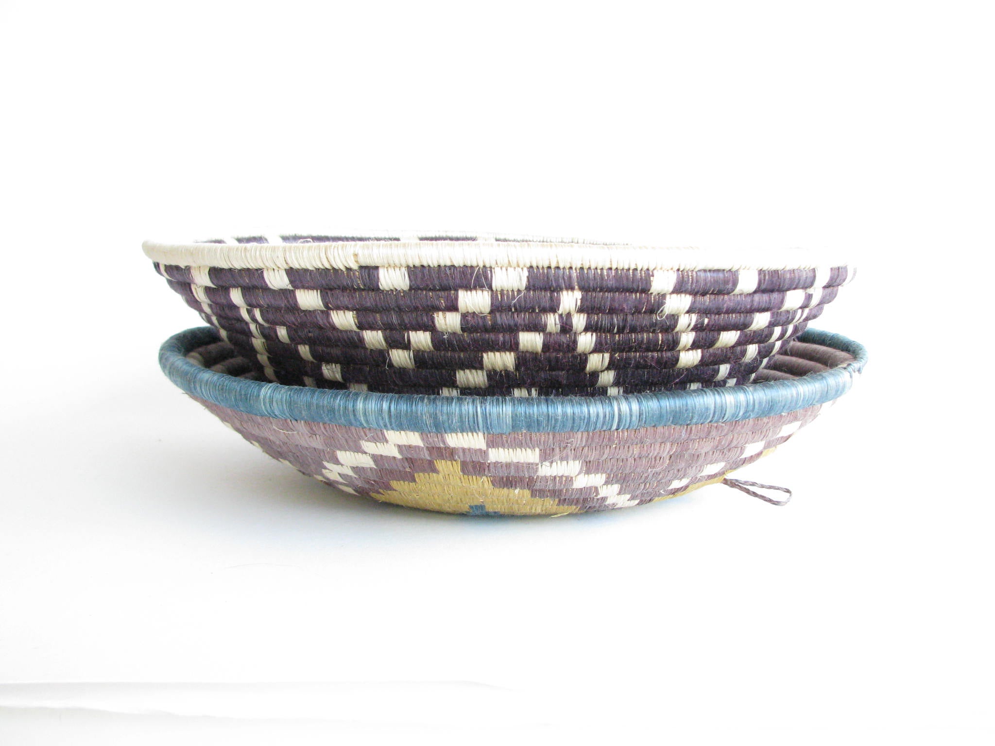 Vintage set of 2 African hand-woven sisal and sweetgrass baskets. Sisal fiber is extracted from the plant, hand-dyed and woven with ability and patience around the sweetgrass. It typically takes two days to create each work of art and they are typically made by local female artisans. Each basket has a loop on the back making it easy to hang on a wall.