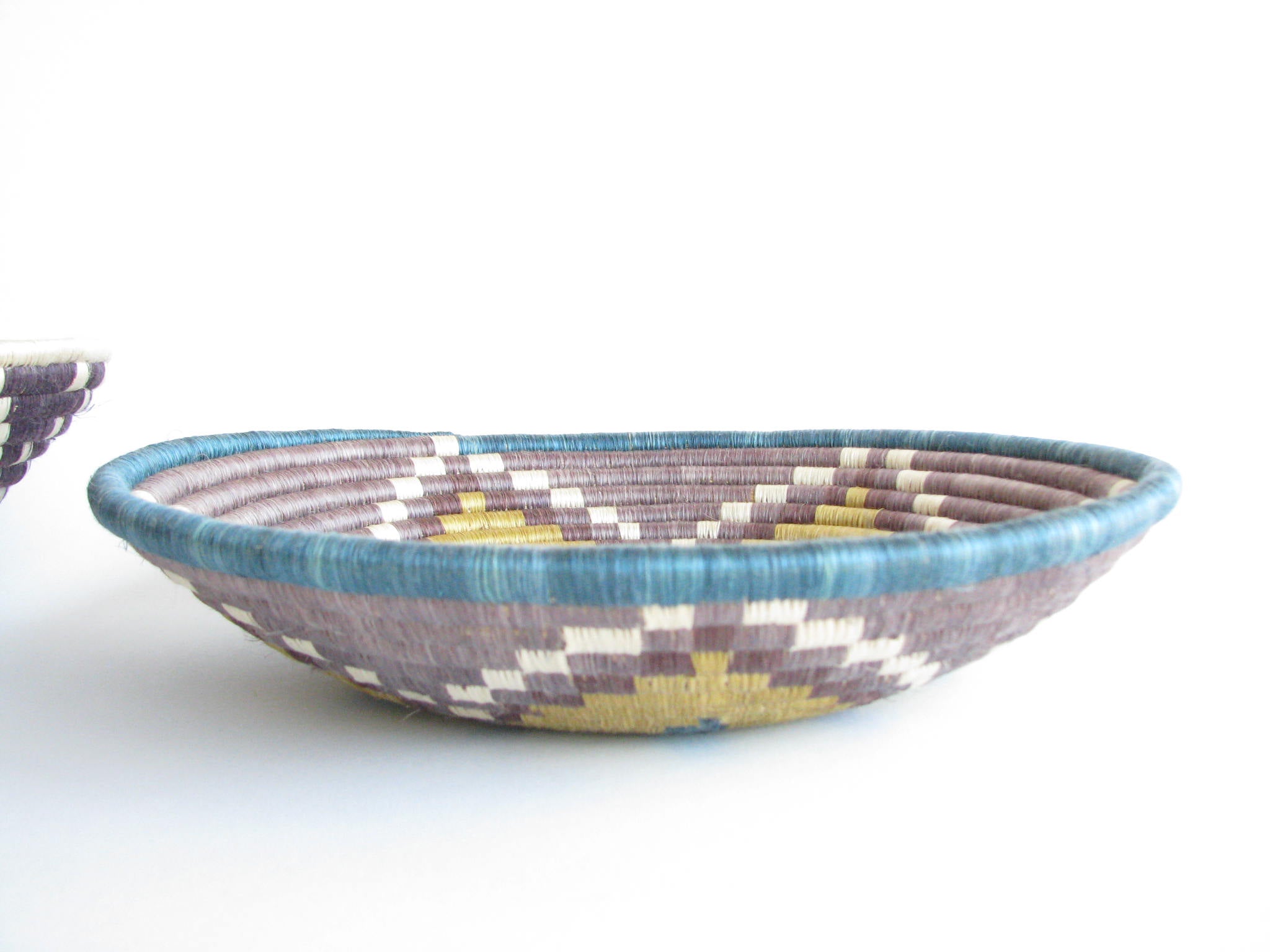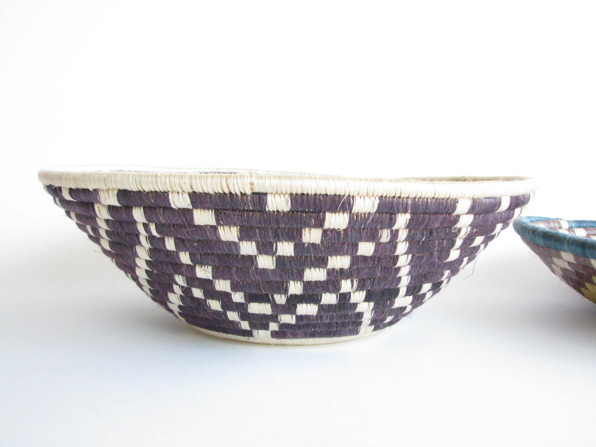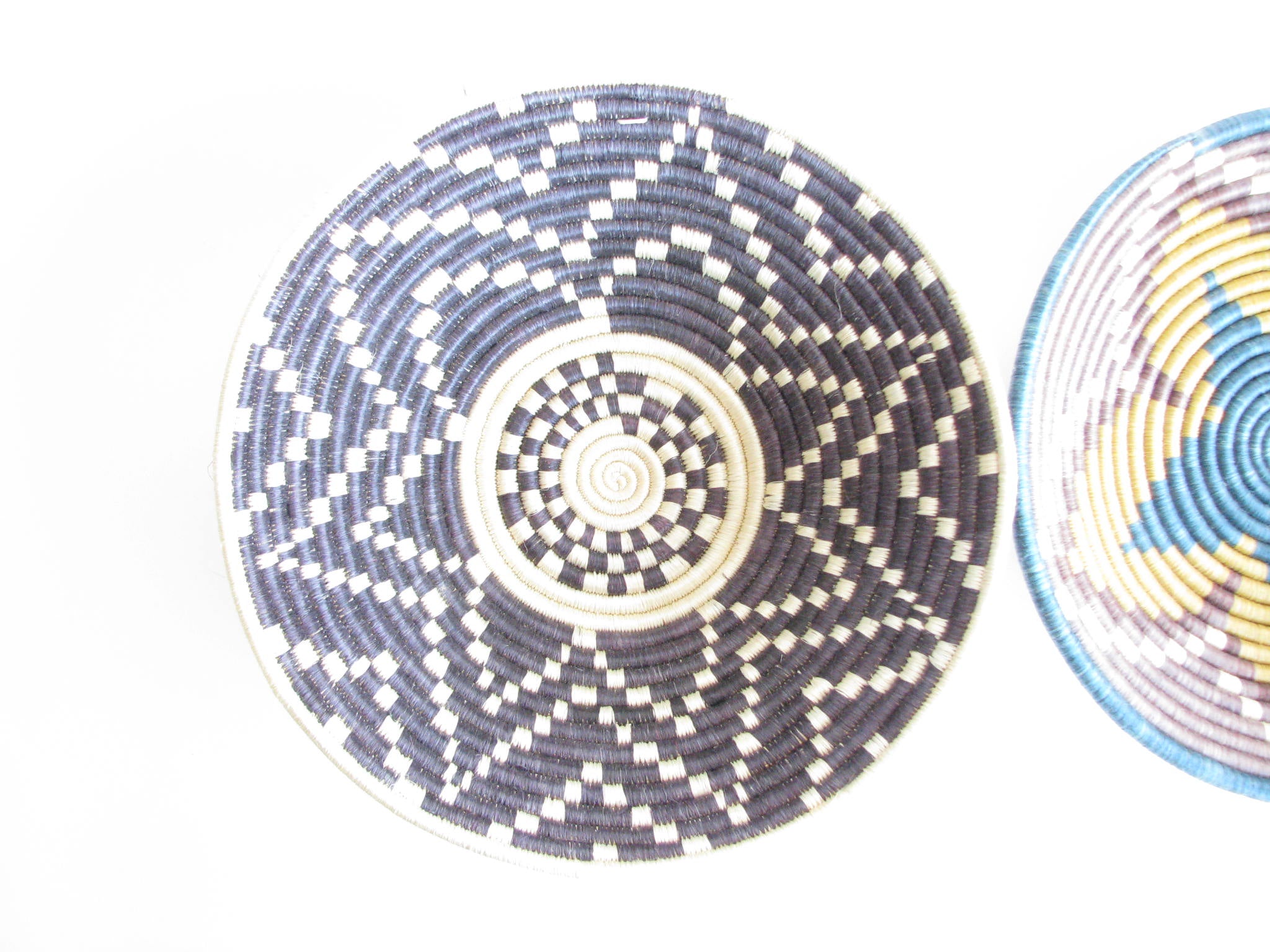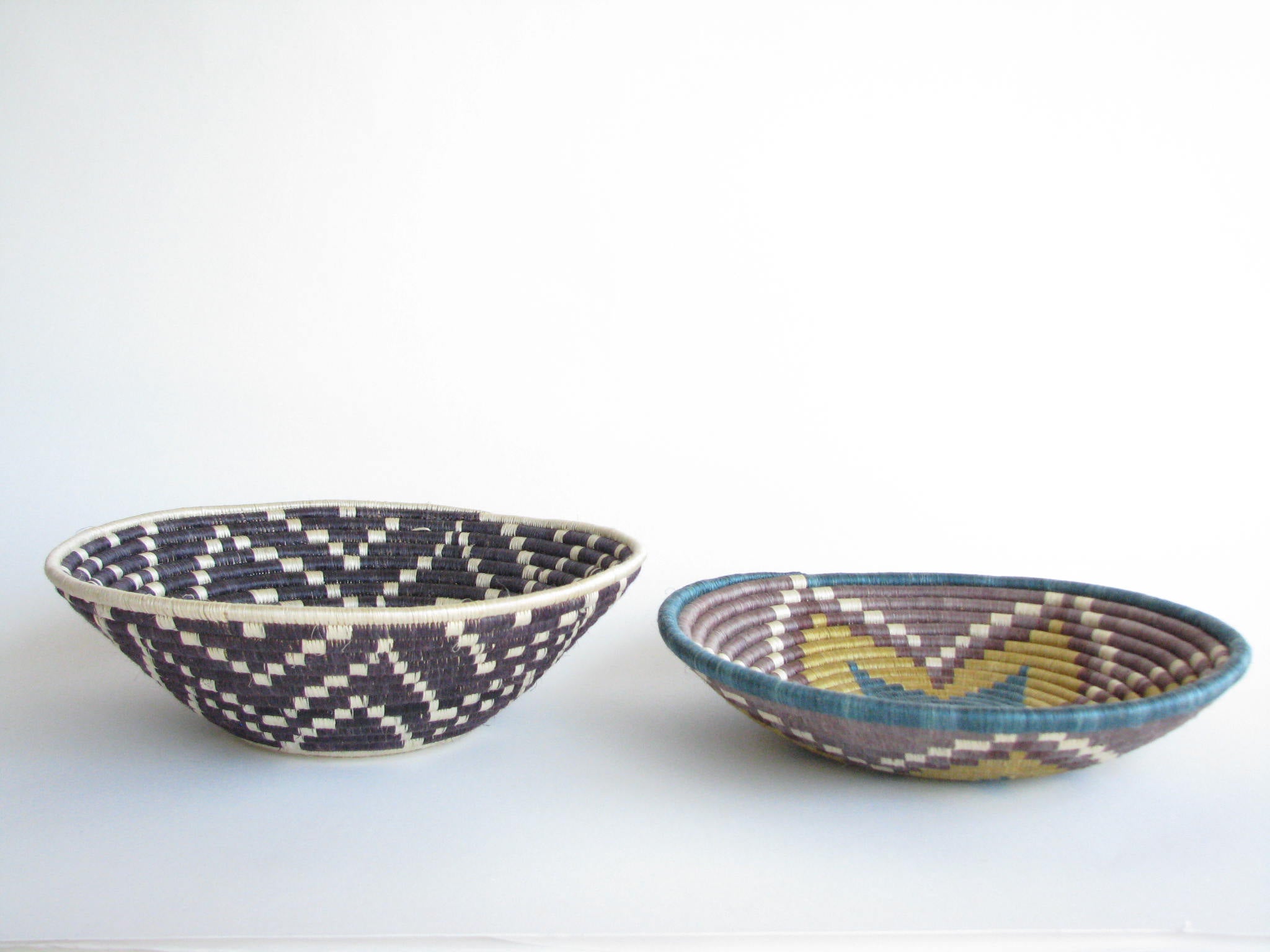 Vintage set of 2 African hand-woven sisal and sweetgrass baskets. Sisal fiber is extracted from the plant, hand-dyed and woven with ability and patience around the sweetgrass. It typically takes two days to create each work of art and they are typically made by local female artisans. Each basket has a loop on the back making it easy to hang on a wall.