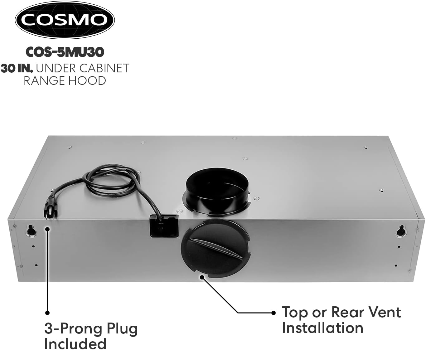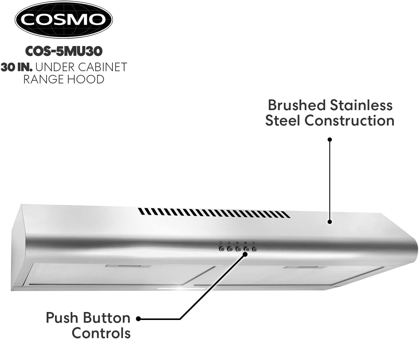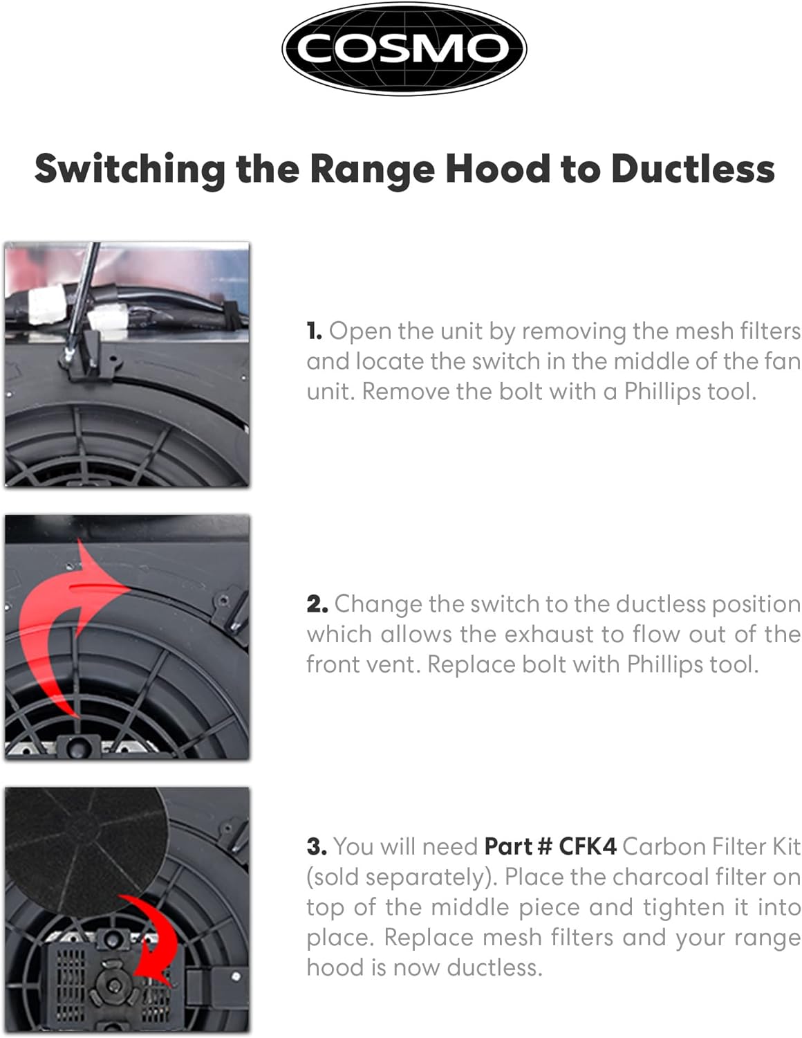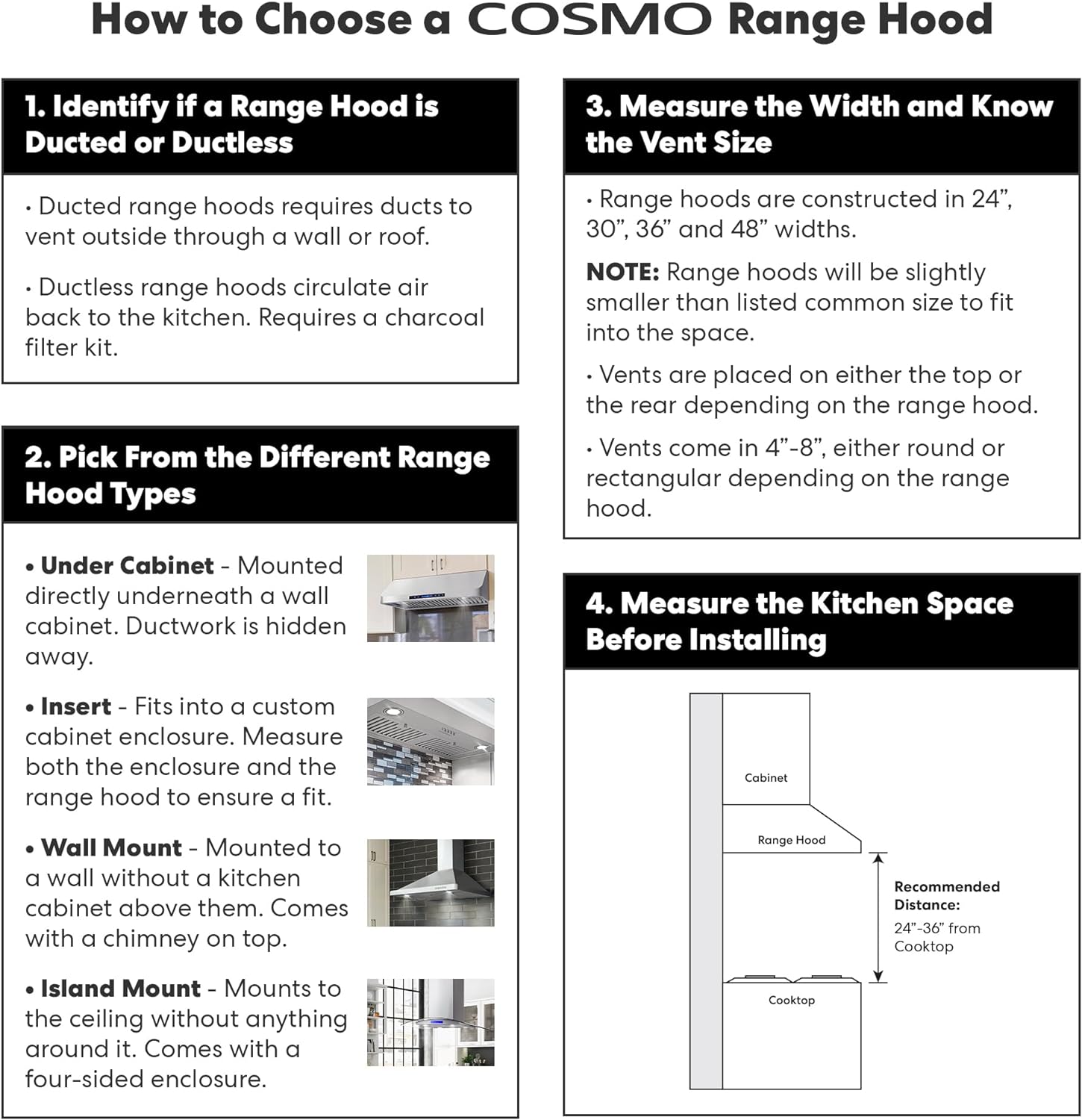 EFFICIENT YET QUIET: 3-speed motor, with a noise level as low as 50 dB on lowest fan speed with rigid ducting (sold separately) under optimal conditions; range hood comes with flexible ducting for convenient installation. Cosmo’s vent hood filters your kitchen without the loudness and sounds of competing range hoods