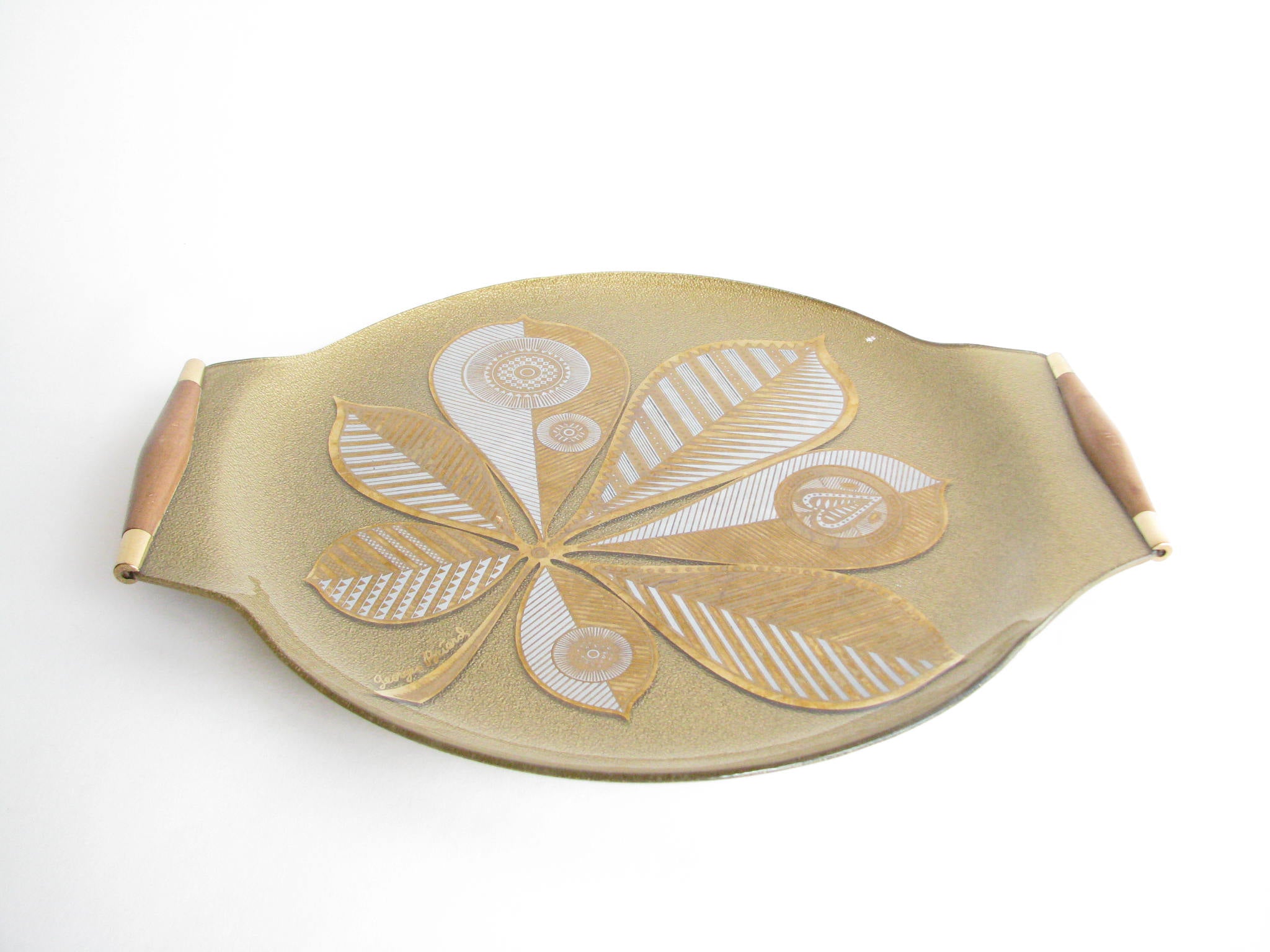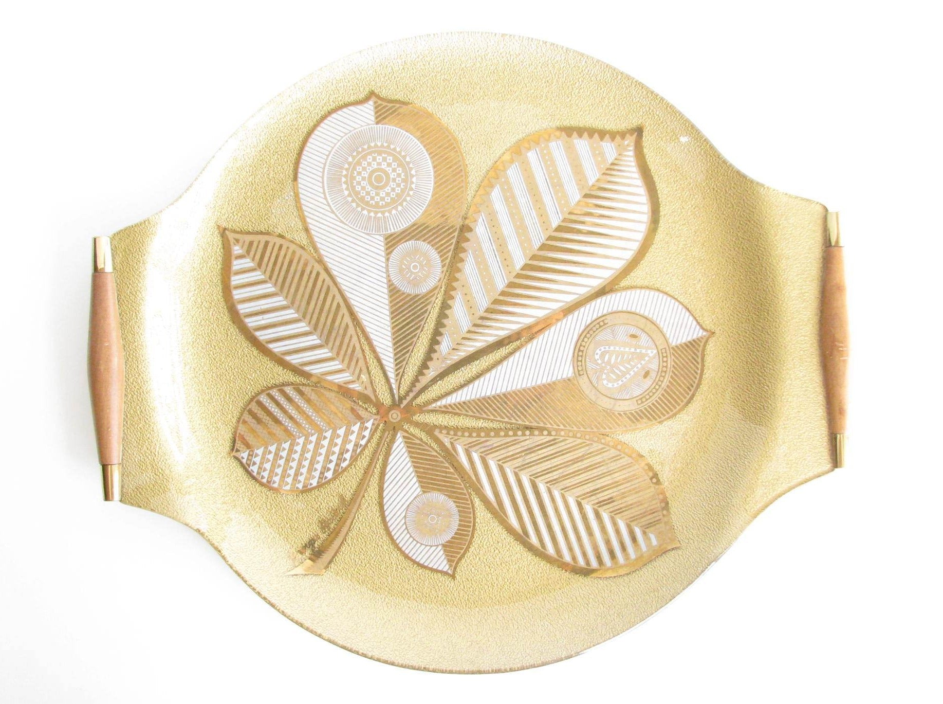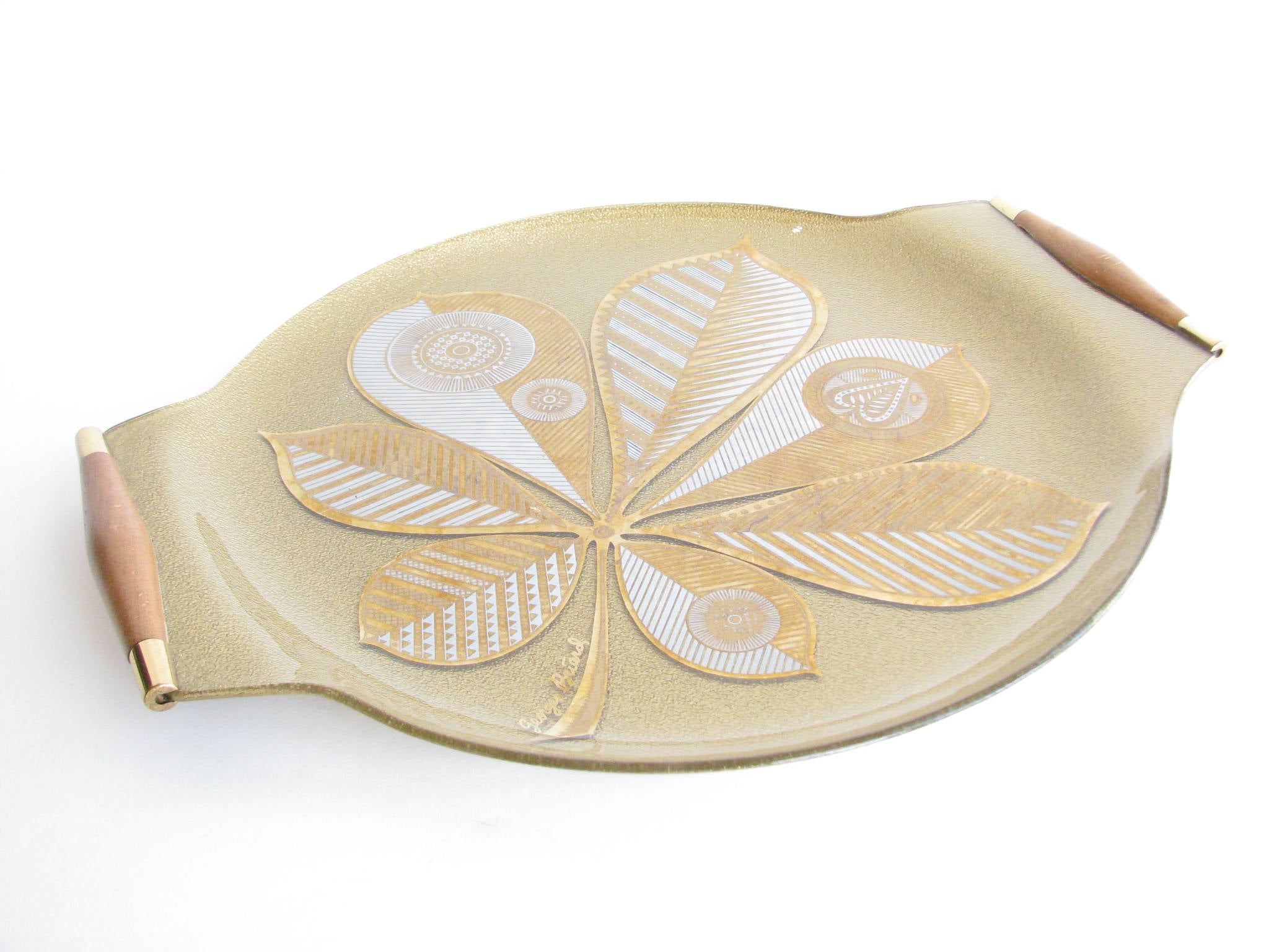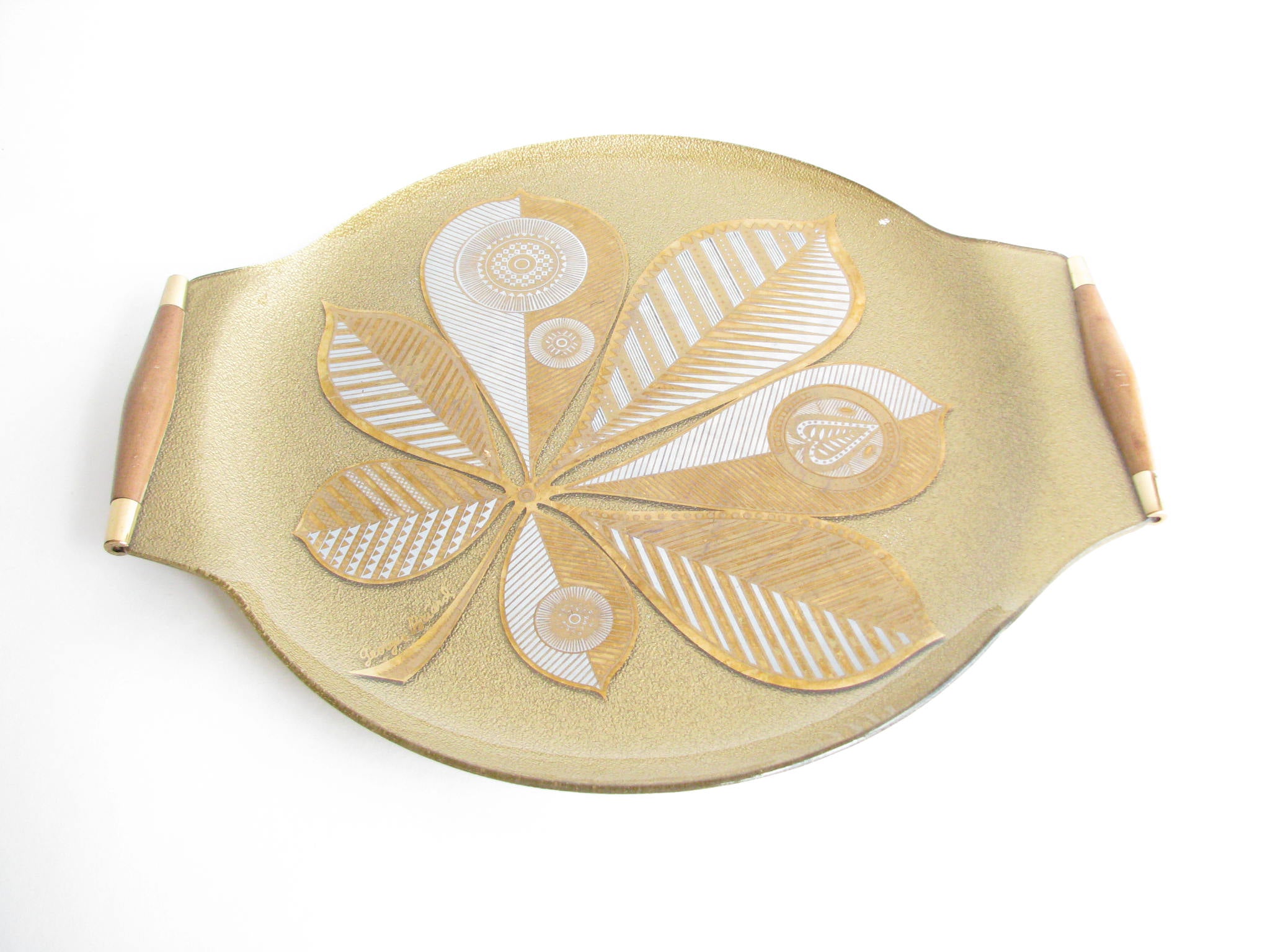 Lovely vintage Georges Briard Heritance round glass serving tray with gold leaf design and wood handles.