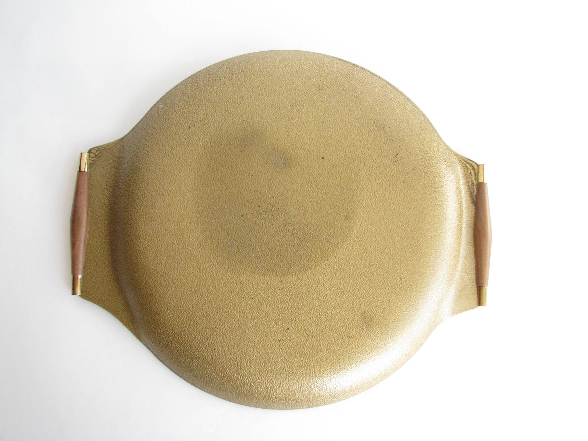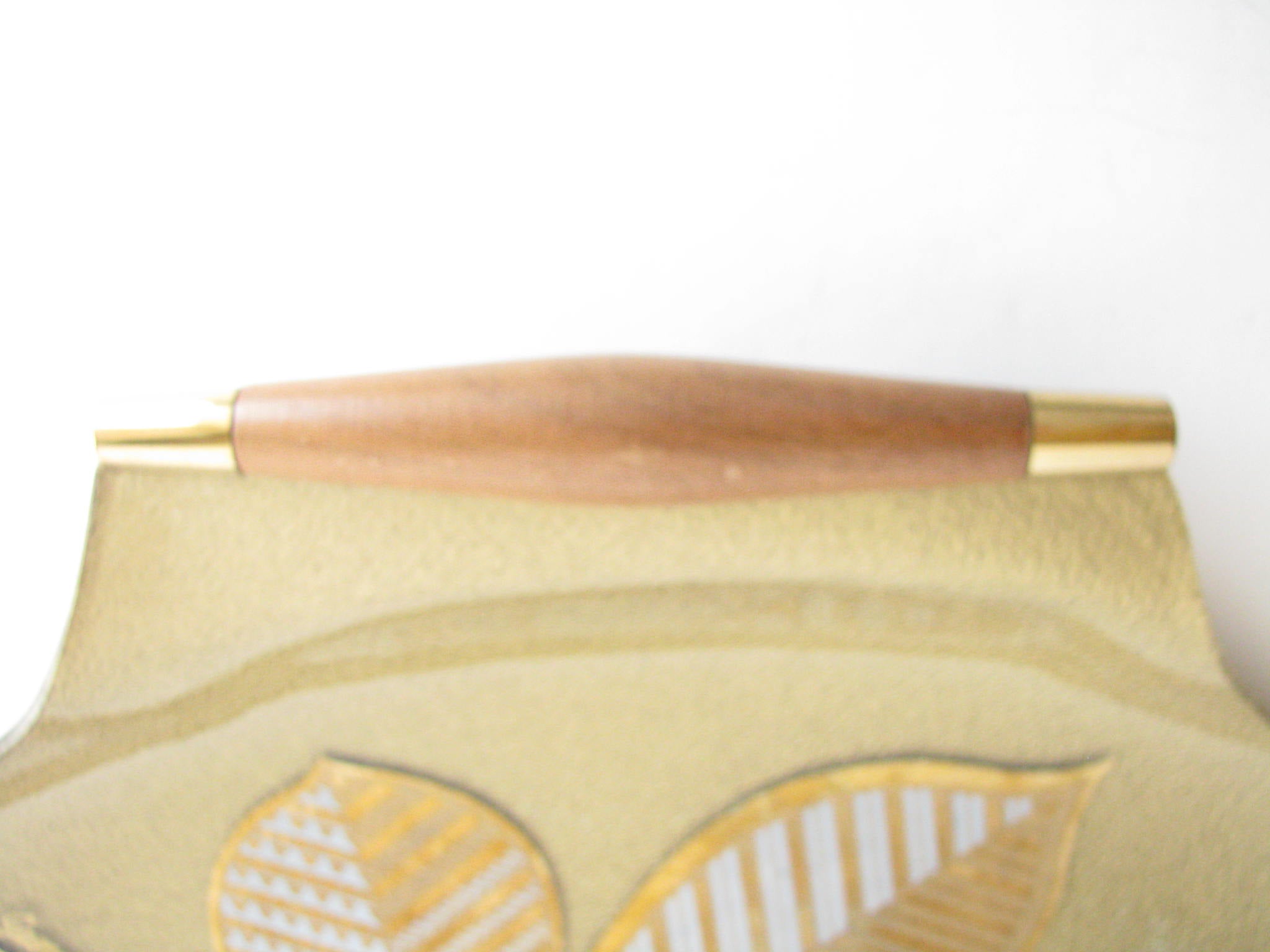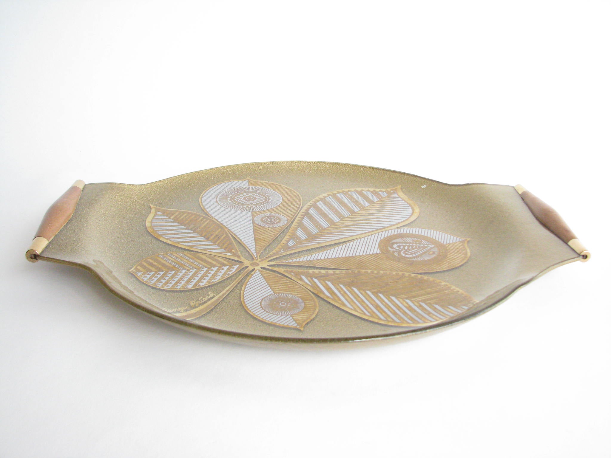 Lovely vintage Georges Briard Heritance round glass serving tray with gold leaf design and wood handles.