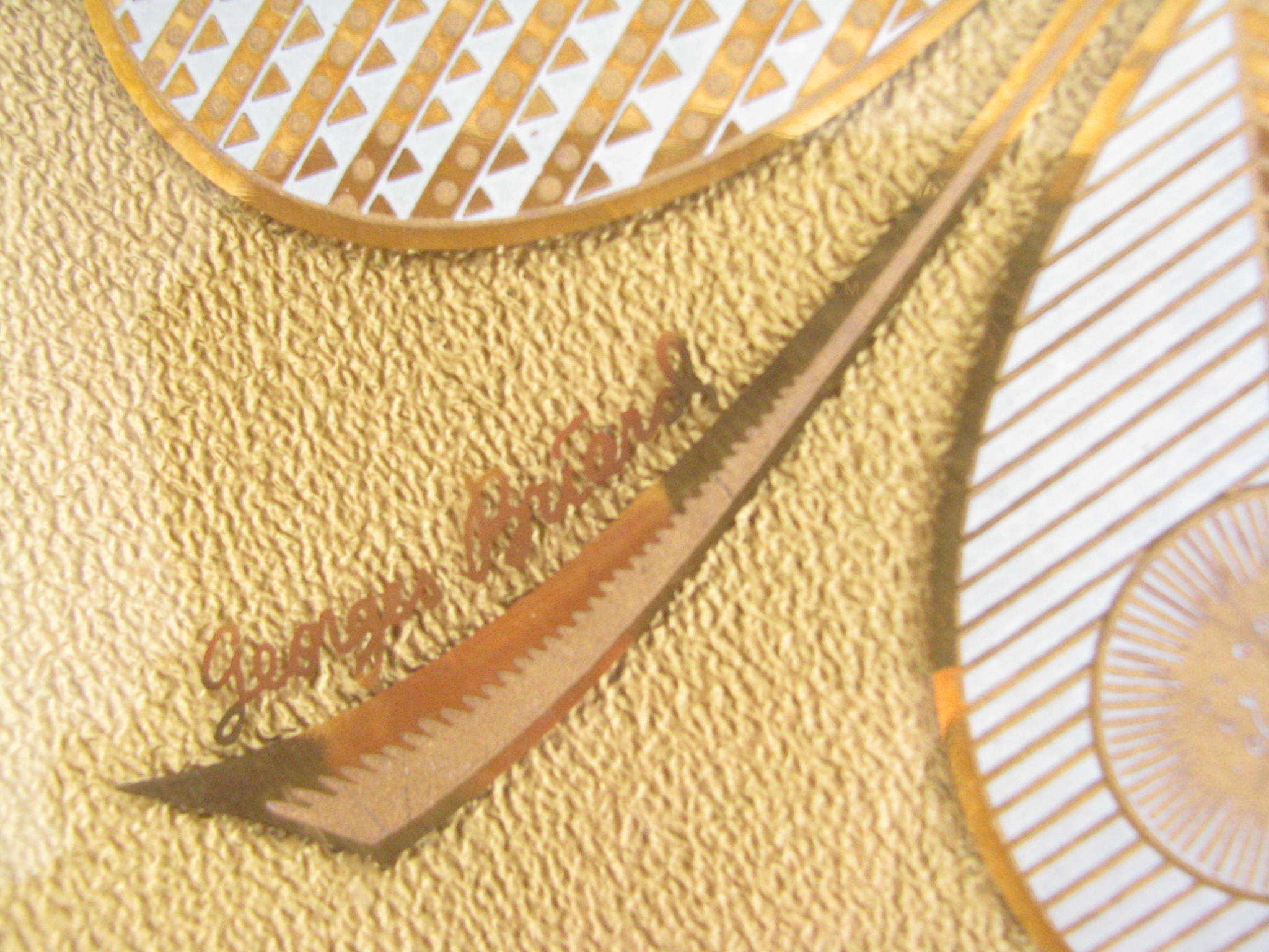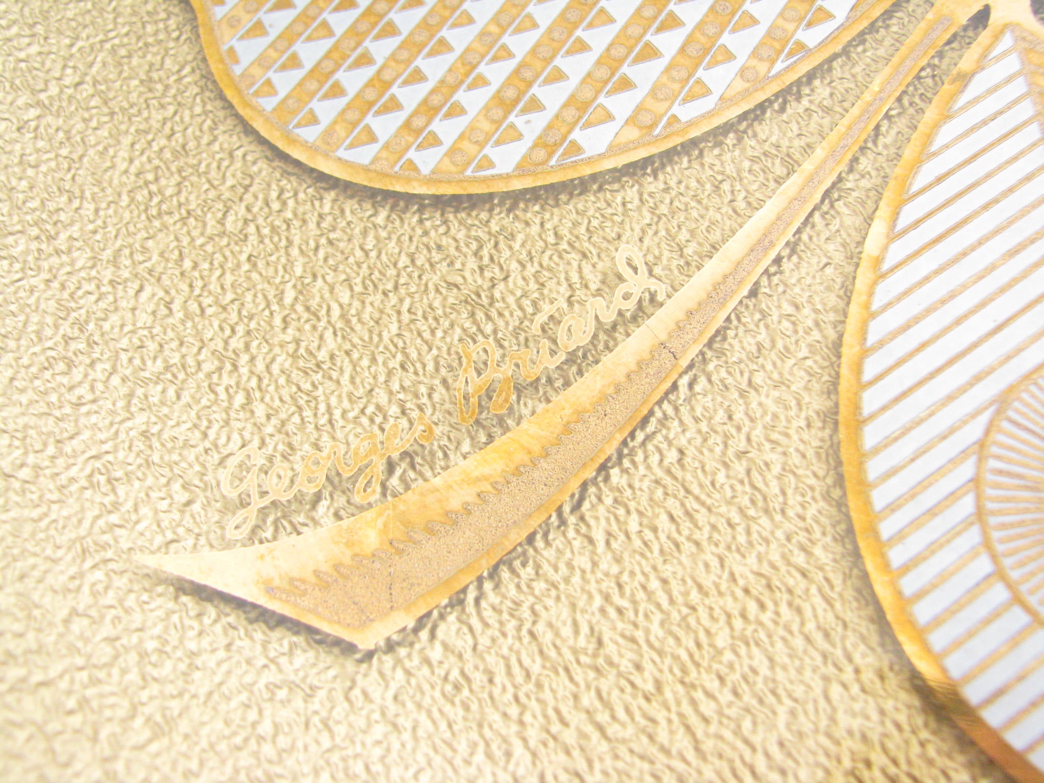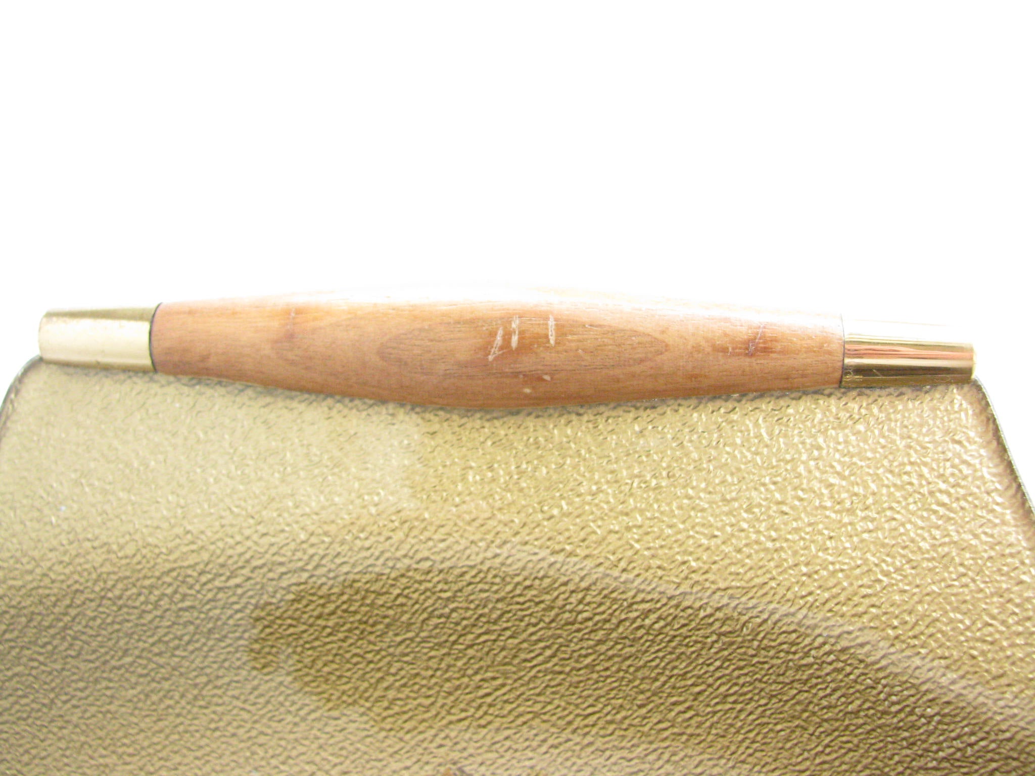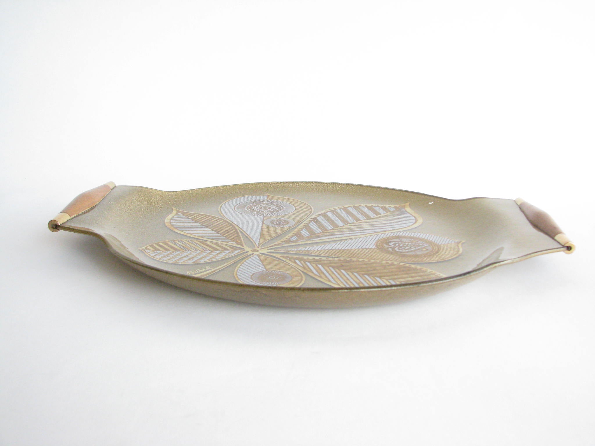 Lovely vintage Georges Briard Heritance round glass serving tray with gold leaf design and wood handles.