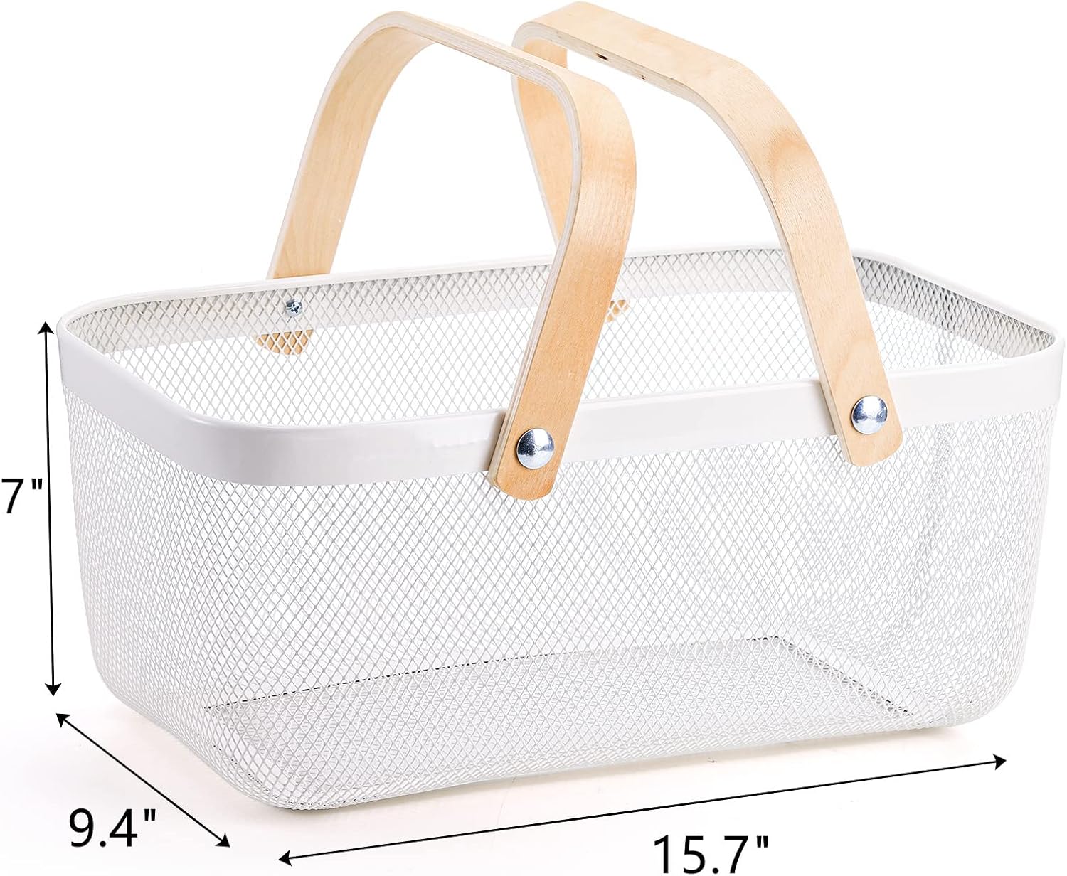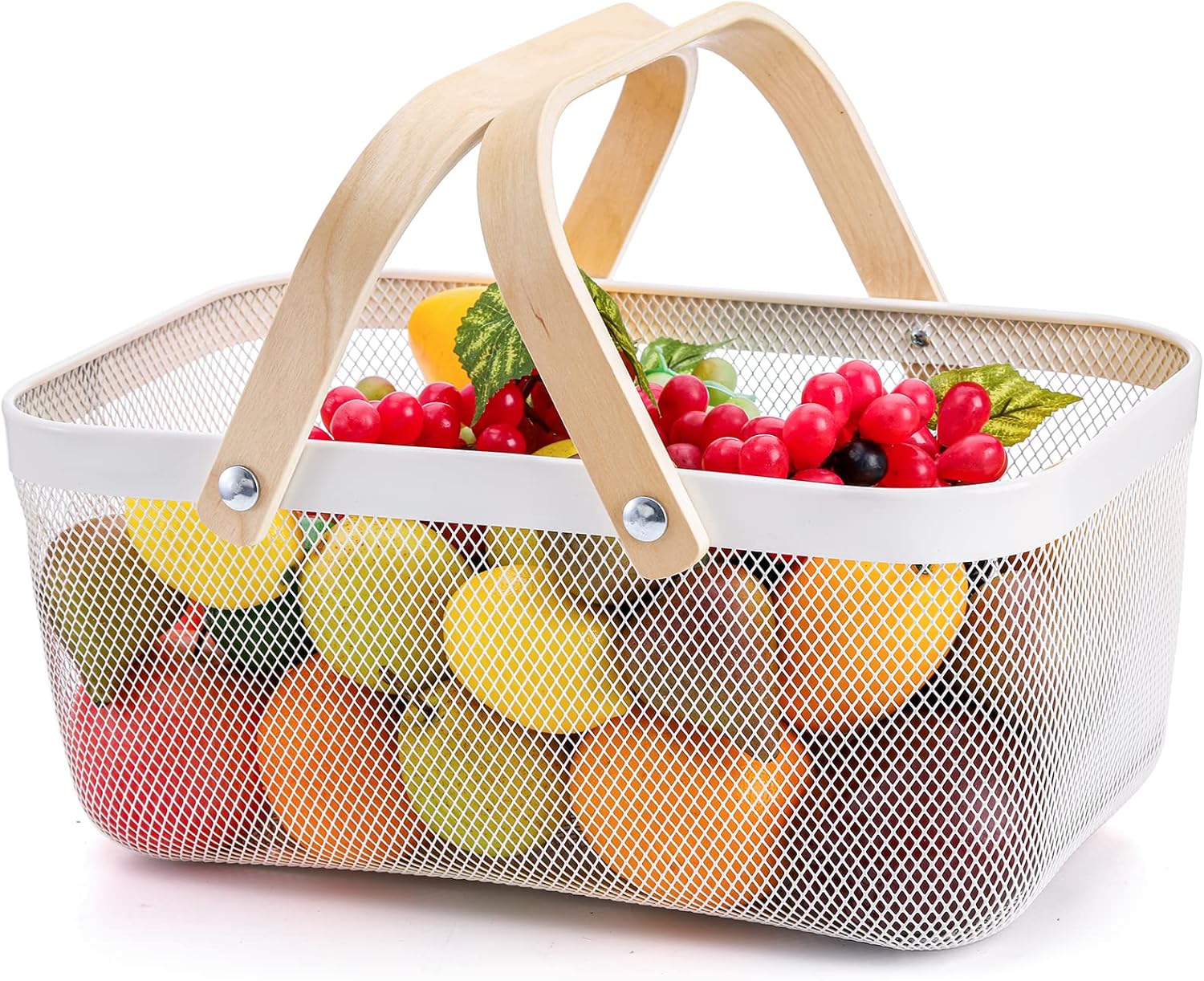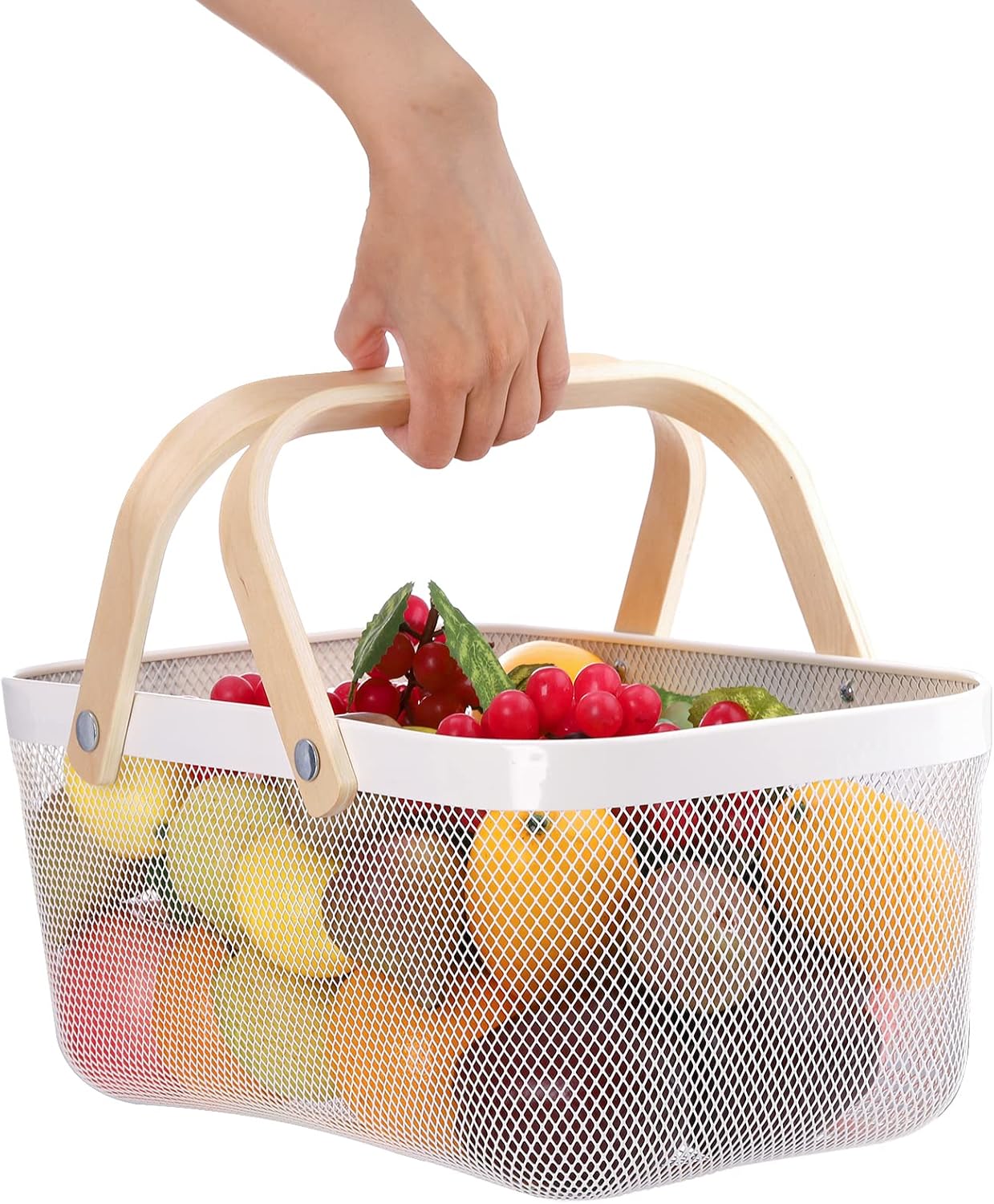 Stylish Design: The white mesh fruit basket bin with wood handle is a great helper to organize or decorate your kitchen, living room, dining room, also great for picnic, camping and shopping.
