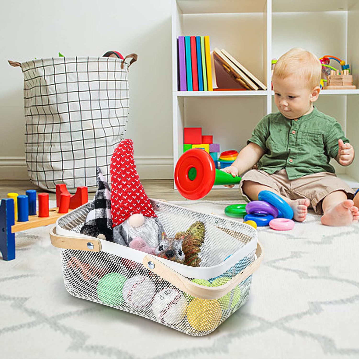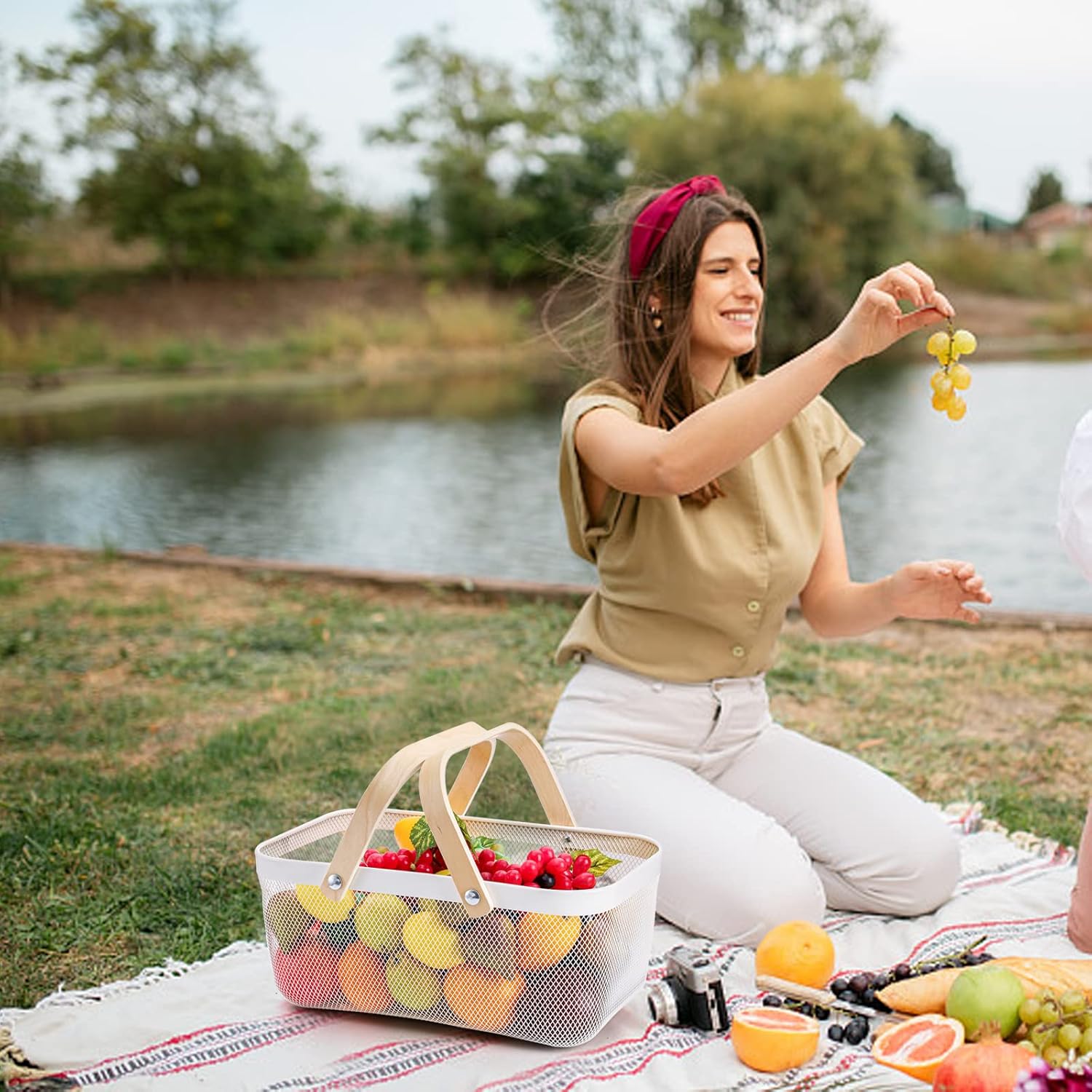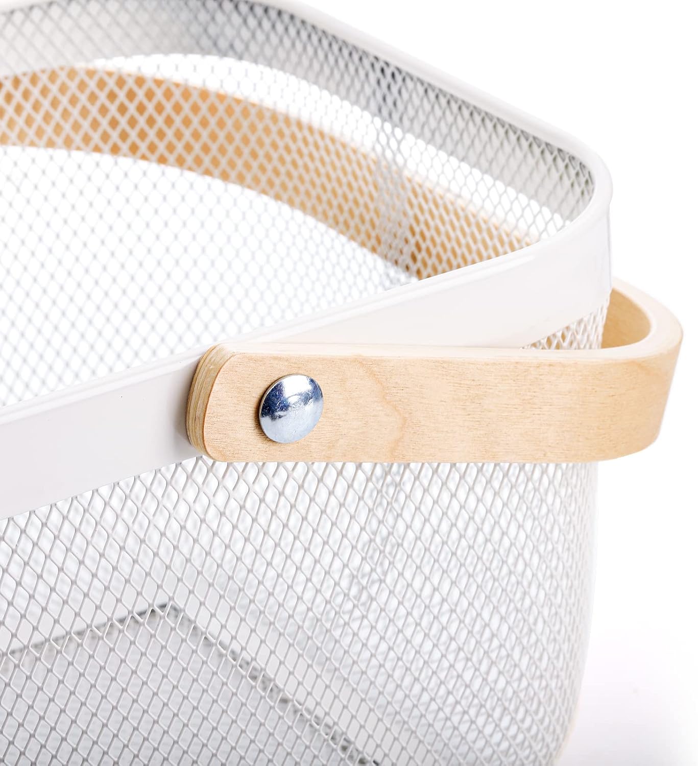 Stylish Design: The white mesh fruit basket bin with wood handle is a great helper to organize or decorate your kitchen, living room, dining room, also great for picnic, camping and shopping.