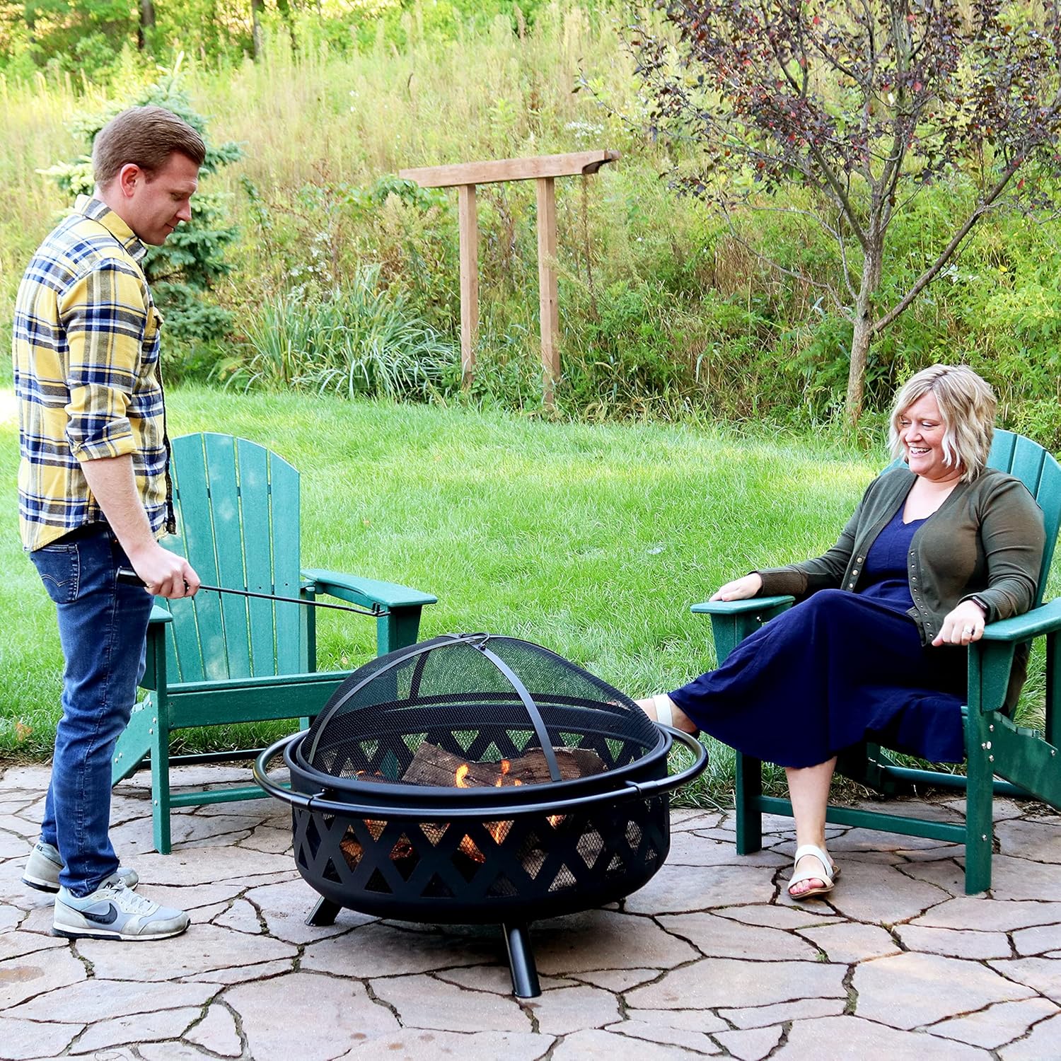 Spark containment and safety: The black crossweave wood fire pit set includes a metal spark screen for added safety from flying sparks, a weather-resistant round cover, a built-in wood-burning grate for better airflow, and a poker tool to easily control the flame.