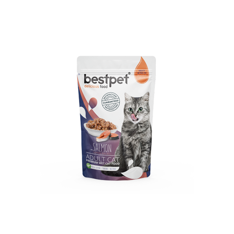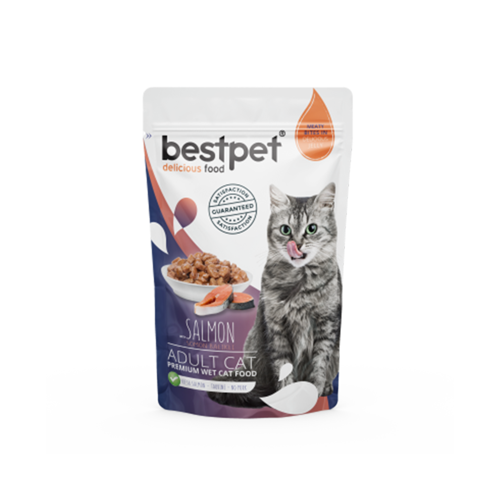 Grain-free wet food with salmon pieces in jelly with a flavor that will enchant cats. Your cat will first lick the jelly without looking up, and then eat the grains one by one with appetite and pleasure. Suitable for all cats 1 year and older.