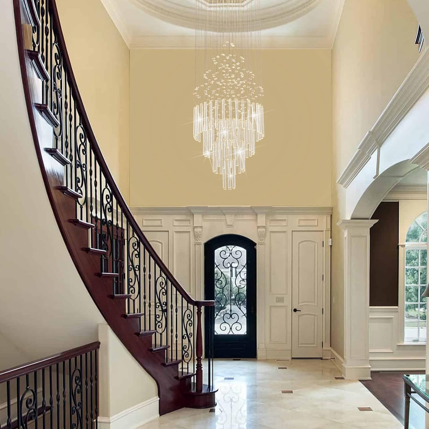 💡Clear Installation Struction - long chandeliers for high ceilings comes with installation instruction, completely assembled require patience, recommeded install with professional electrician. Once complete installation, you will be surprised with the stunning crystal high ceiling light fixture. Crystal raindrop chandelier add elegance and noble ambiance to your stairwell entryway passageway foyer and house with high ceilings.