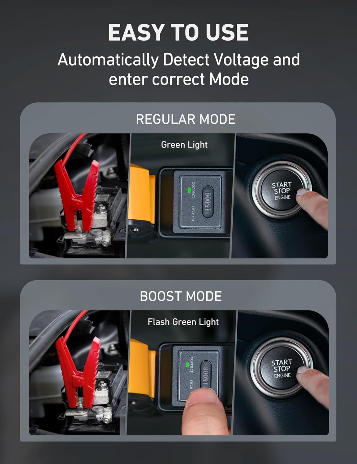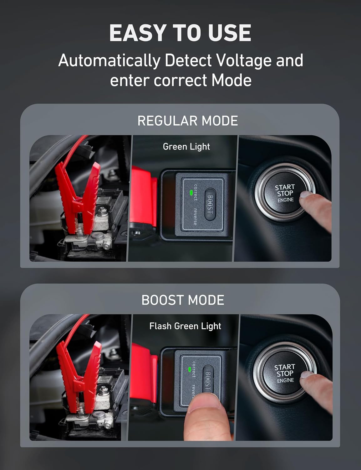 ULTRA POWERFUL BOOST - The smart boost mode automatically detects the battery's voltage. When the voltage is less than 9 V, the indicator flashes green; this unlocks the "BOOST" button, which can be pressed to start fully-drained batteries.
