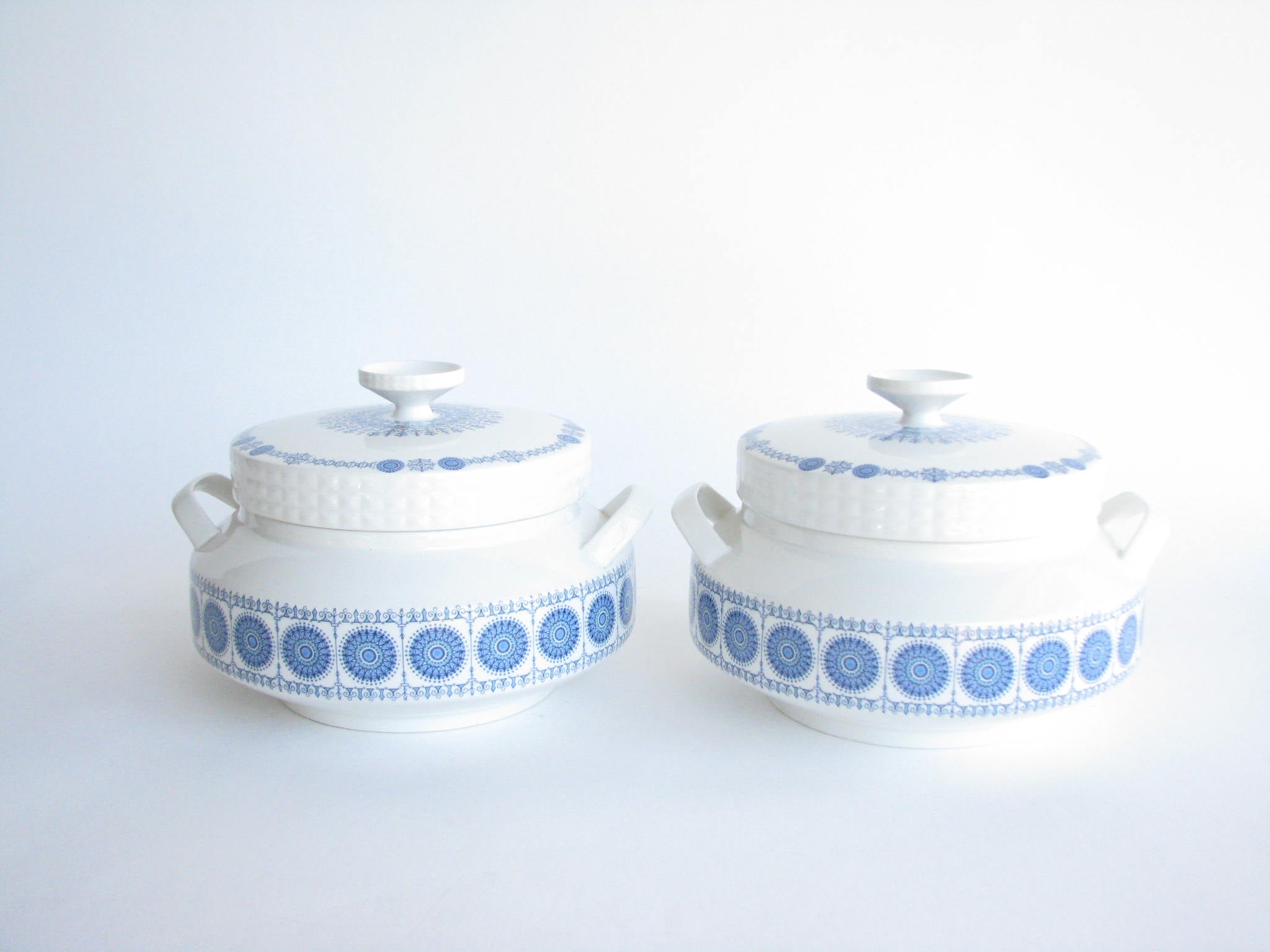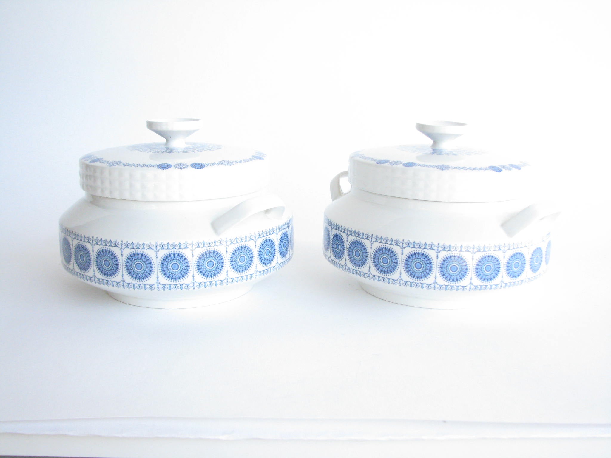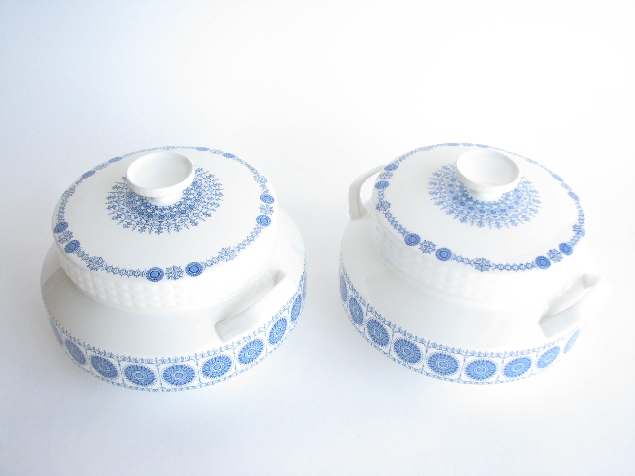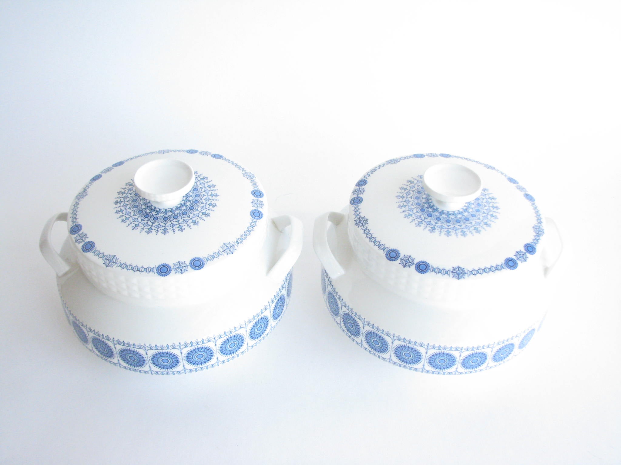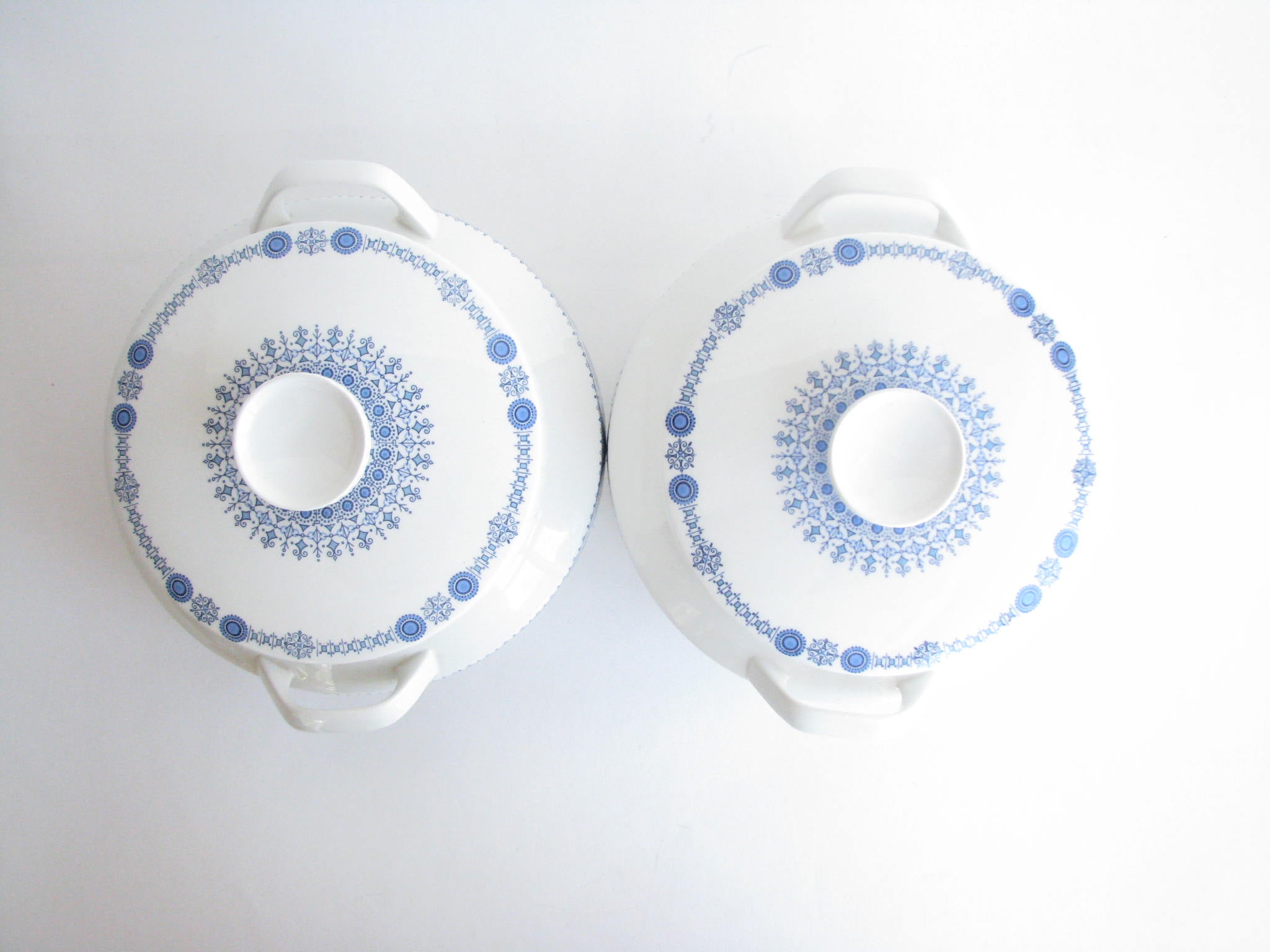 Set of 2 1960s Pontesa Castillian Collection Granada ironstone lidded vegetable / serving dishes. Beautiful blue and white medallion design.
