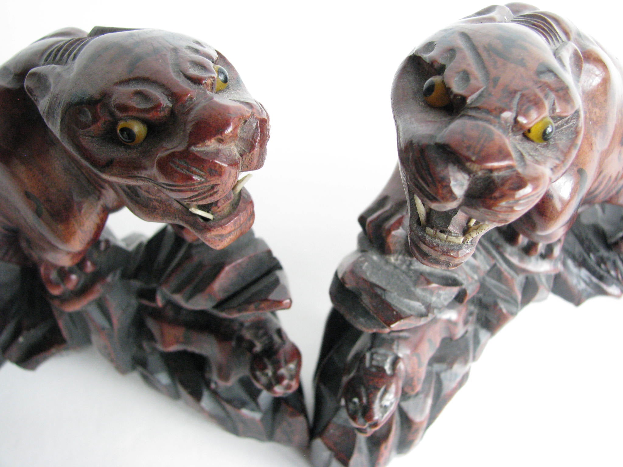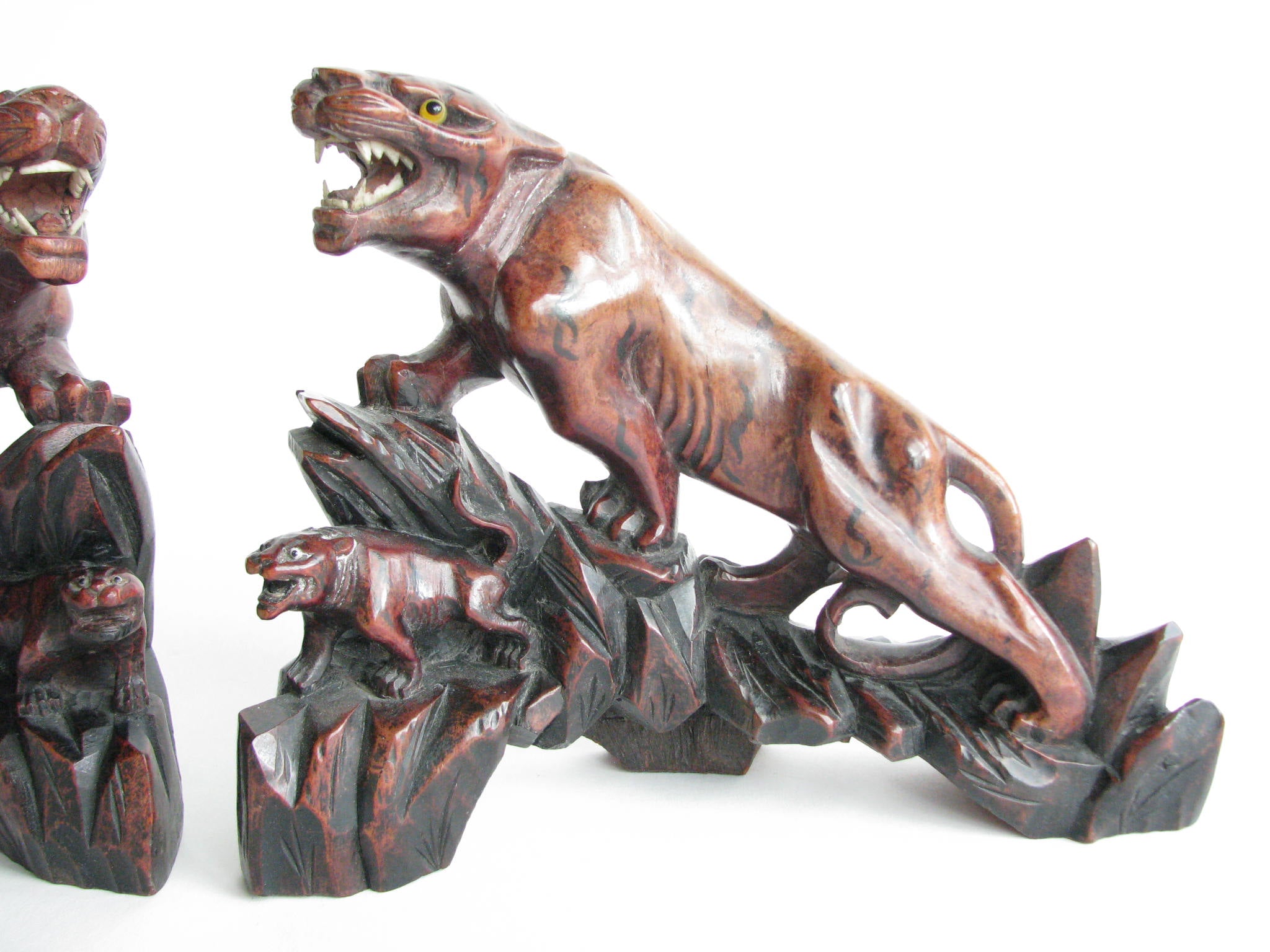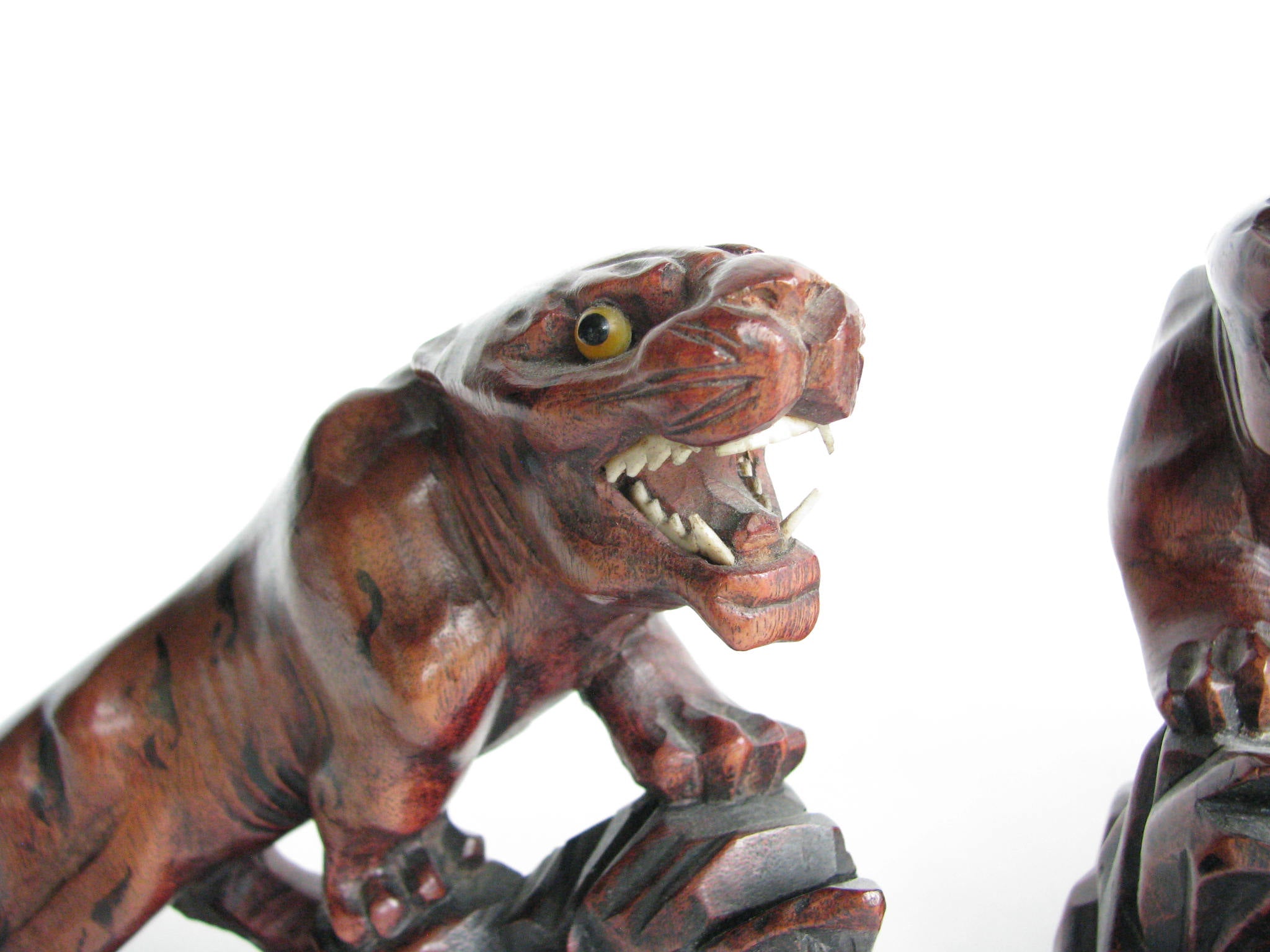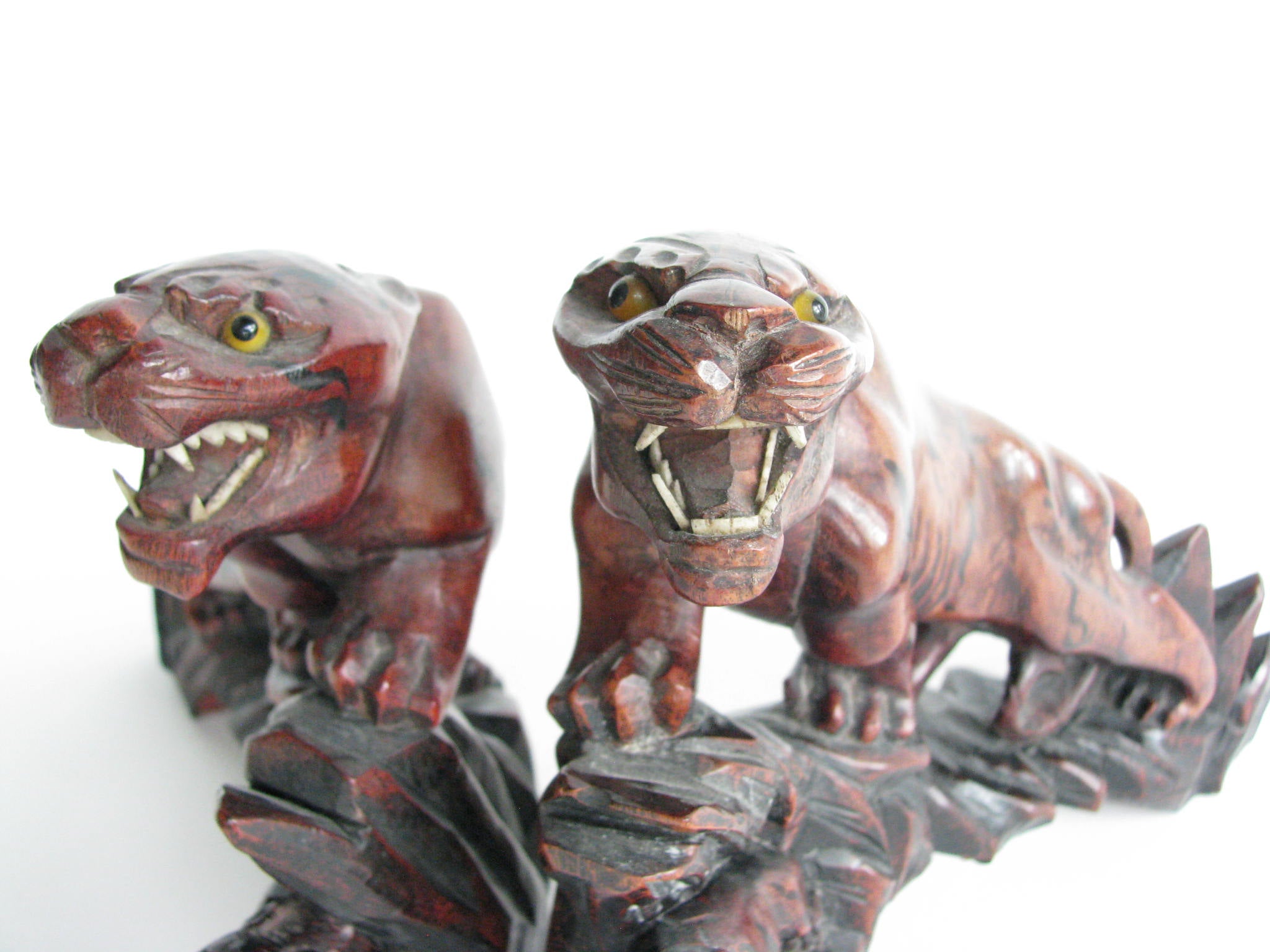Antique pair of hand-carved rosewood tigers featuring glass eyes (on both adults and cubs).