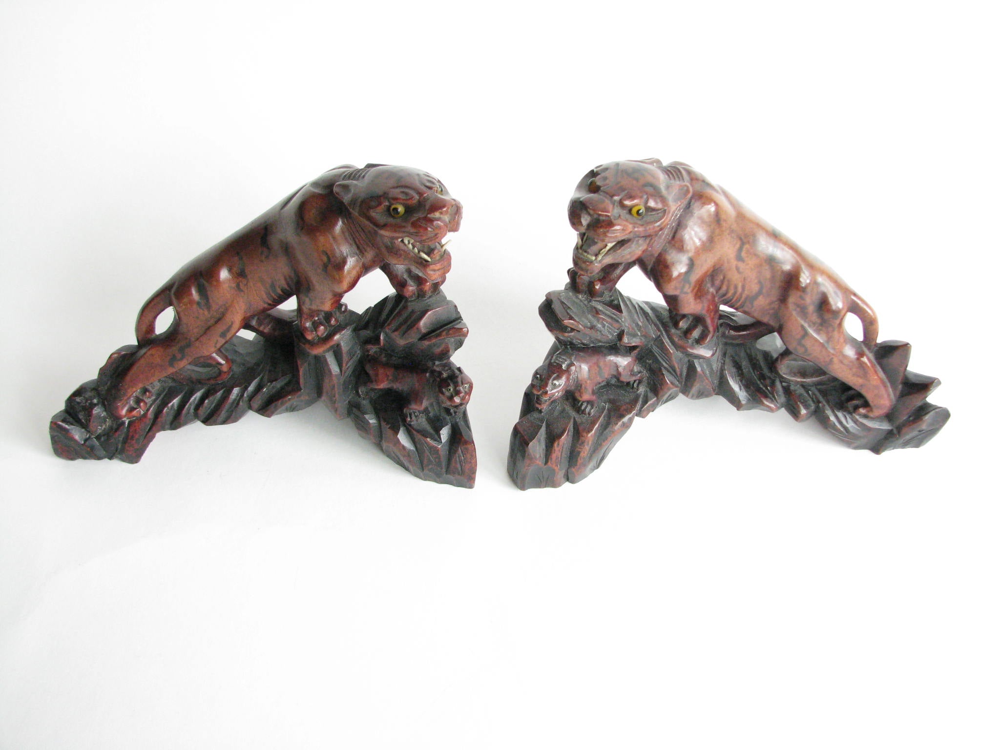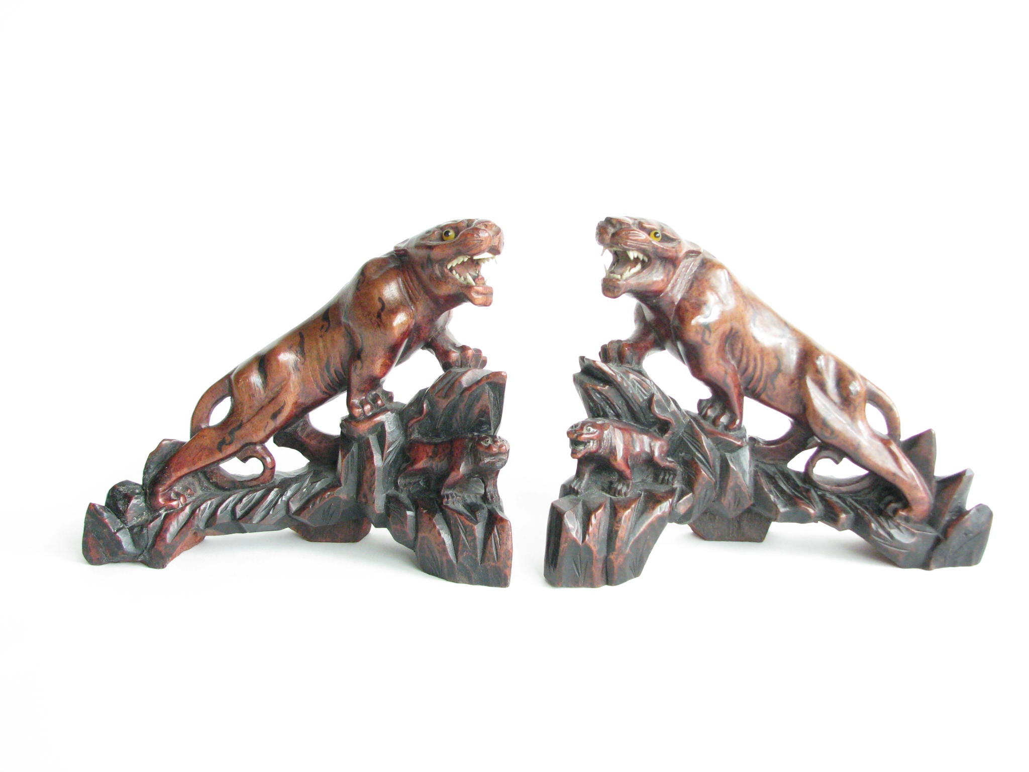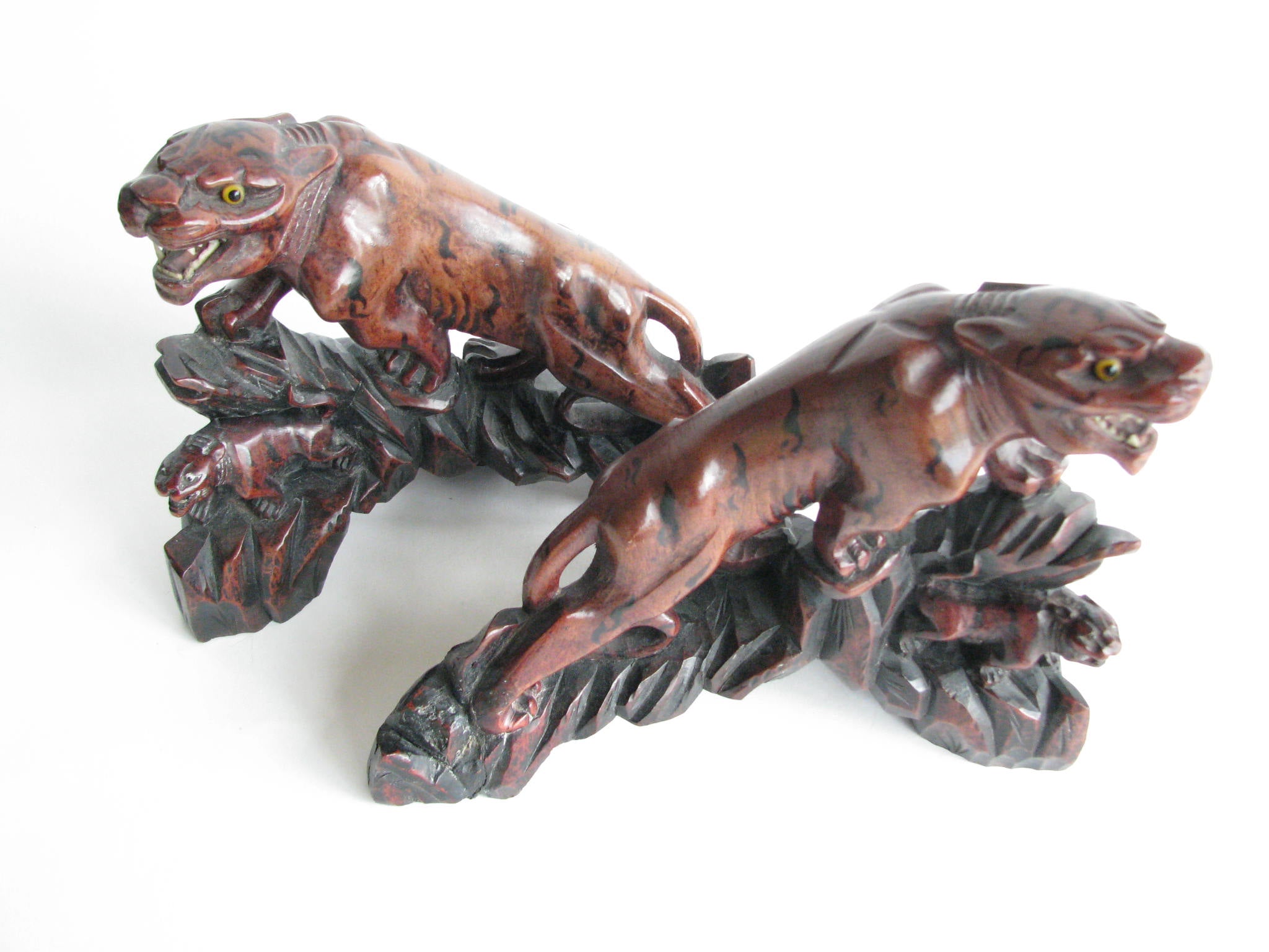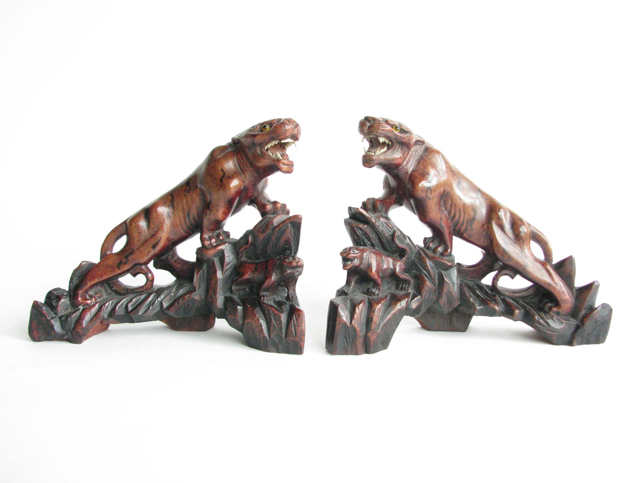 Antique pair of hand-carved rosewood tigers featuring glass eyes (on both adults and cubs).