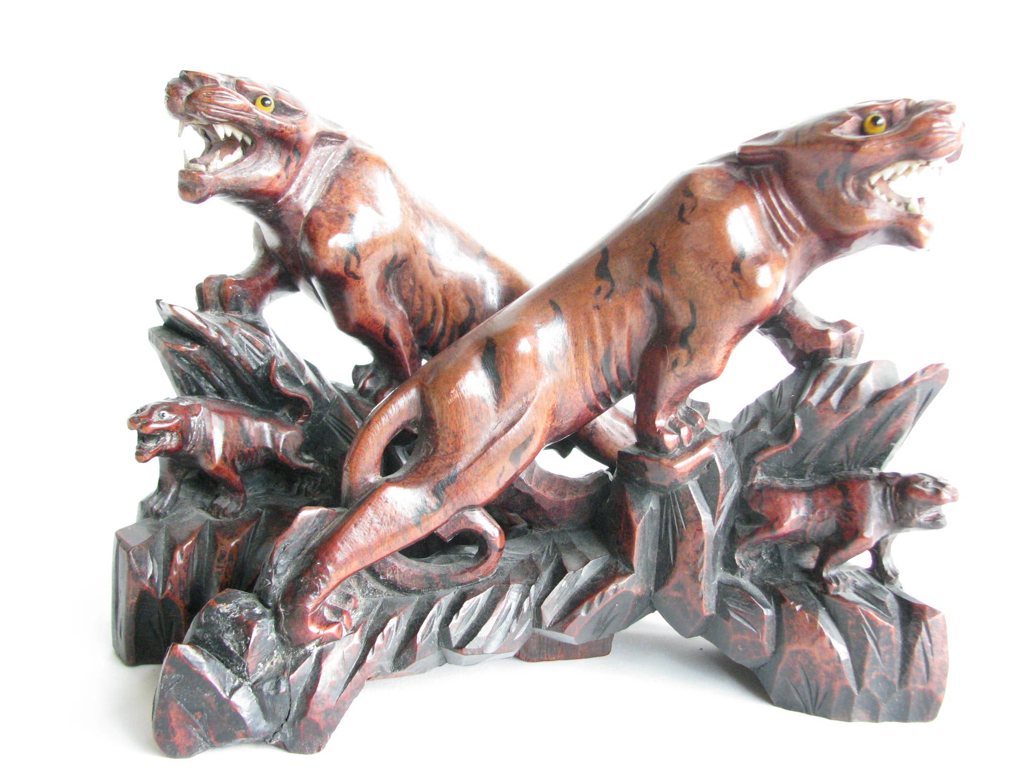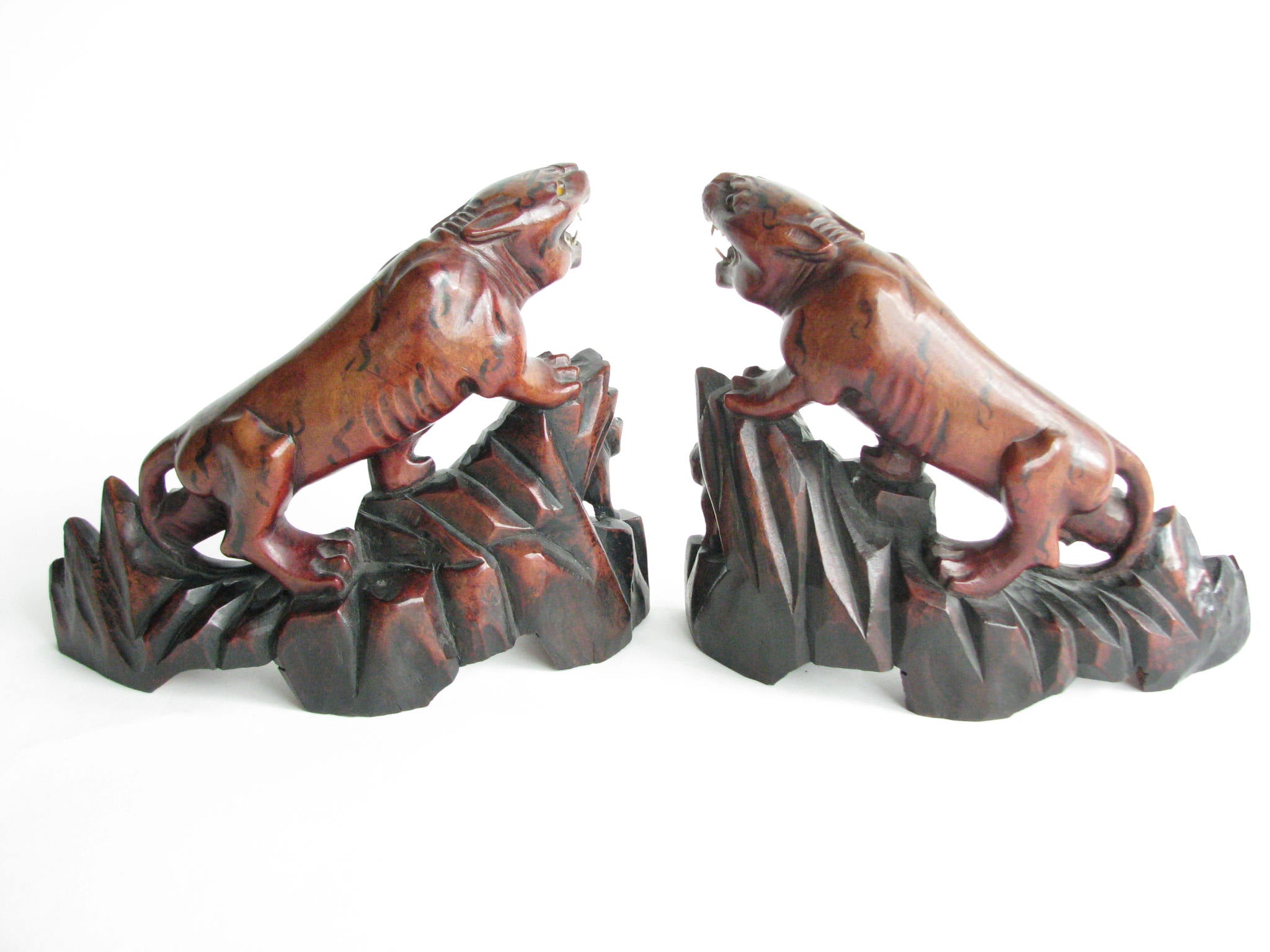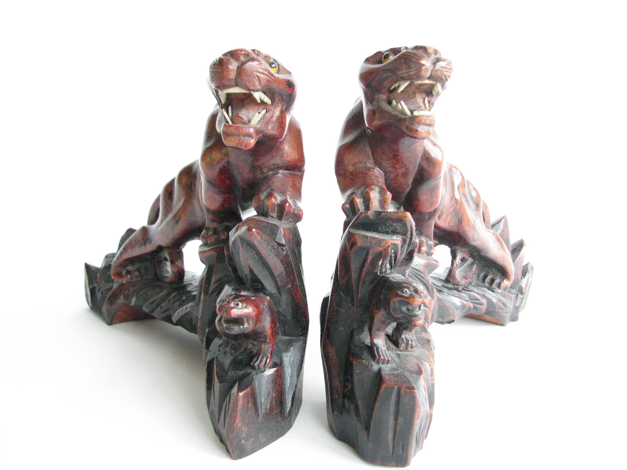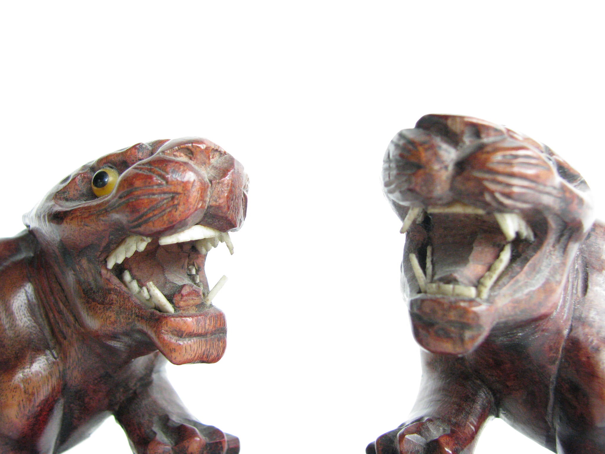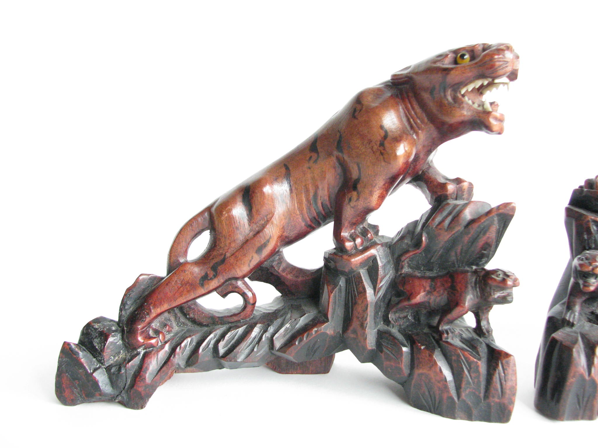 Antique pair of hand-carved rosewood tigers featuring glass eyes (on both adults and cubs).
