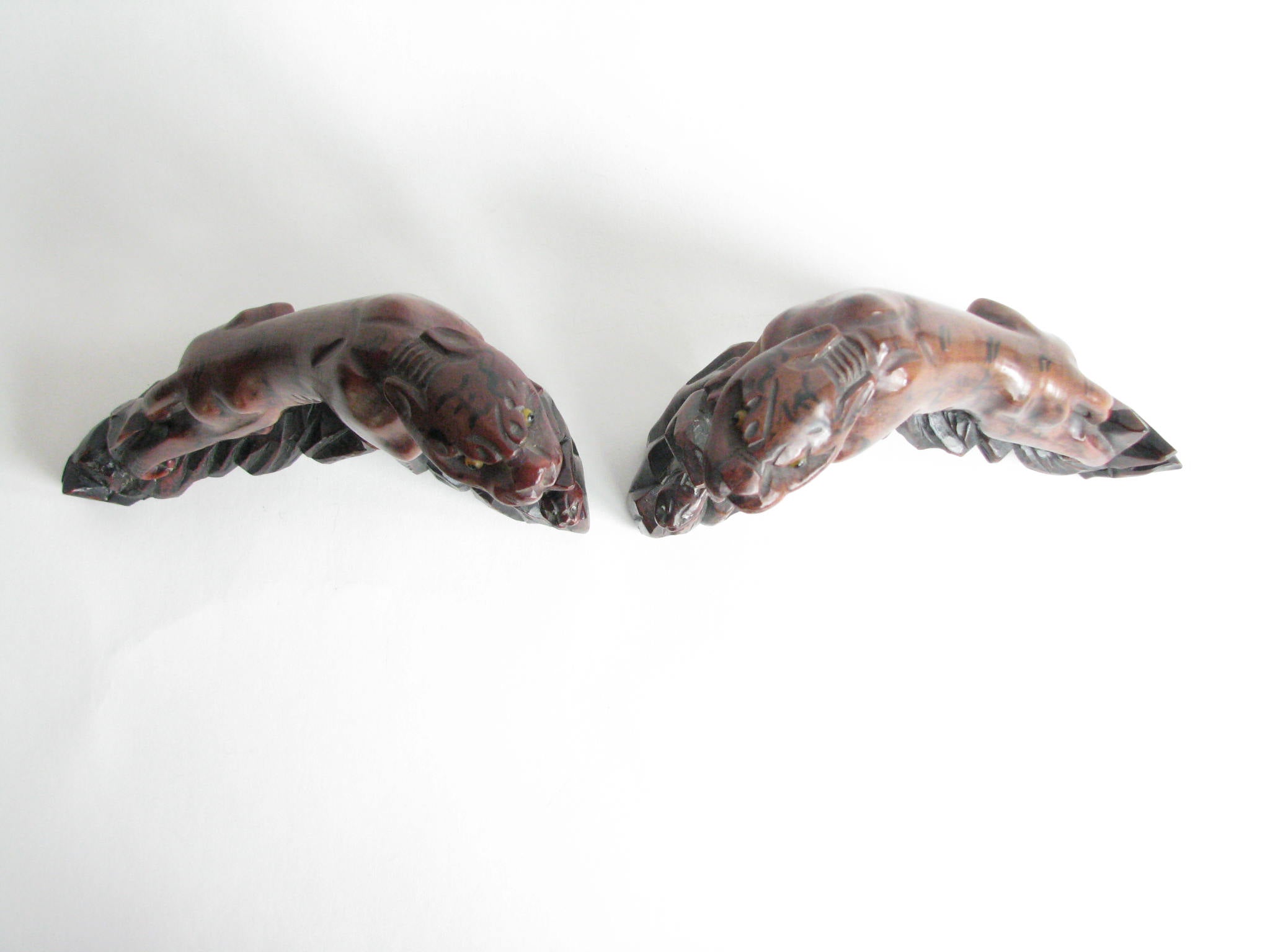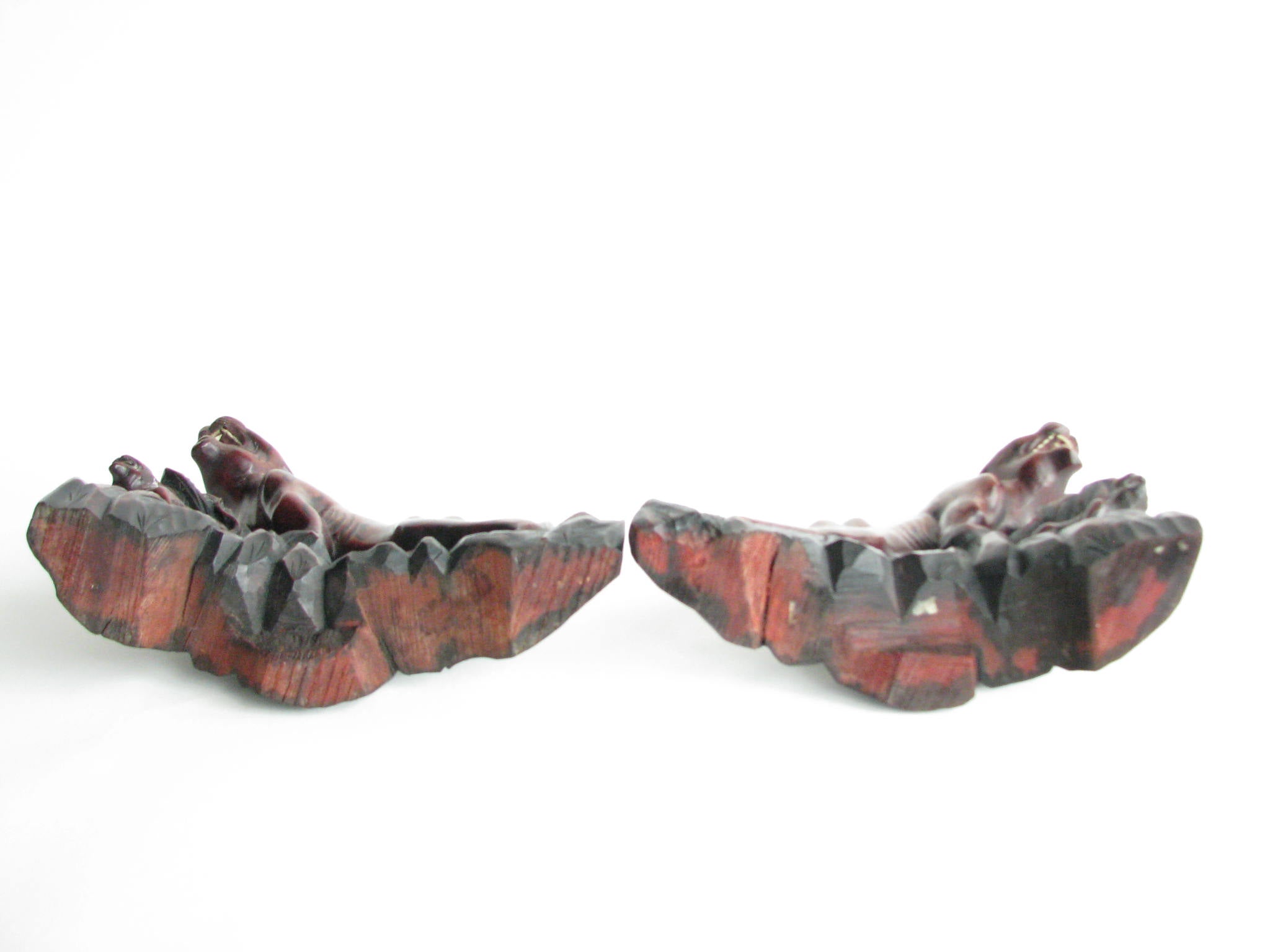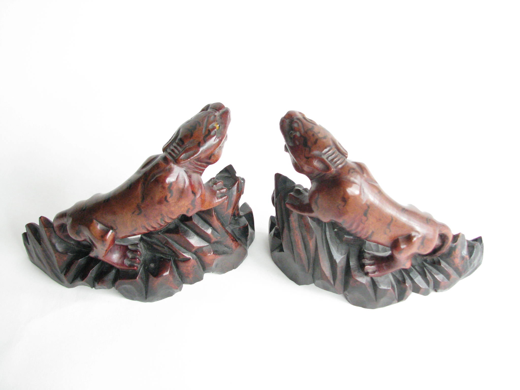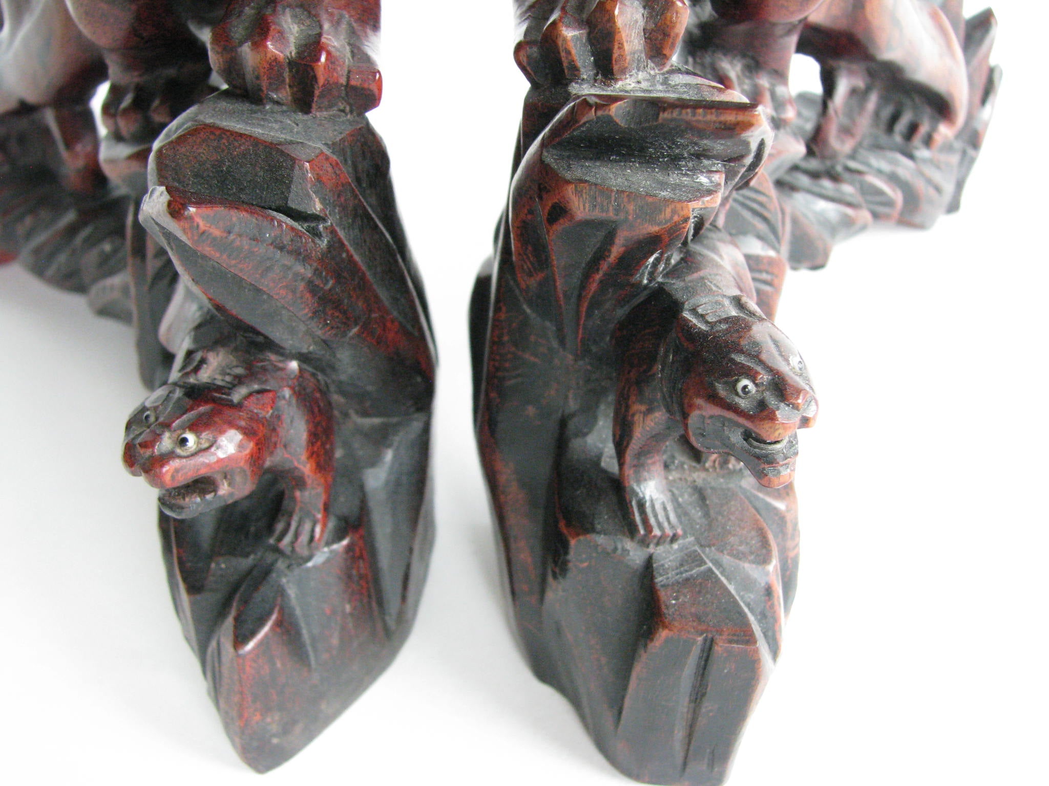 Antique pair of hand-carved rosewood tigers featuring glass eyes (on both adults and cubs).