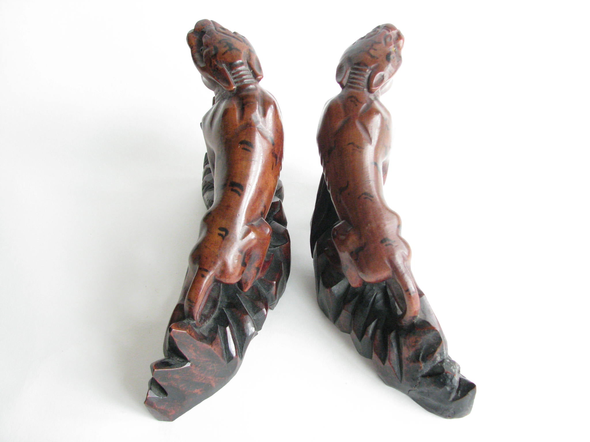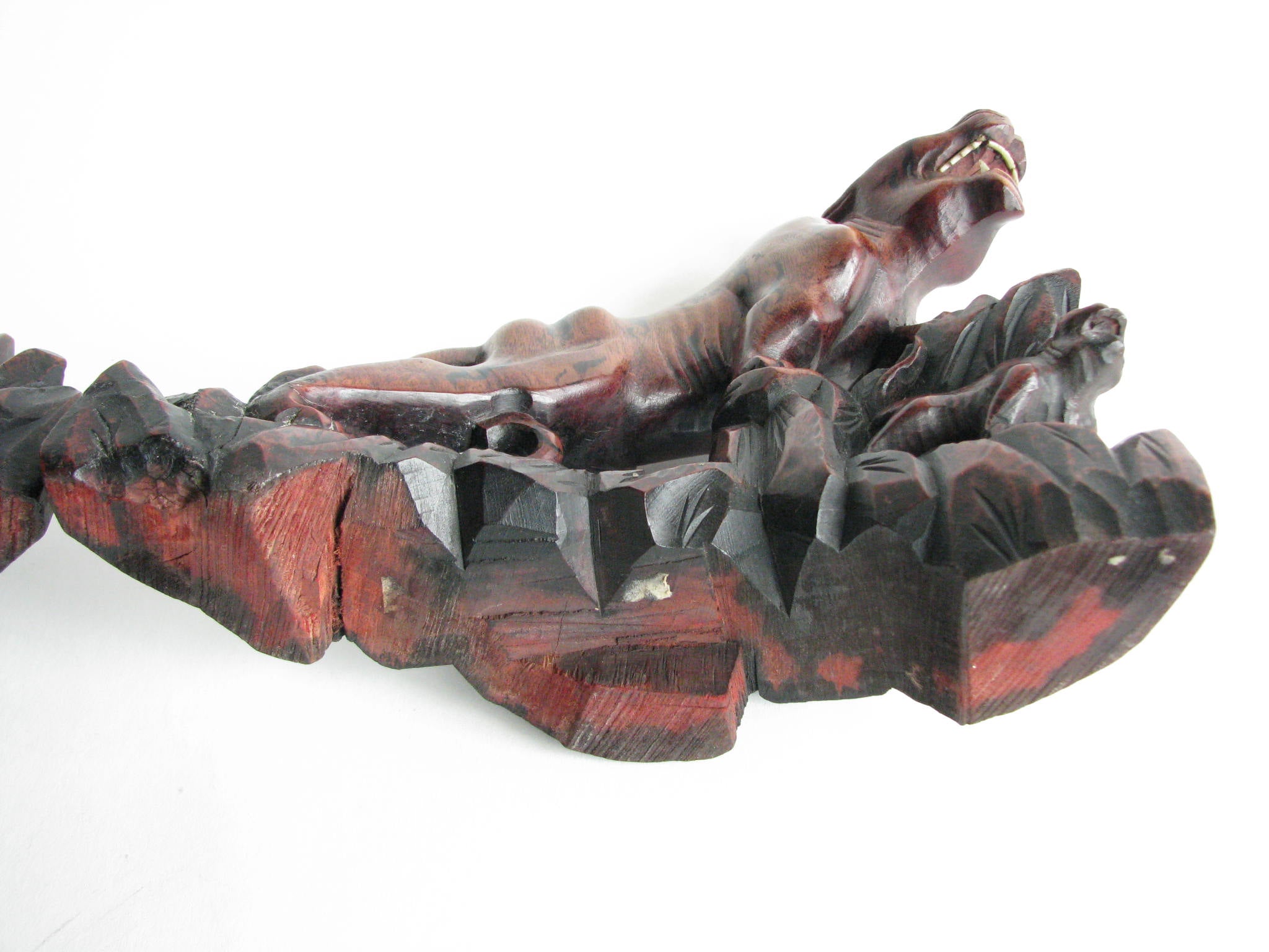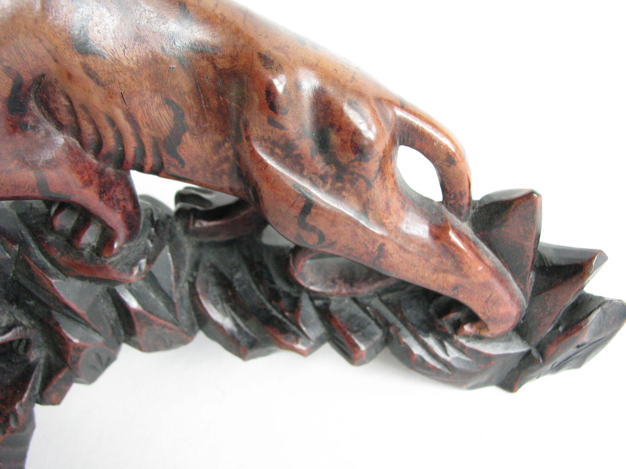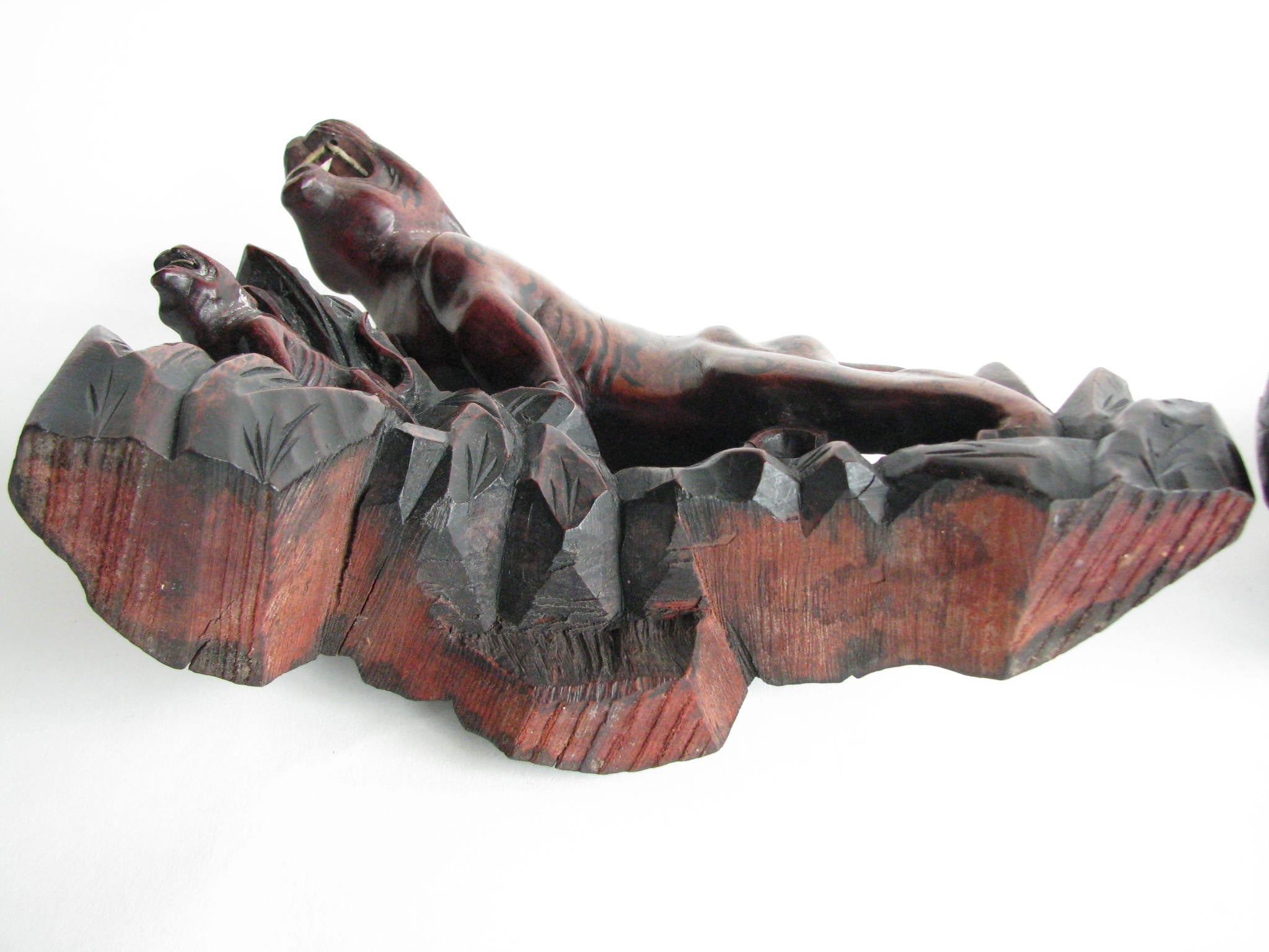 Antique pair of hand-carved rosewood tigers featuring glass eyes (on both adults and cubs).
