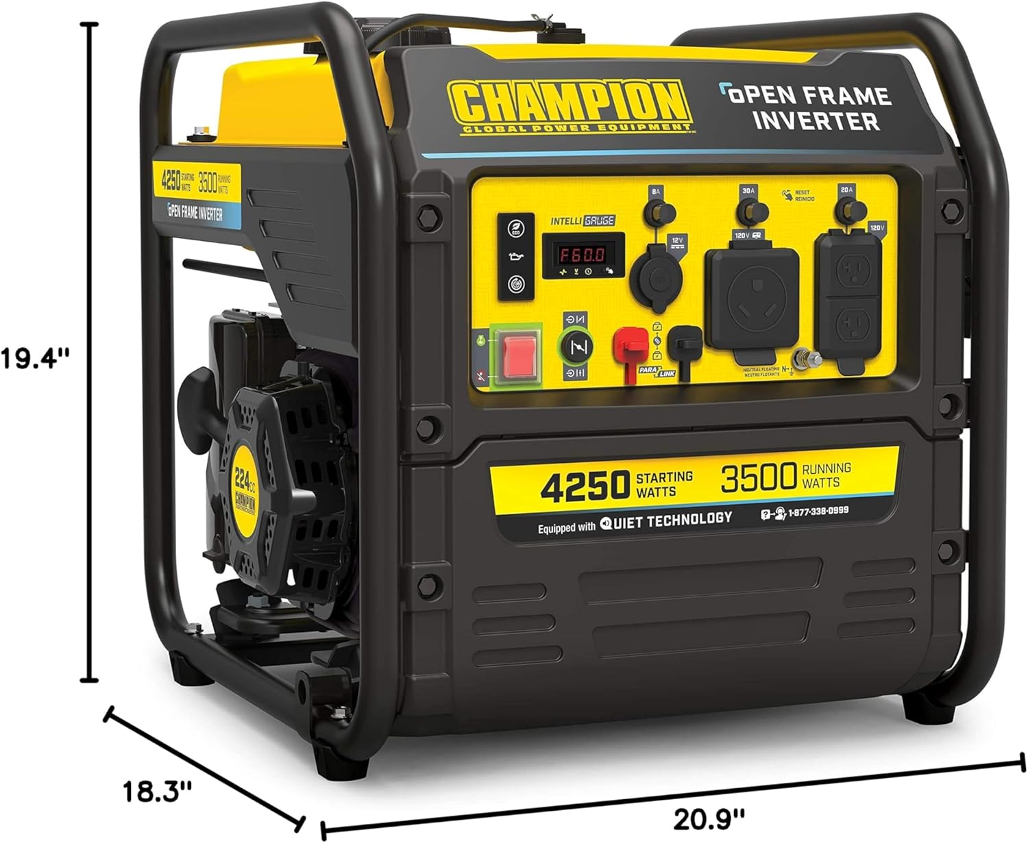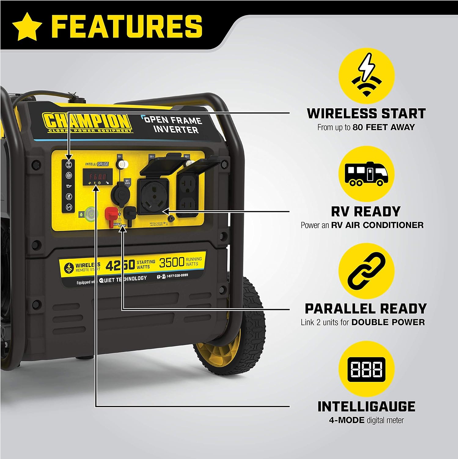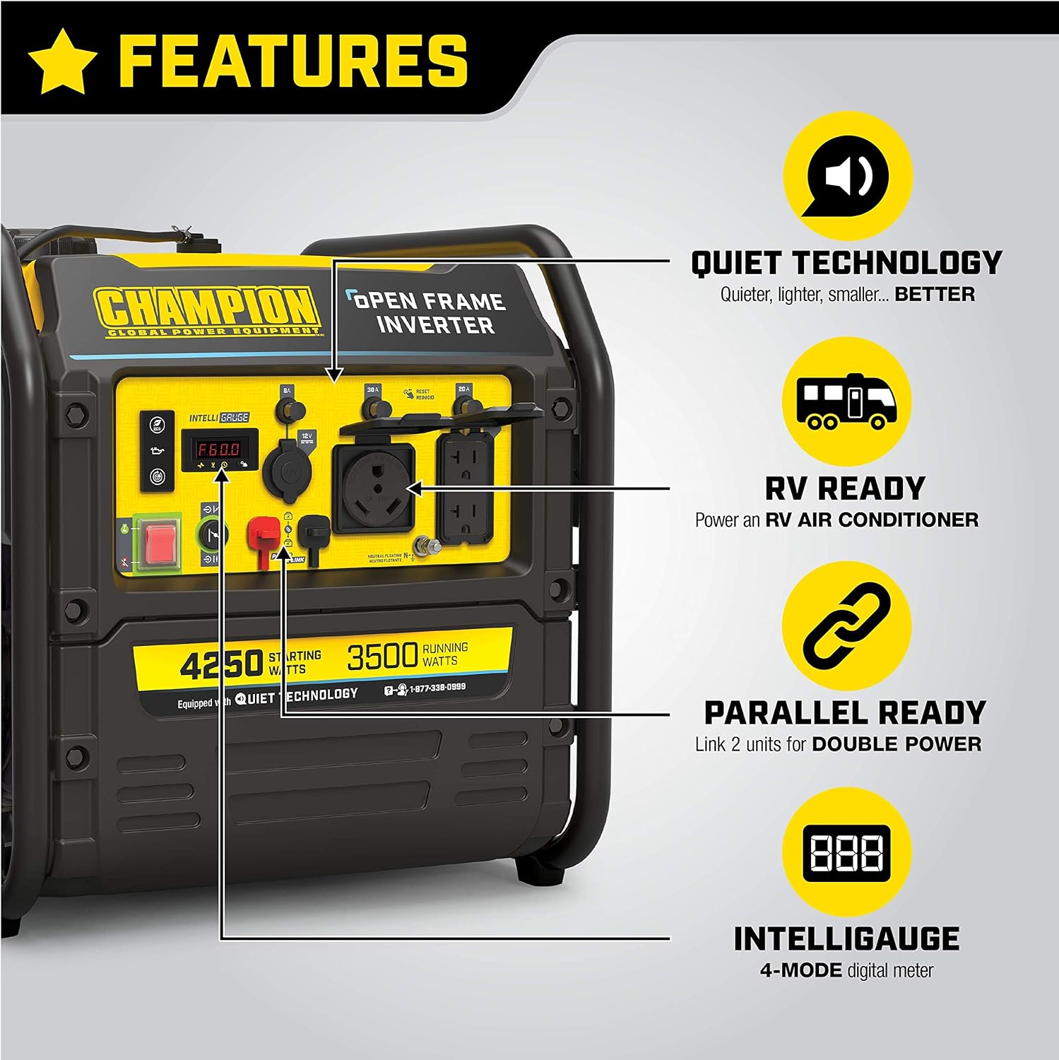 QUIET TECHNOLOGY AND EXTENDED RUN TIME: 64 dBA is great for RVs, tailgating, your next project or home backup