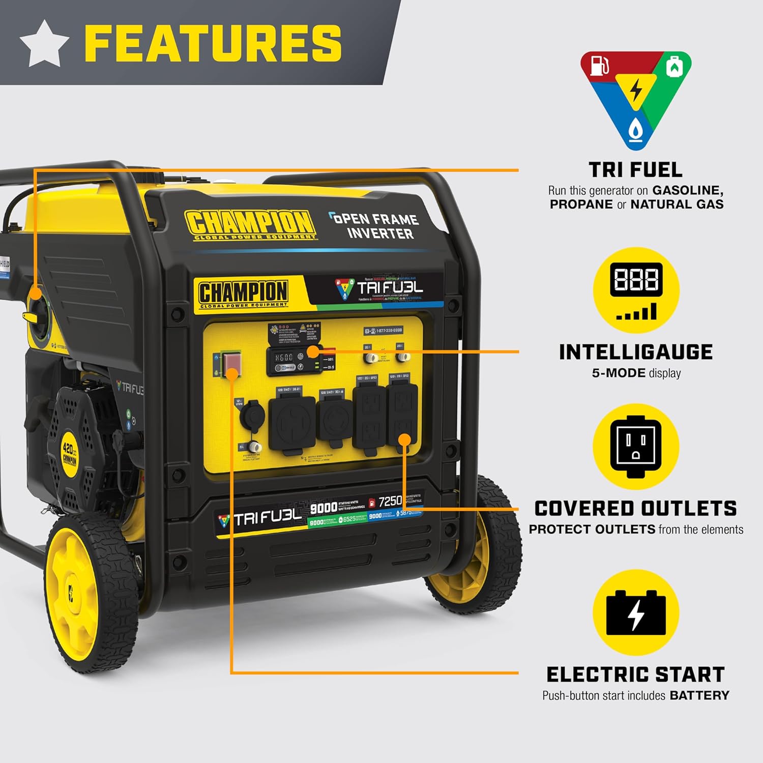 ADVANCED DESIGN: 50% quieter and 20% lighter than a traditional generator, plus Economy Mode saves fuel and extends engine life, and Intelligauge monitors voltage, frequency and operating hours.Wheels : No. Engine Speed : variable.